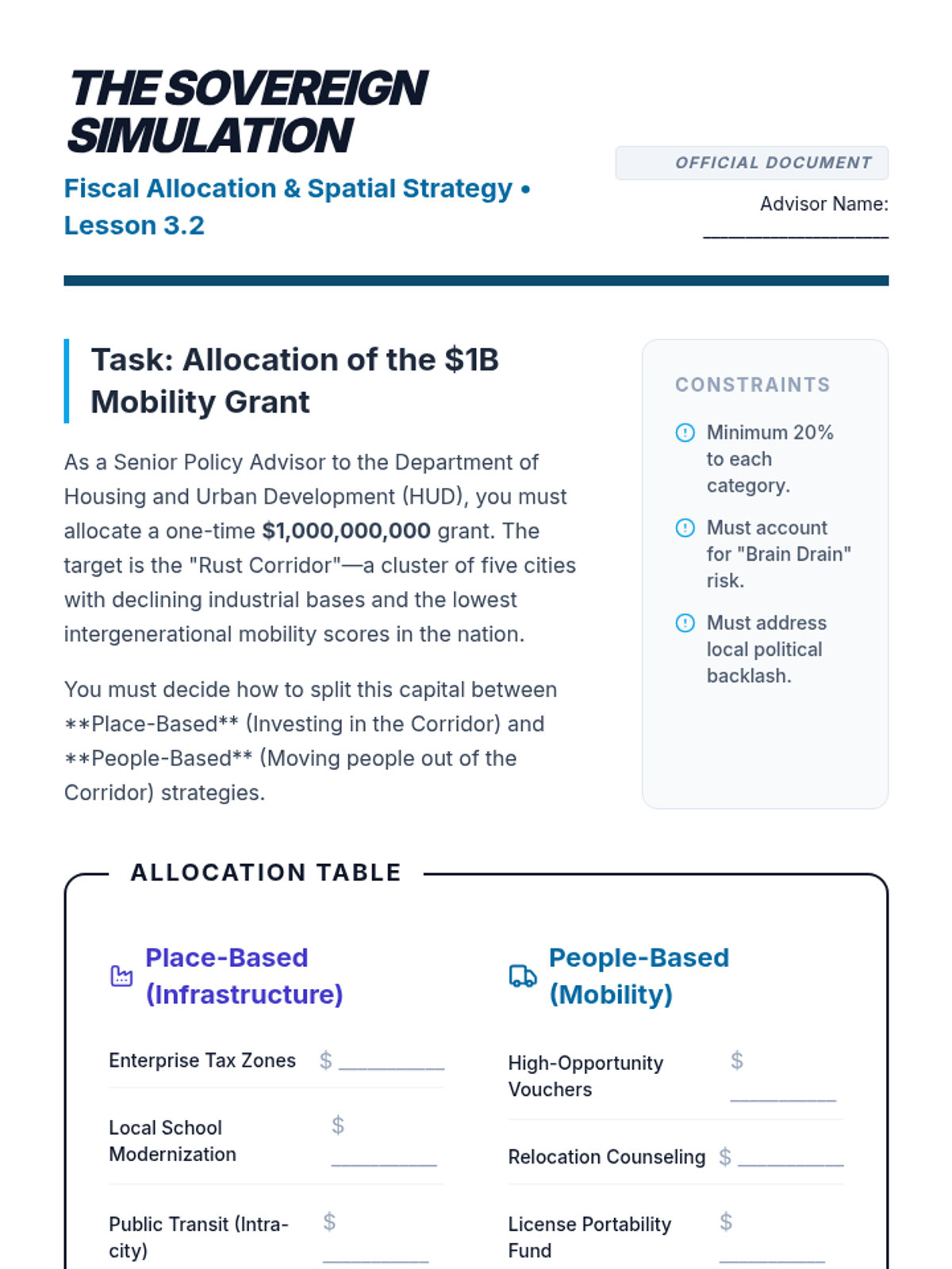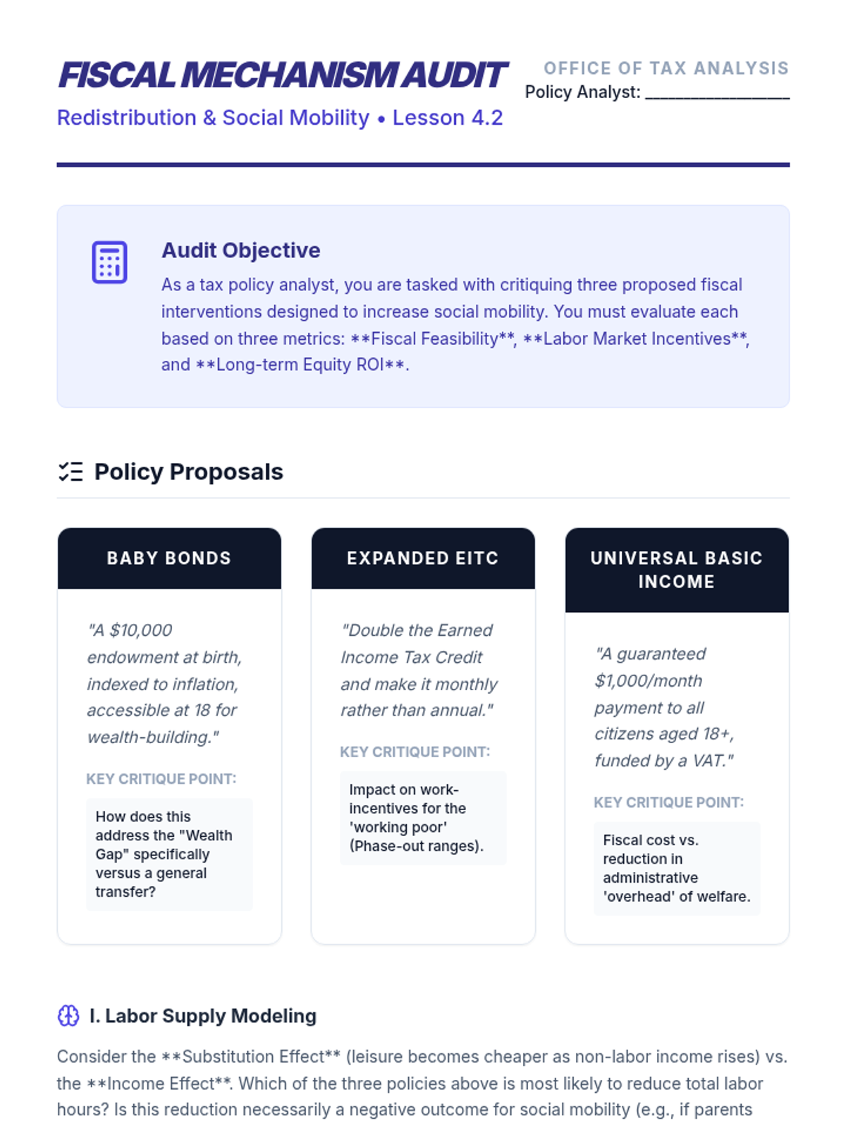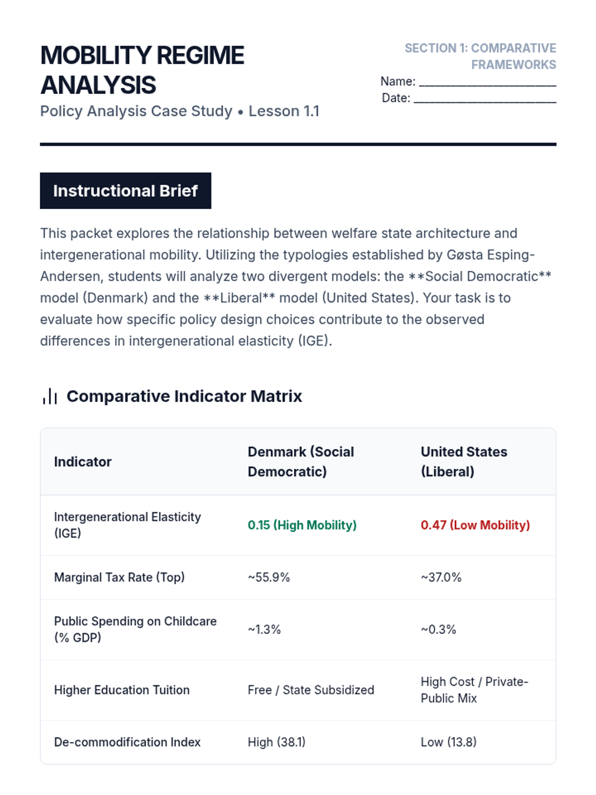 A graduate-level economics sequence exploring social mobility through the lens of comparative welfare regimes, early childhood investment, place-based vs. people-based policies, and fiscal redistribution. Students will analyze data and theory to design and defend professional policy interventions.