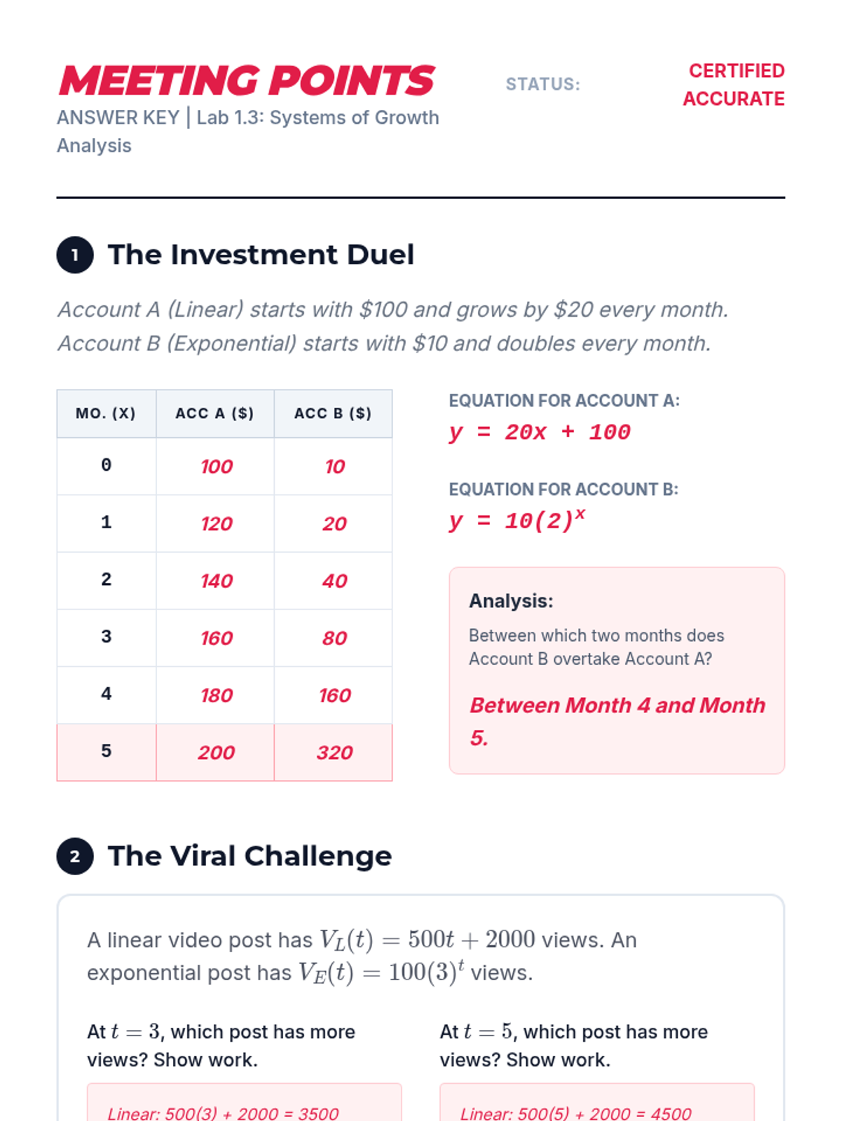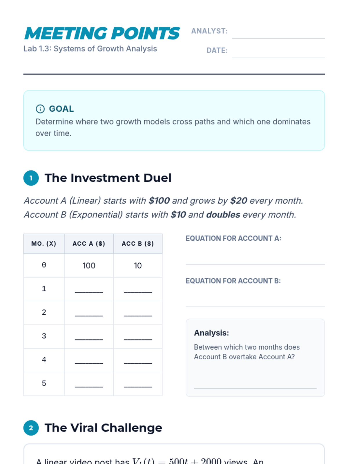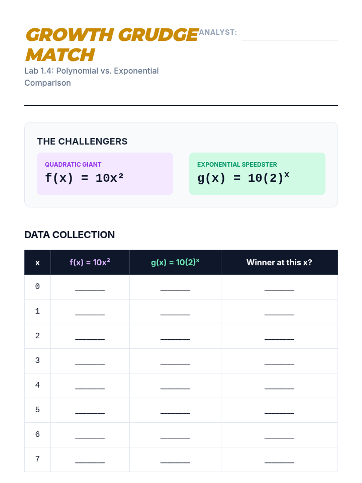 This workshop-style sequence focuses on the technical skills required to construct and compare function representations explicitly. Students move from conceptual understanding to algebraic rigor, learning to write equations for different growth models and comparing their rates of change directly.