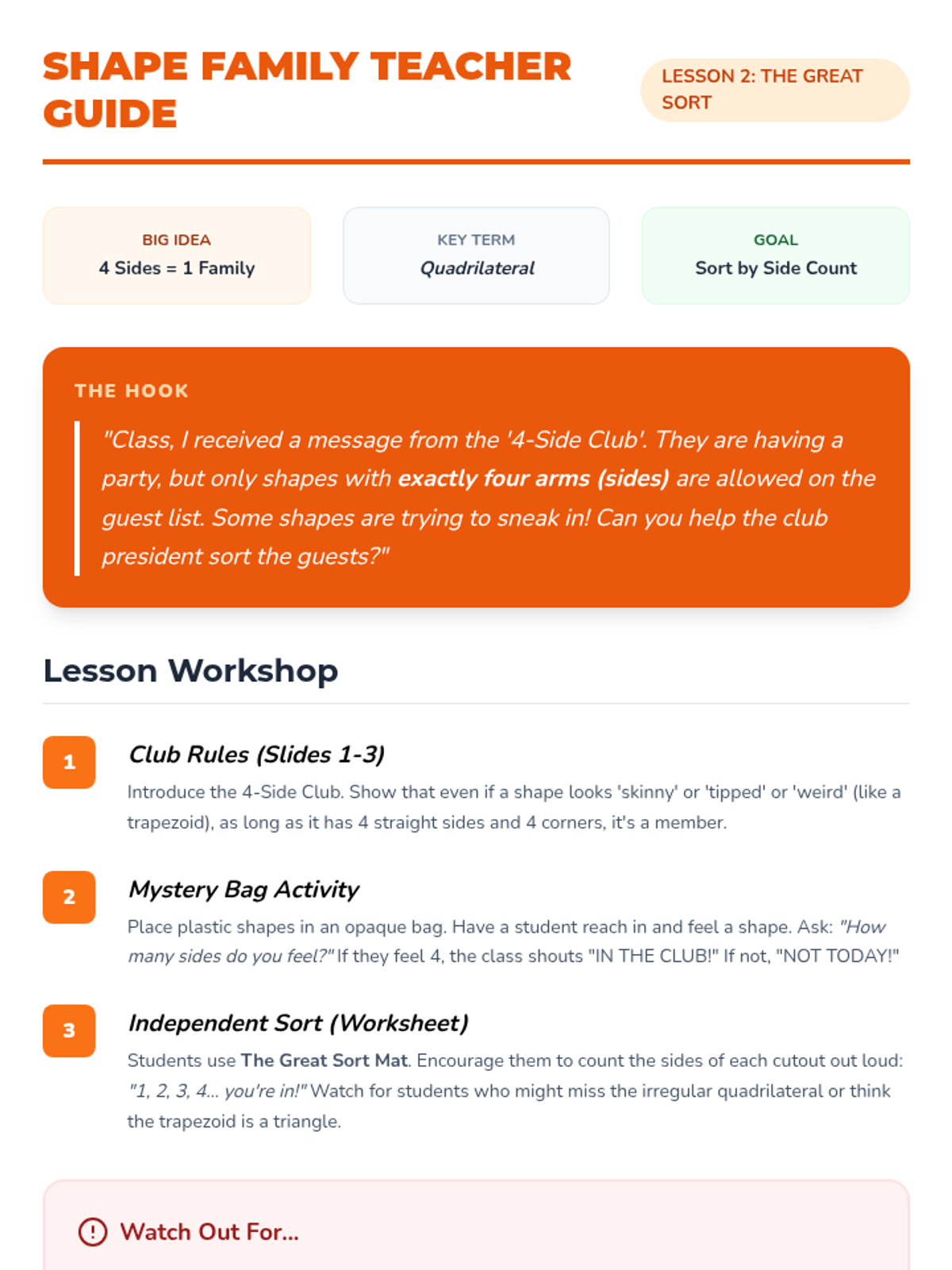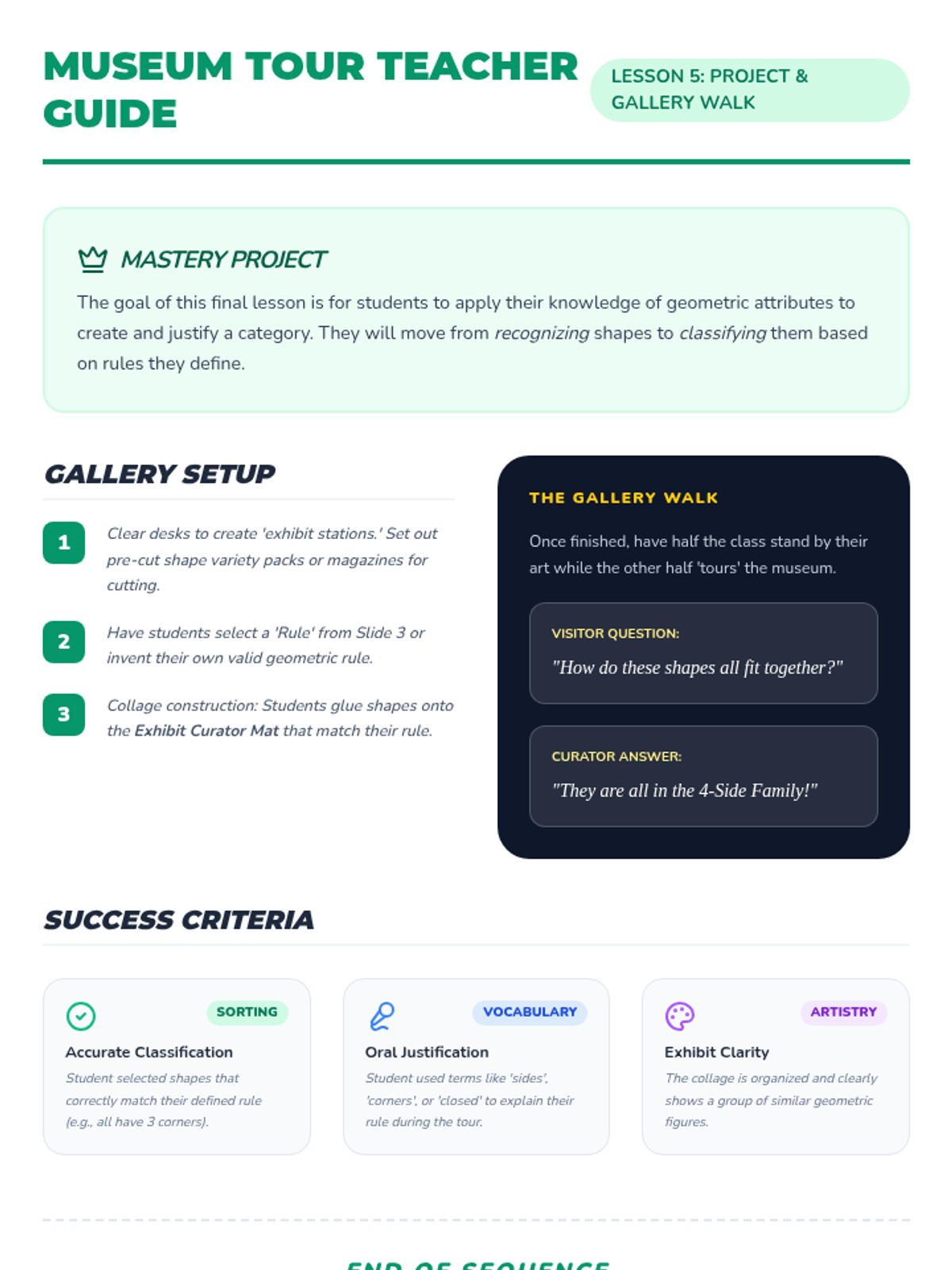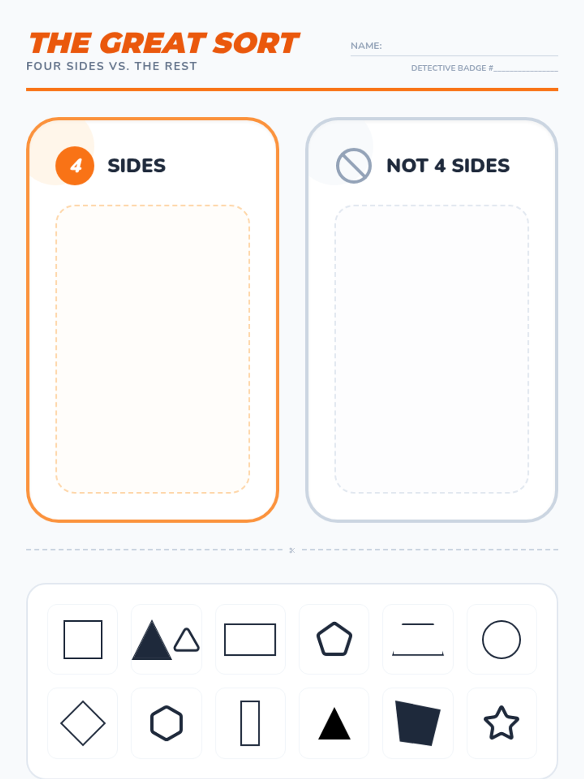 A Kindergarten geometry sequence focused on comparing, contrasting, and categorizing 2D figures. Students learn to distinguish between defining attributes like side count and non-defining attributes like color and size through hands-on sorting, building, and games.