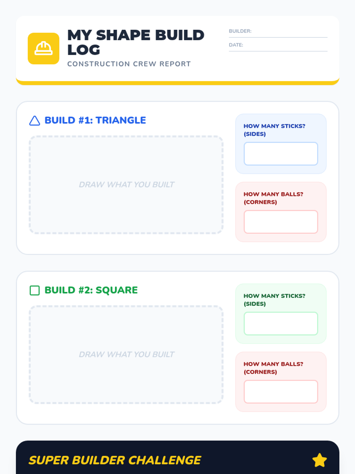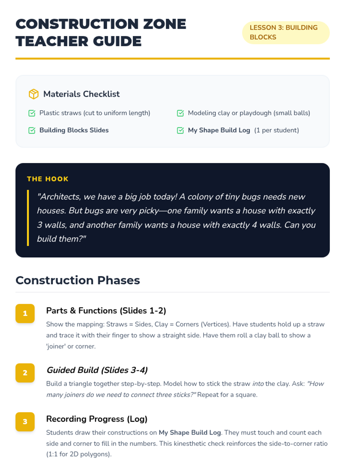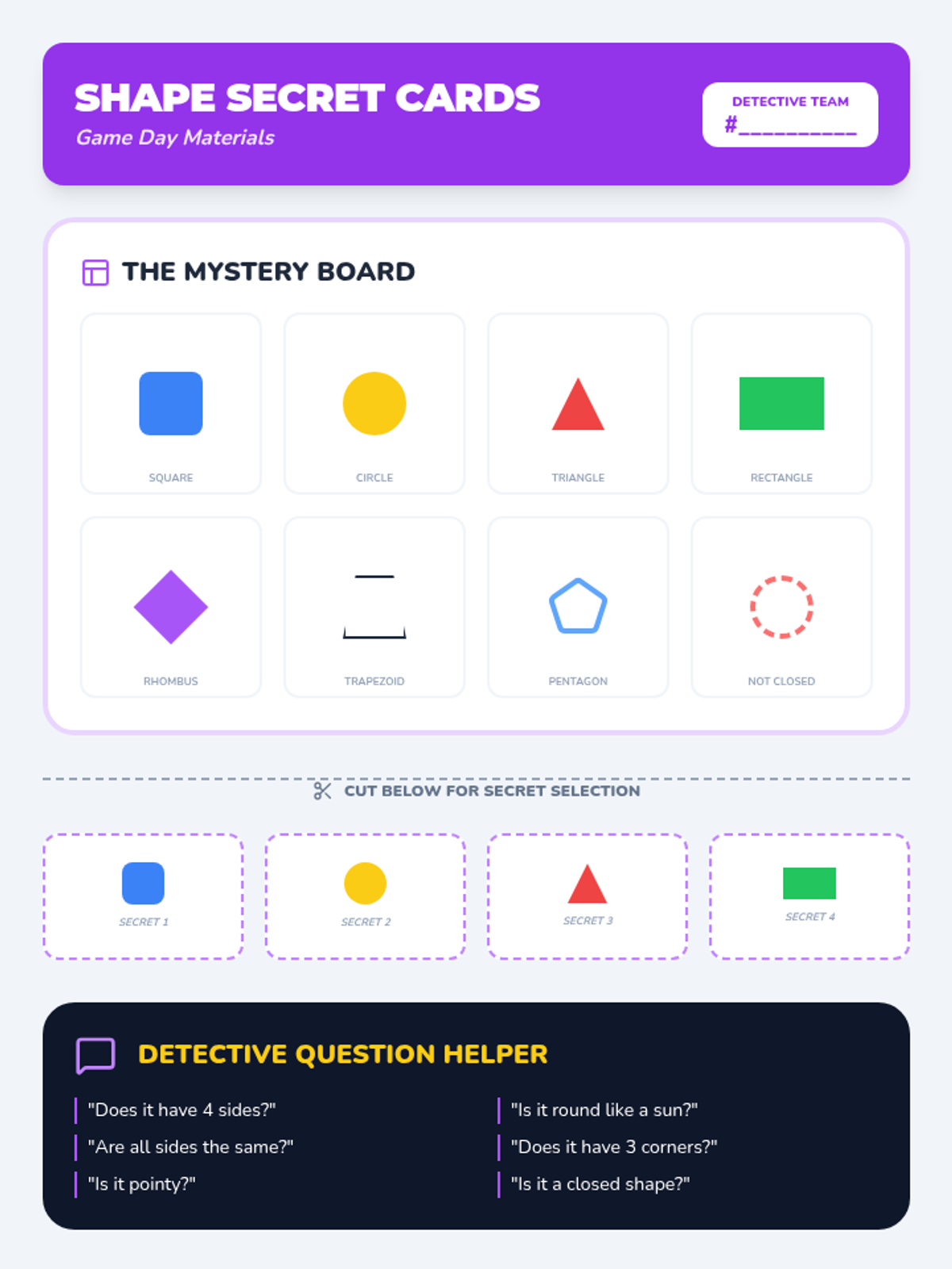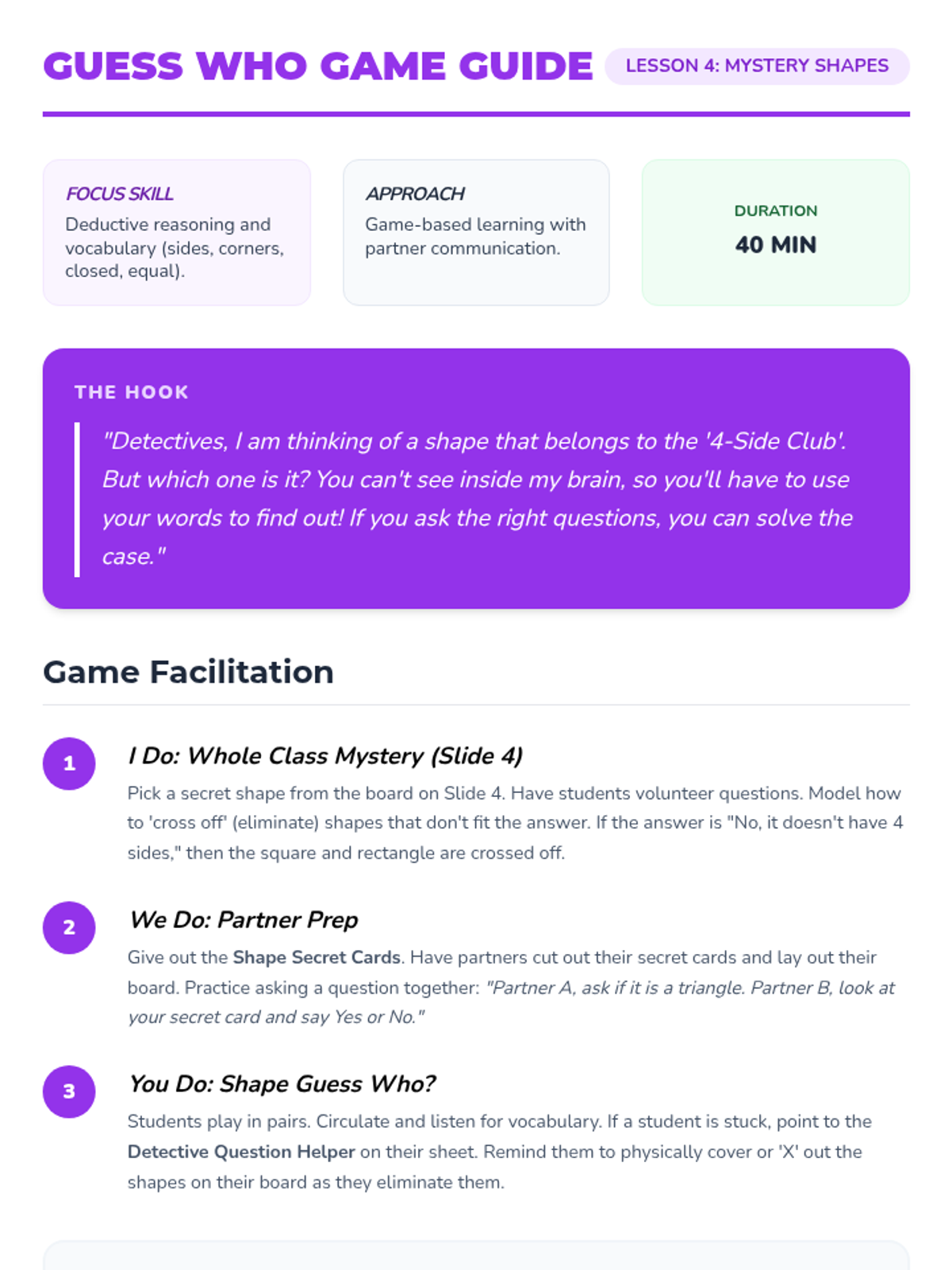 A Kindergarten geometry sequence focused on comparing, contrasting, and categorizing 2D figures. Students learn to distinguish between defining attributes like side count and non-defining attributes like color and size through hands-on sorting, building, and games.