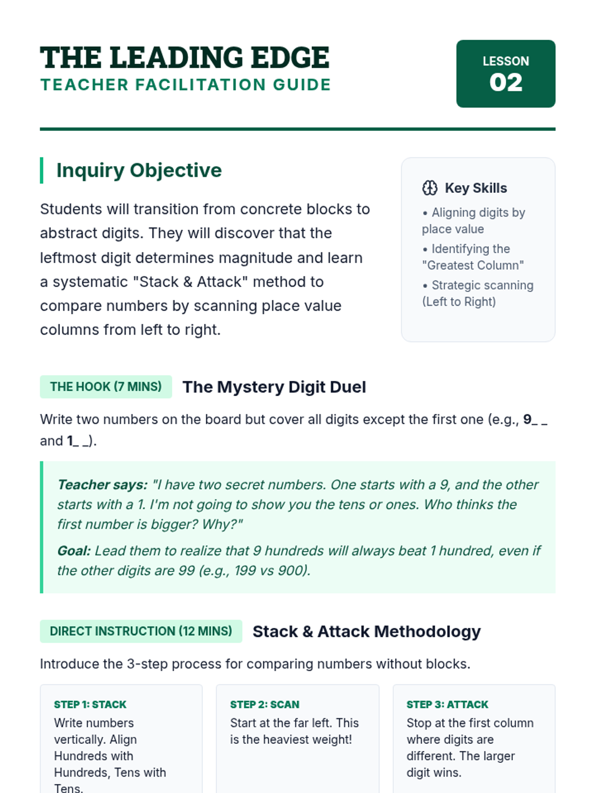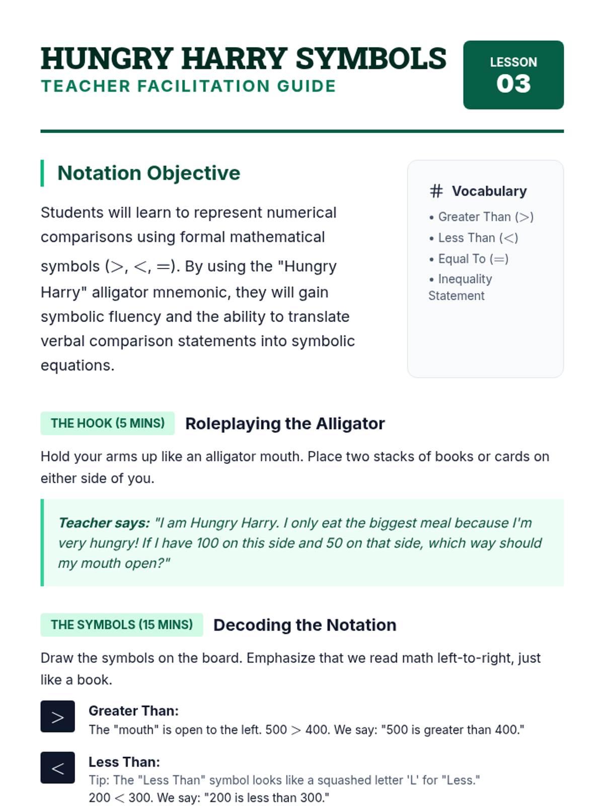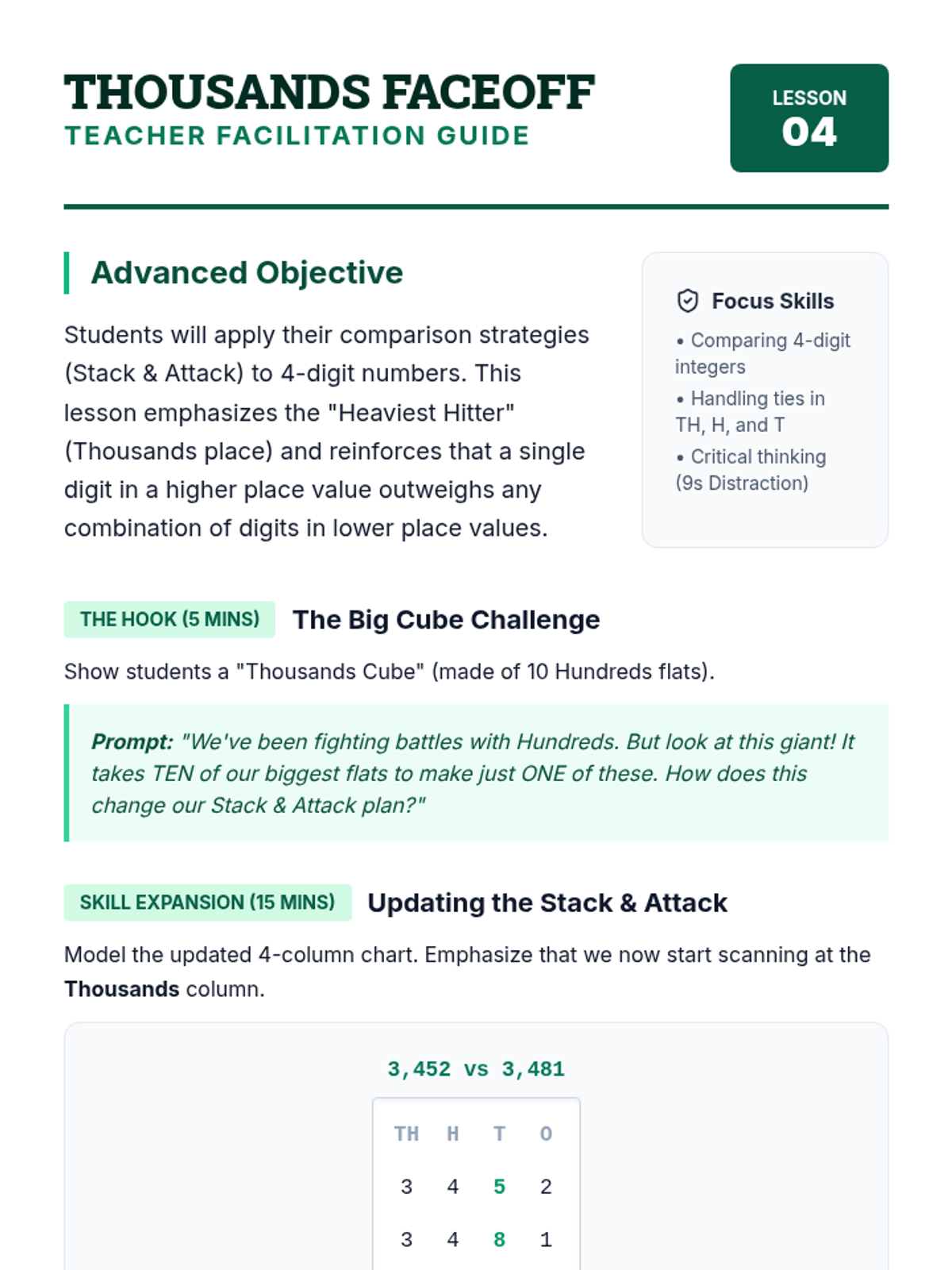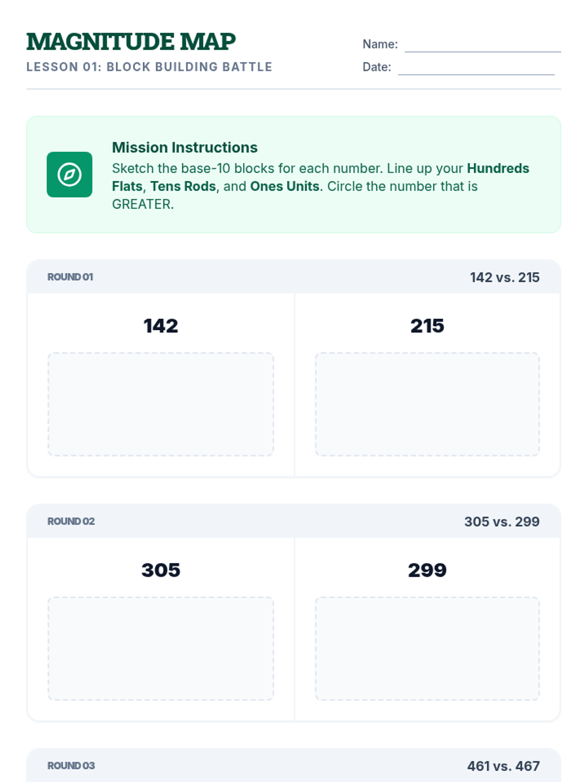 A foundational sequence for 3rd graders to master comparing multi-digit numbers using place value logic and symbolic notation. Students progress from physical modeling with base-10 blocks to comparing 4-digit numbers using symbols.