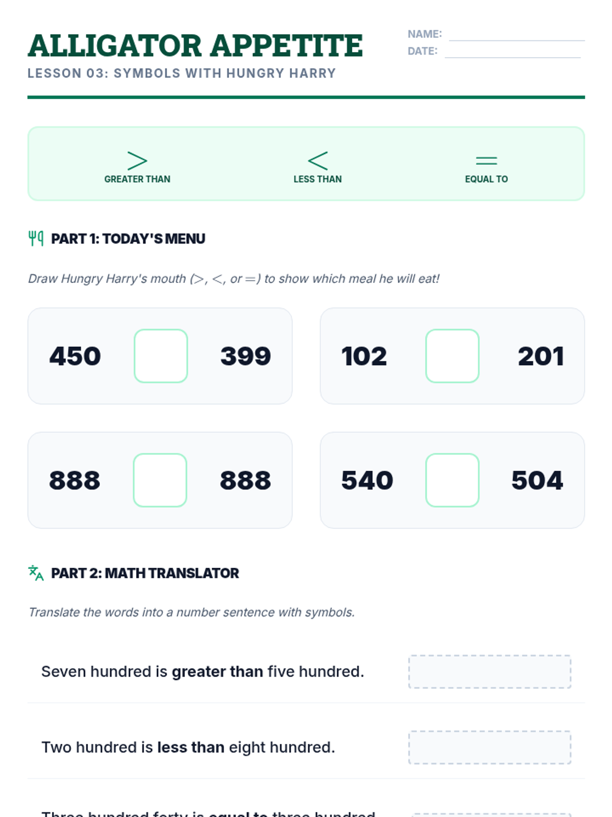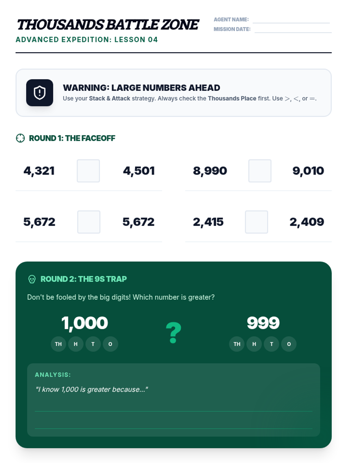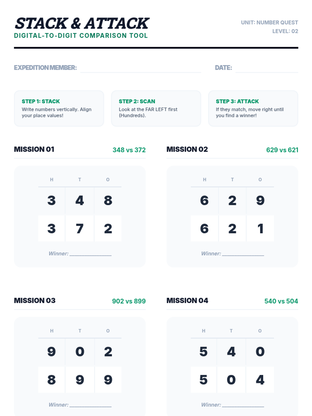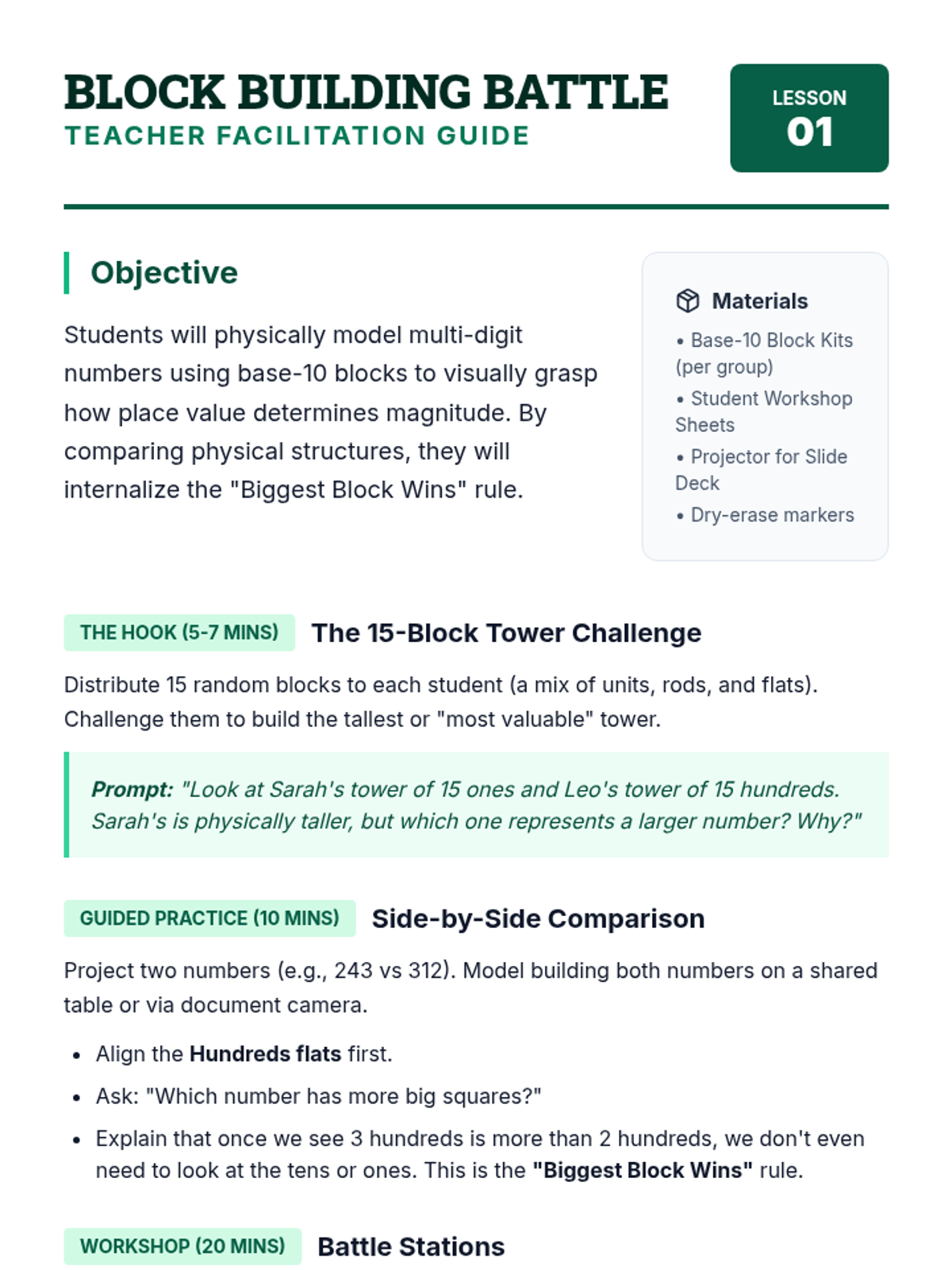 A foundational sequence for 3rd graders to master comparing multi-digit numbers using place value logic and symbolic notation. Students progress from physical modeling with base-10 blocks to comparing 4-digit numbers using symbols.