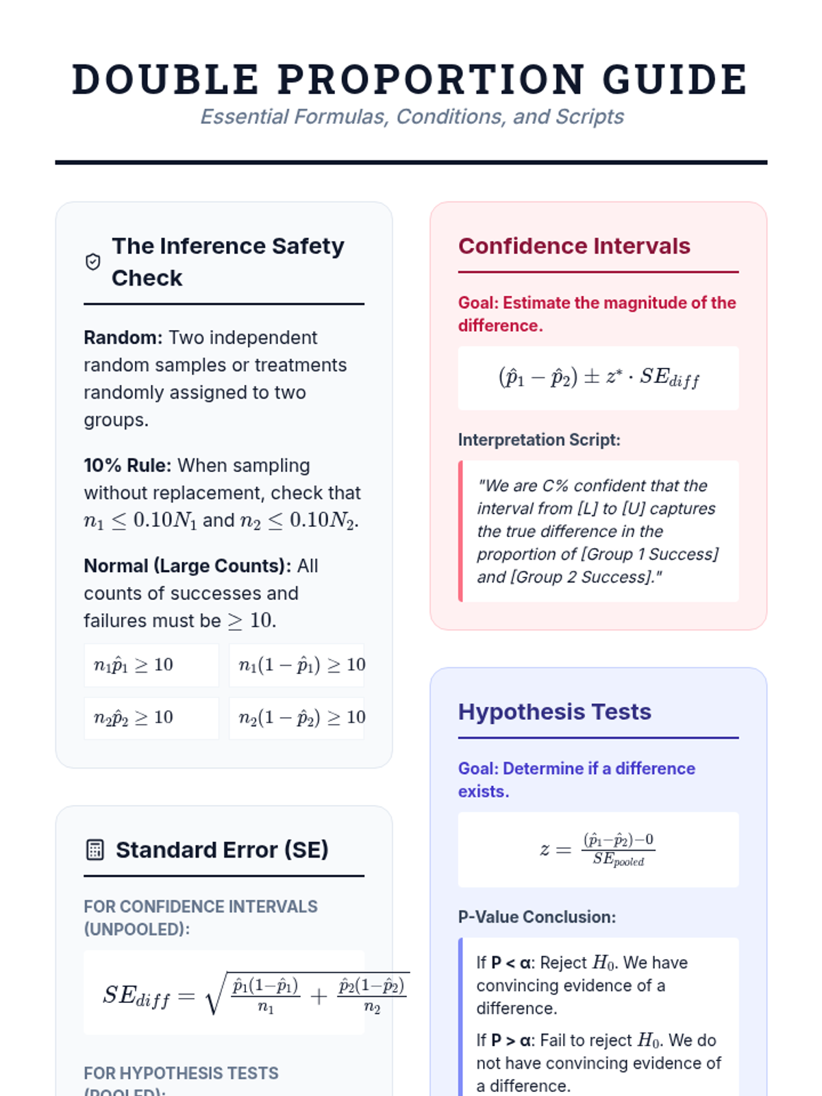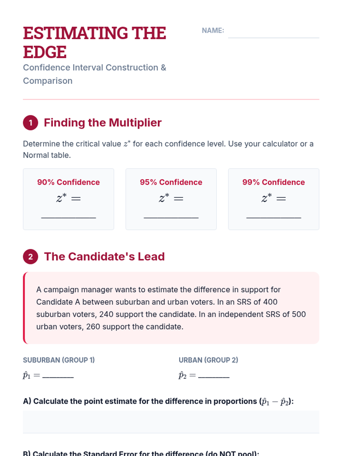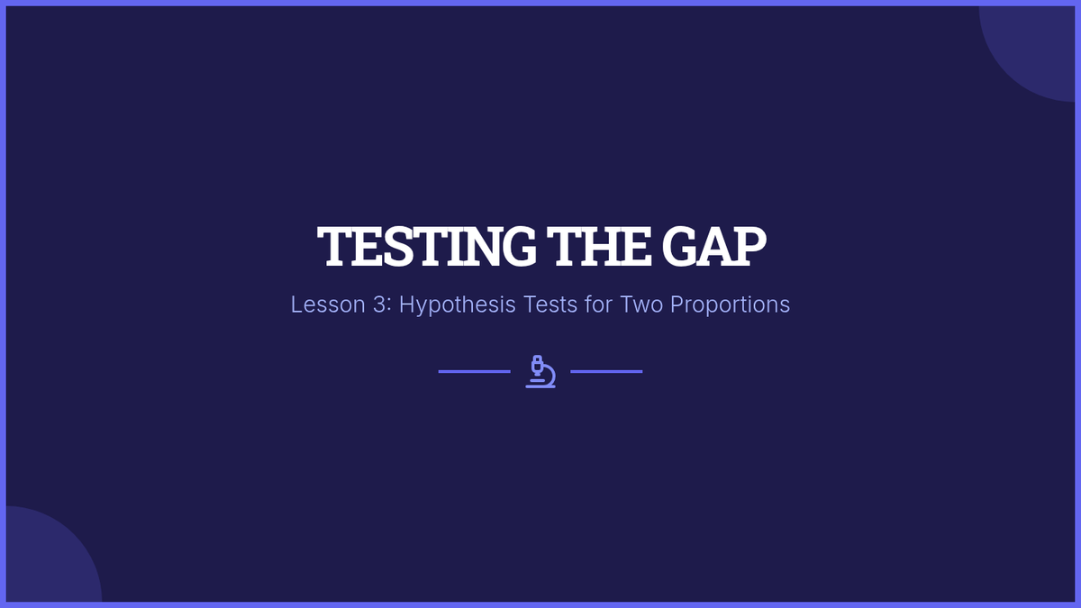A comprehensive unit for 11th-grade statistics focusing on the comparison of proportions between two independent populations. Students transition from simulation-based inquiry to formal z-tests and confidence intervals, culminating in a real-world sociological data analysis project.