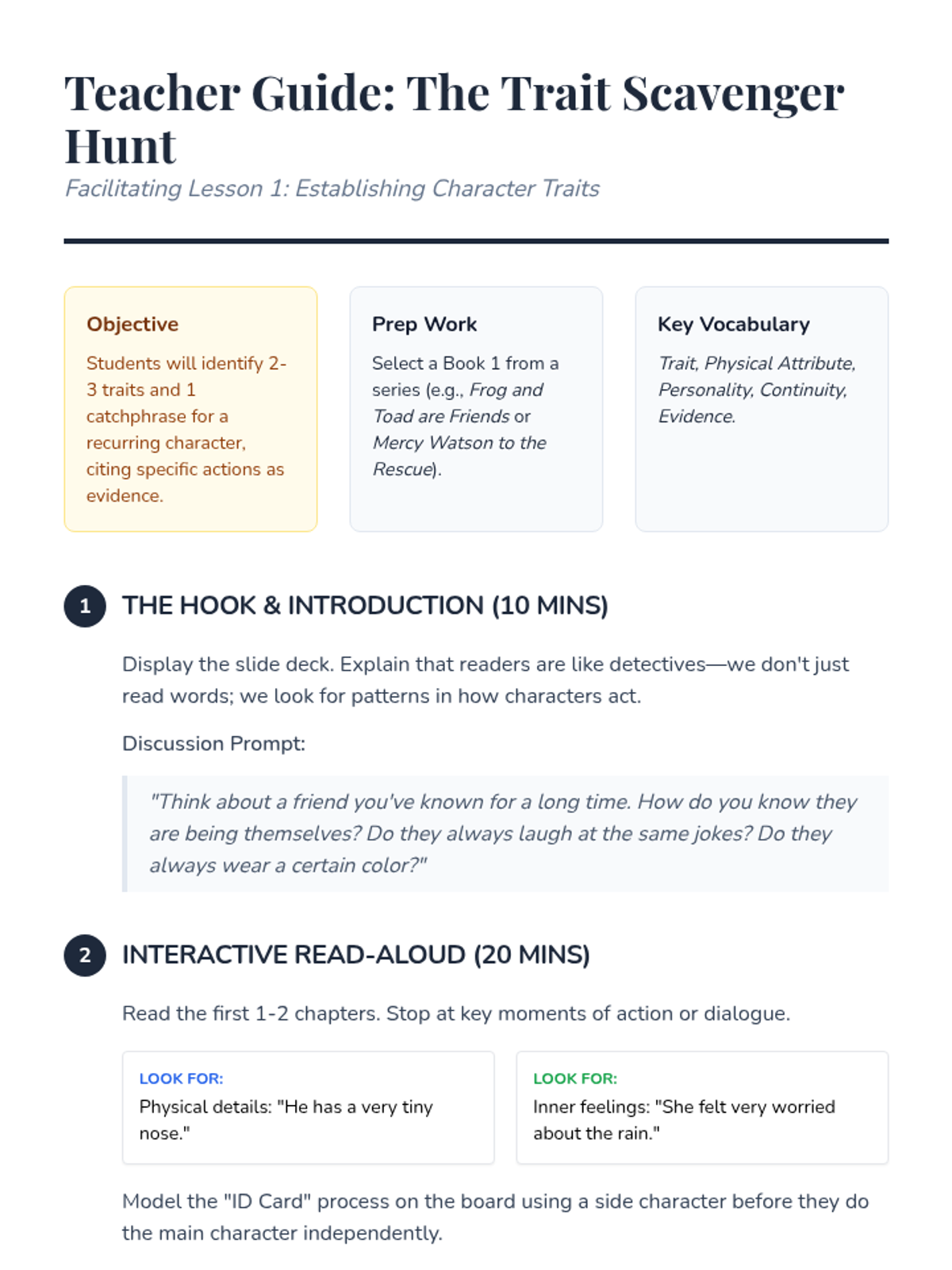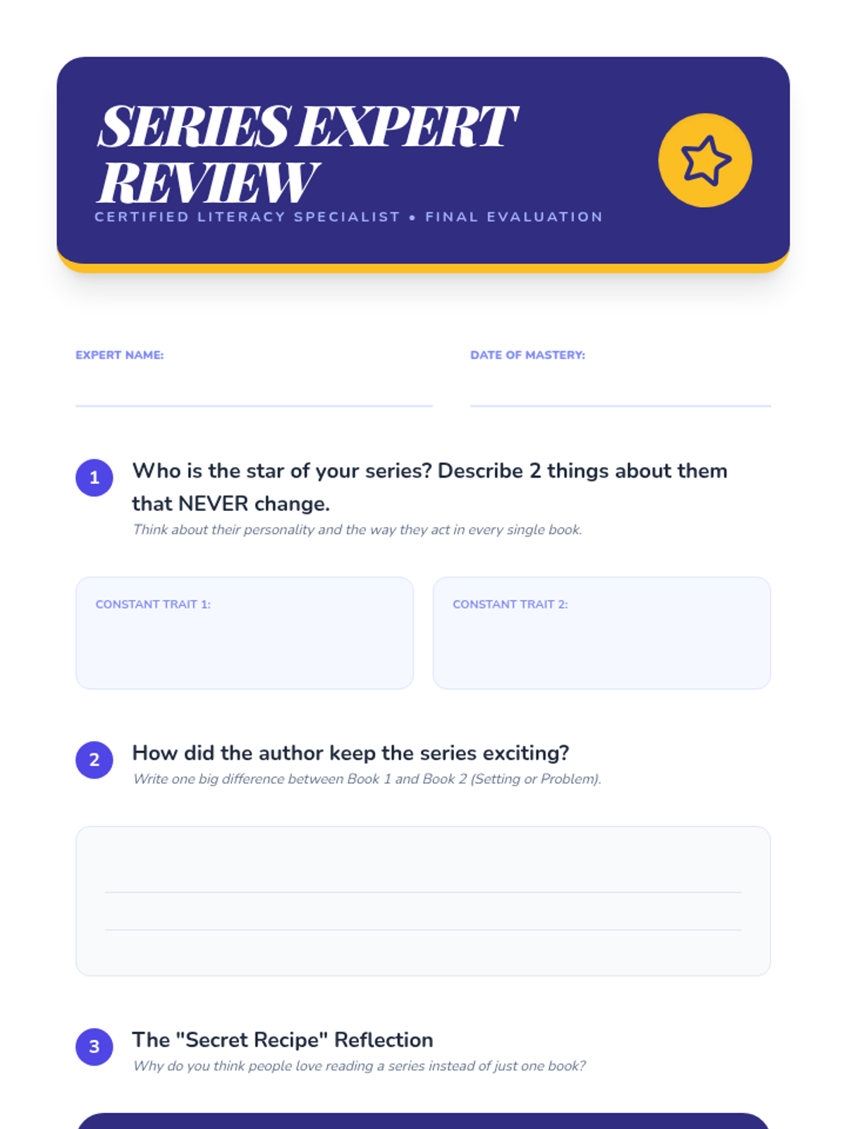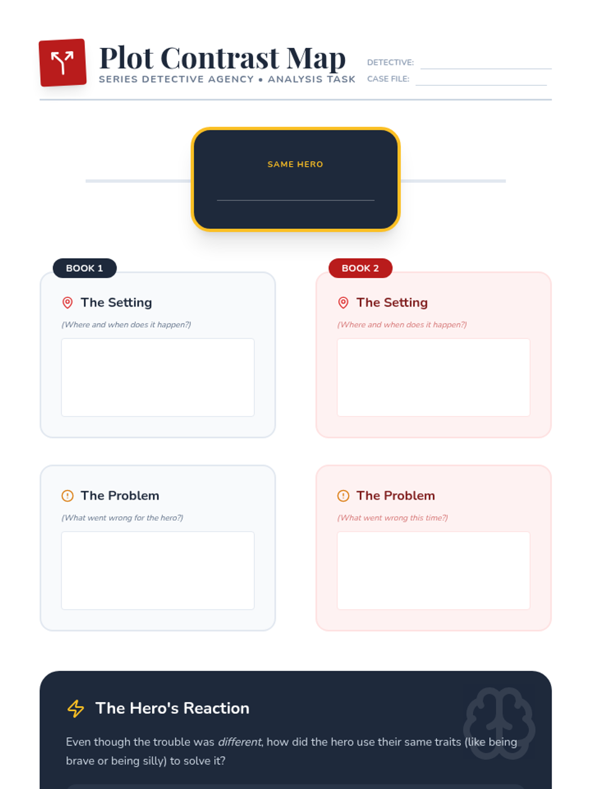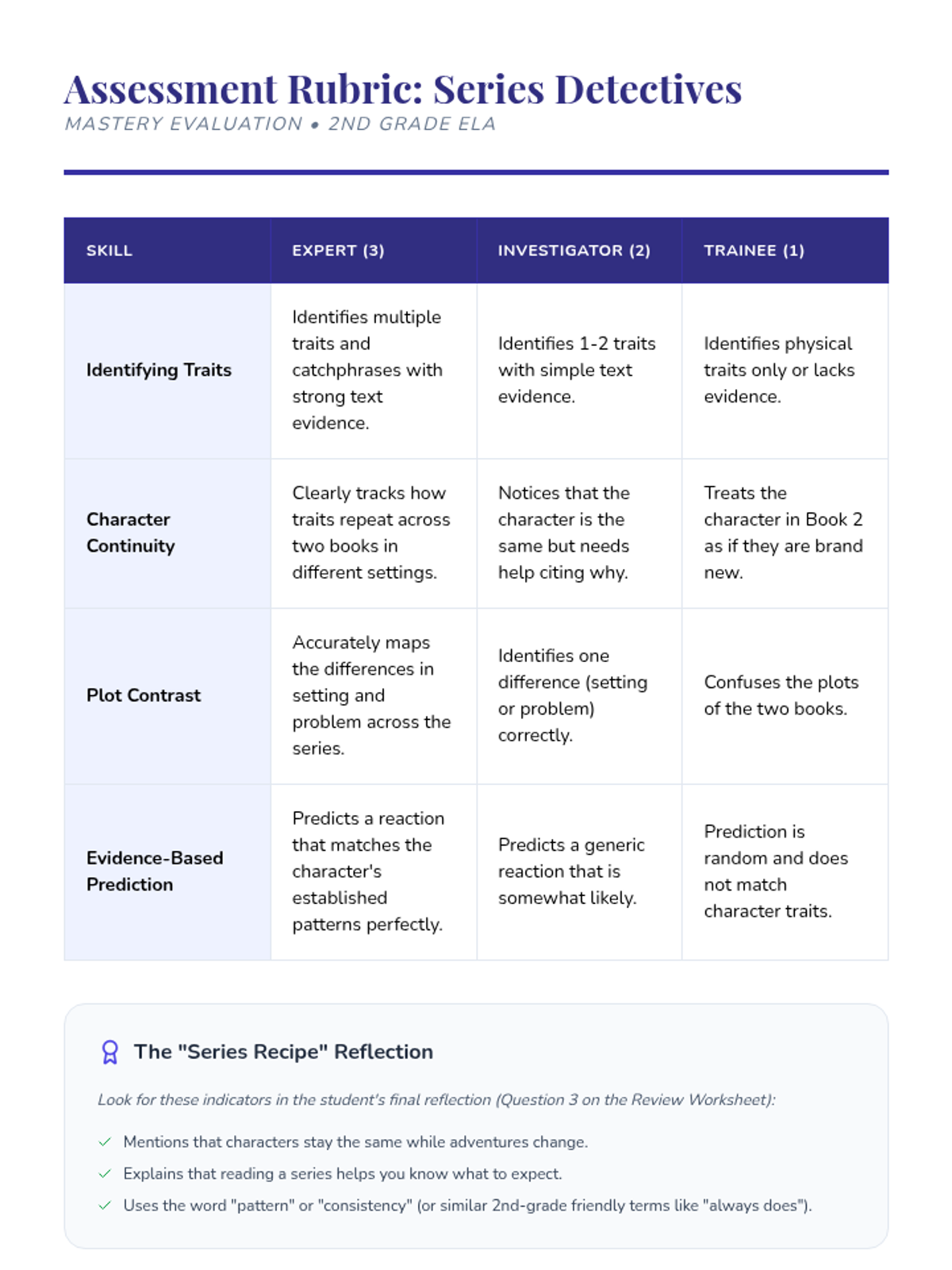 A mastery-based sequence for 2nd graders to analyze character consistency and plot changes across a book series, using a 'Series Detective' theme. Students track traits, compare settings, and predict reactions to understand how characters anchor a series.