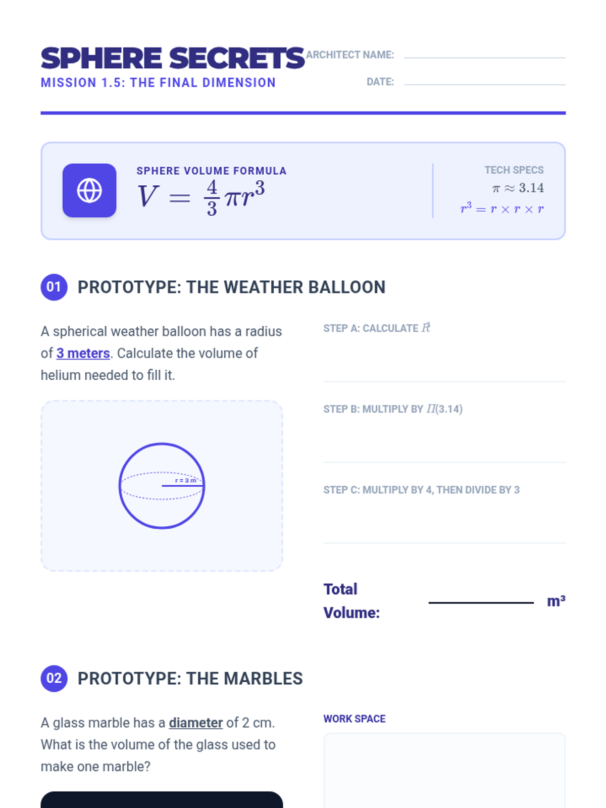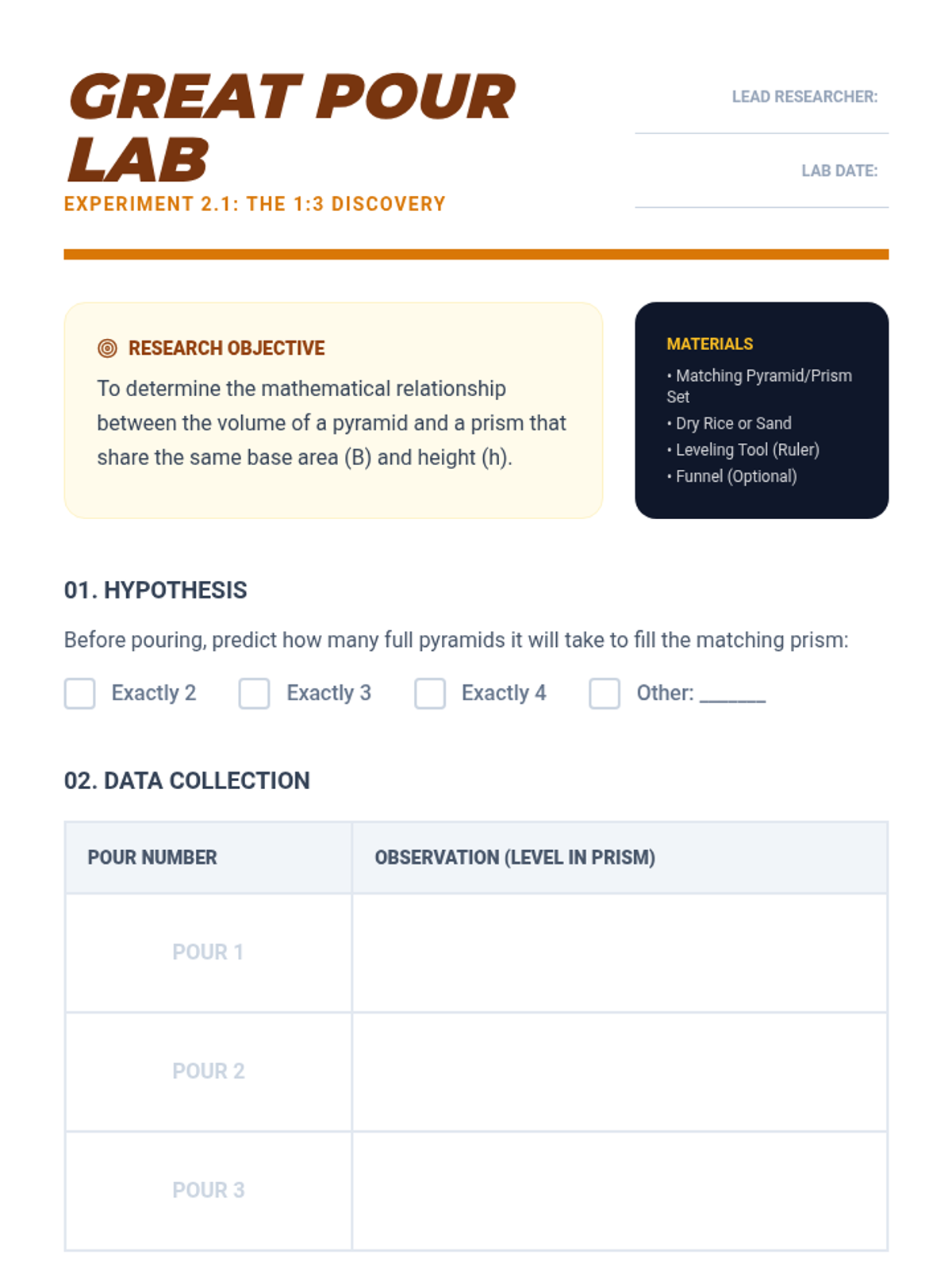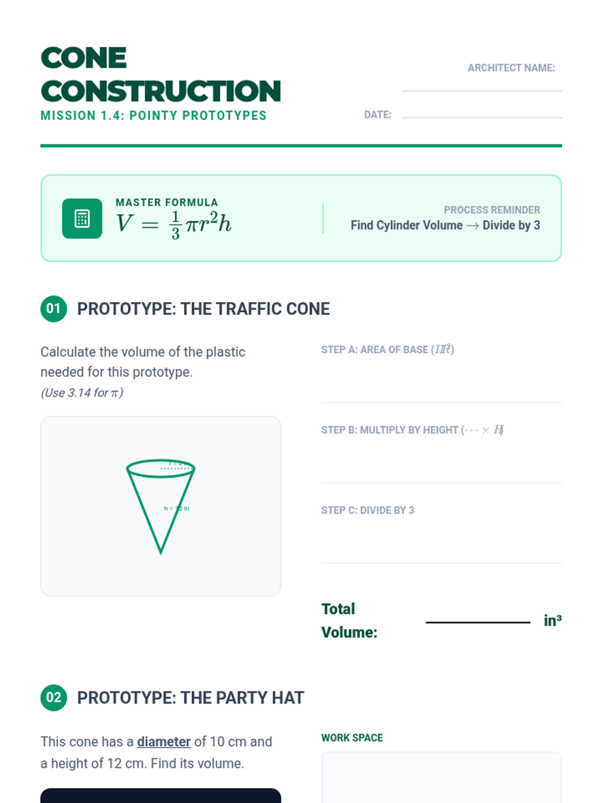 A comprehensive geometry unit where students explore the relationships between different geometric solids through hands-on discovery, inquiry-based labs, and architectural application. Students transition from simple rectangular prisms to complex shapes like pyramids, cones, and spheres by understanding the core V=Bh relationship.
