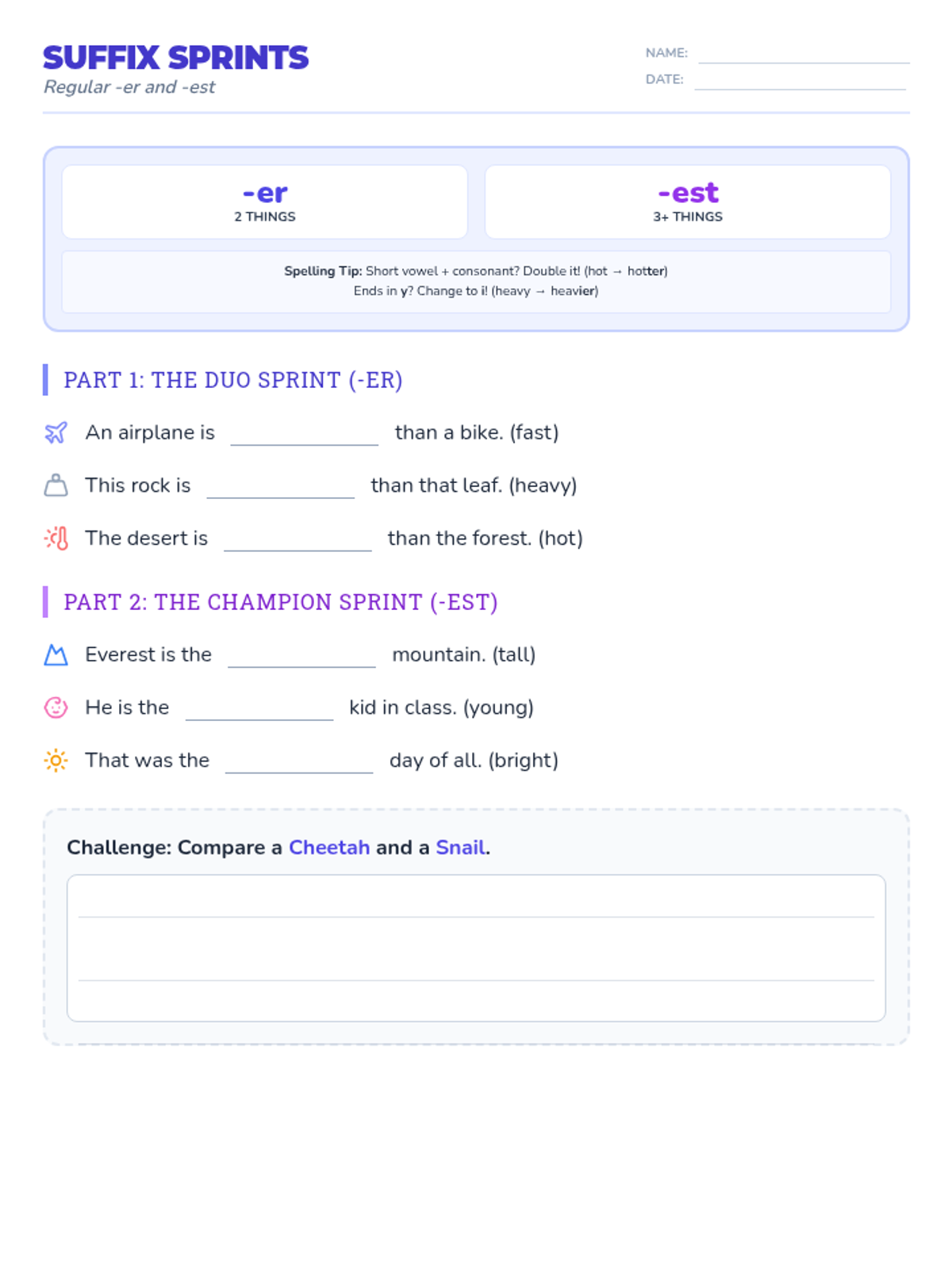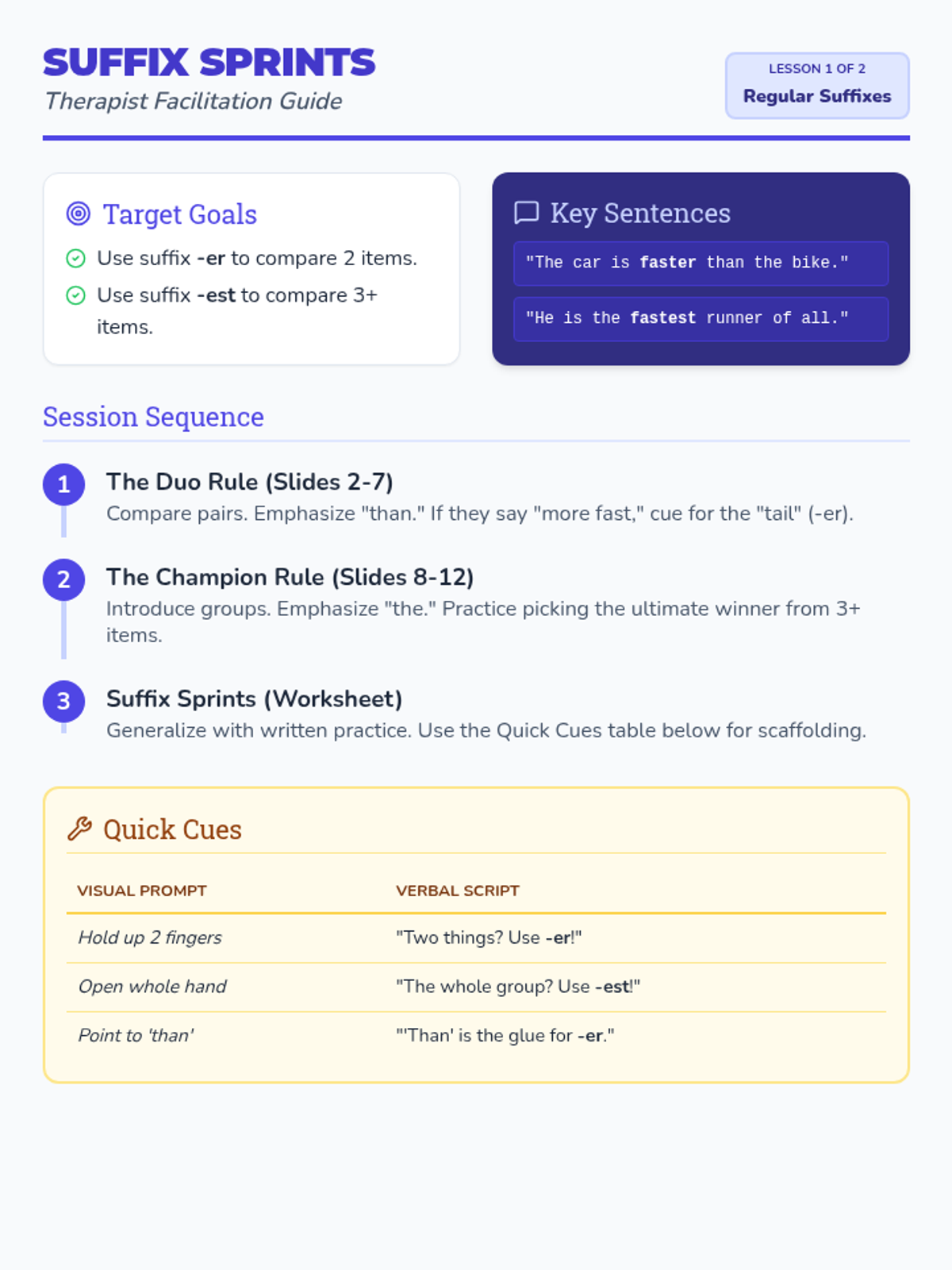 A two-part speech therapy series targeting comparative and superlative adjectives. The first part covers regular suffixes (-er, -est) while the second part masters irregular forms (better, best, worse, worst) through visual debates and structured practice.