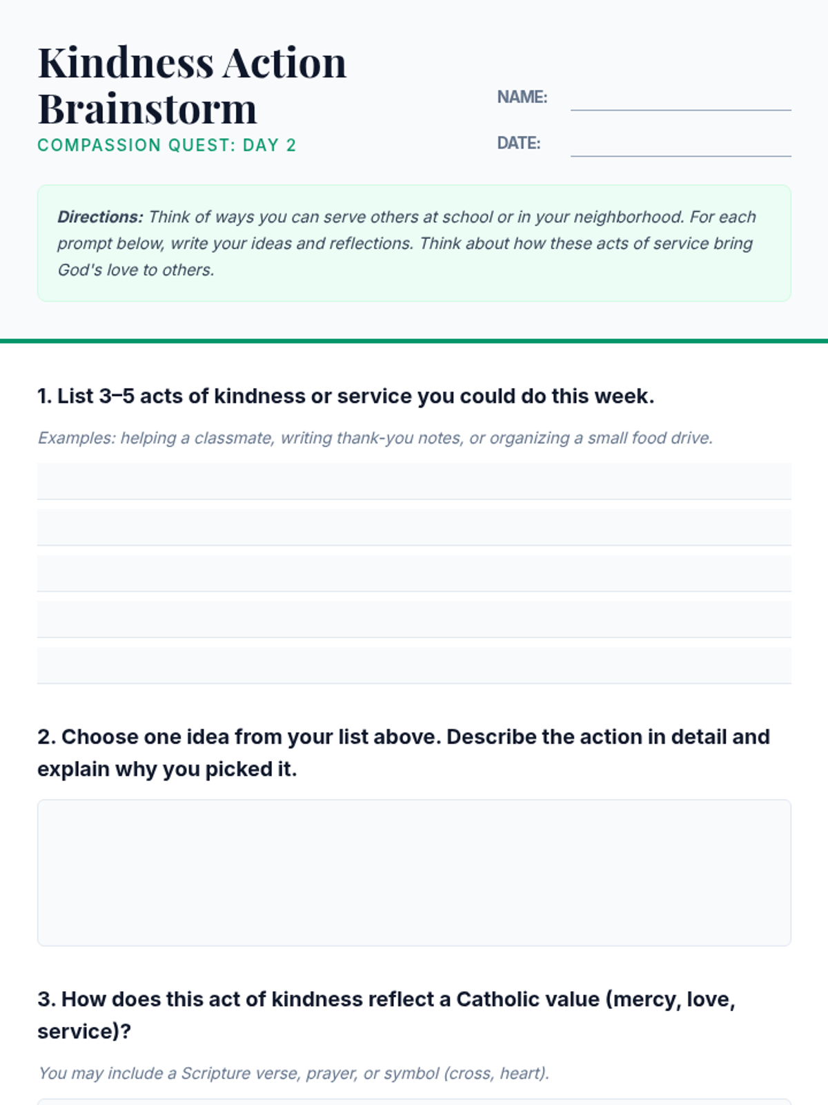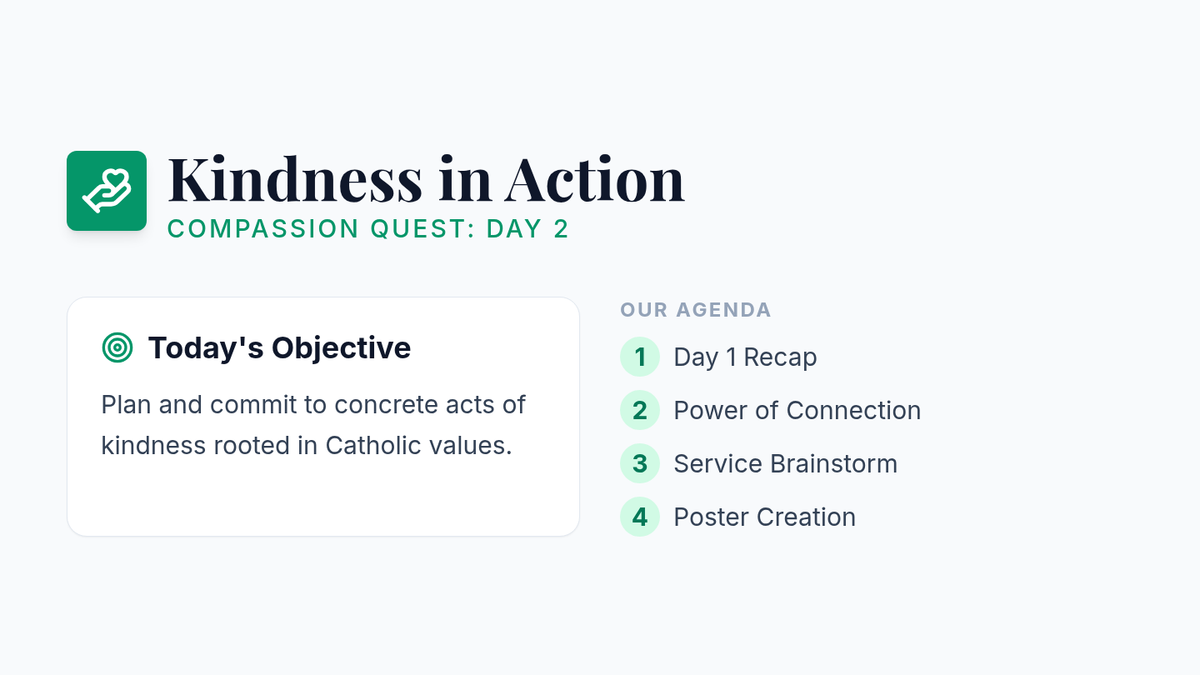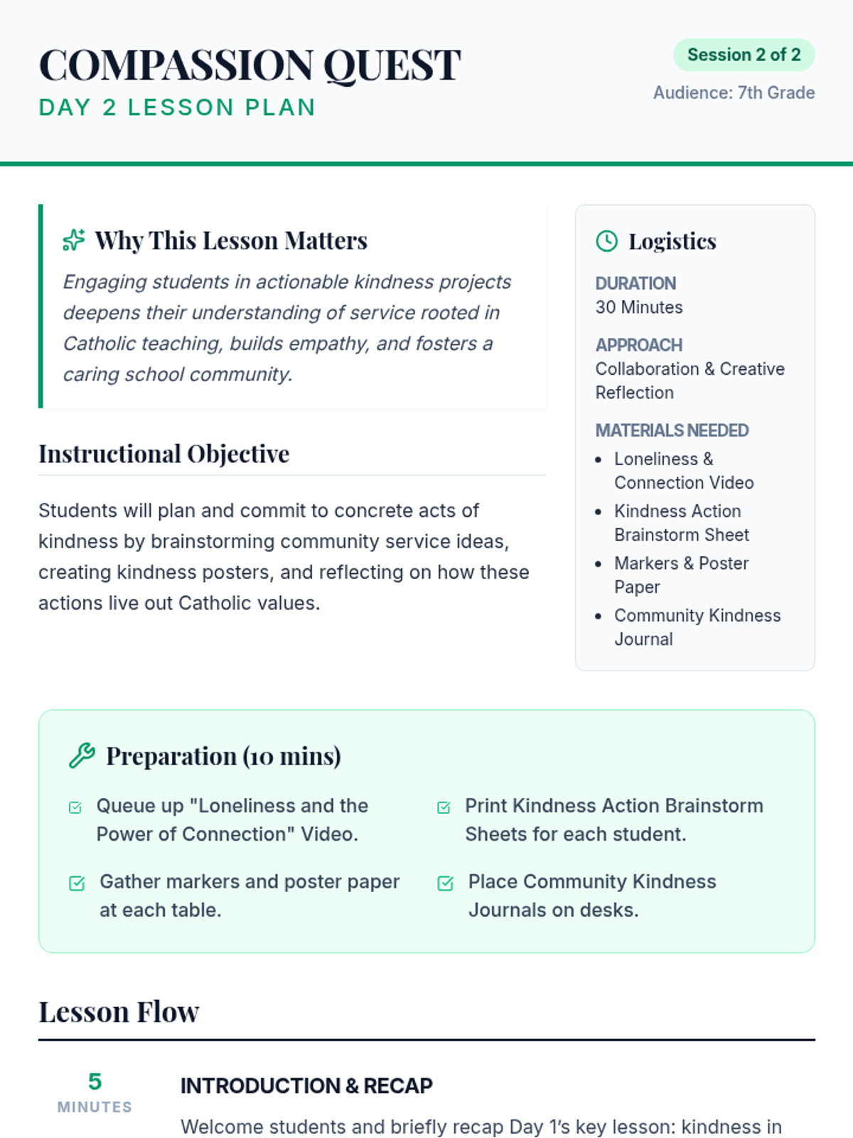 A two-session curriculum for 7th graders at a Catholic school focusing on kindness, mercy, and community service through the lens of the Good Samaritan and Catholic values.