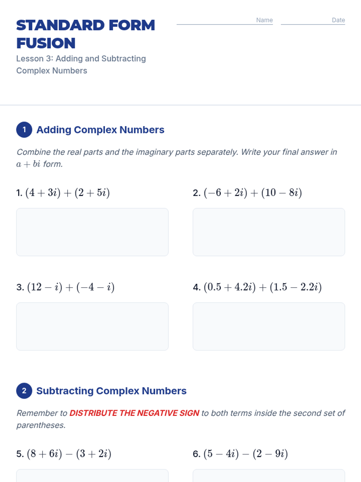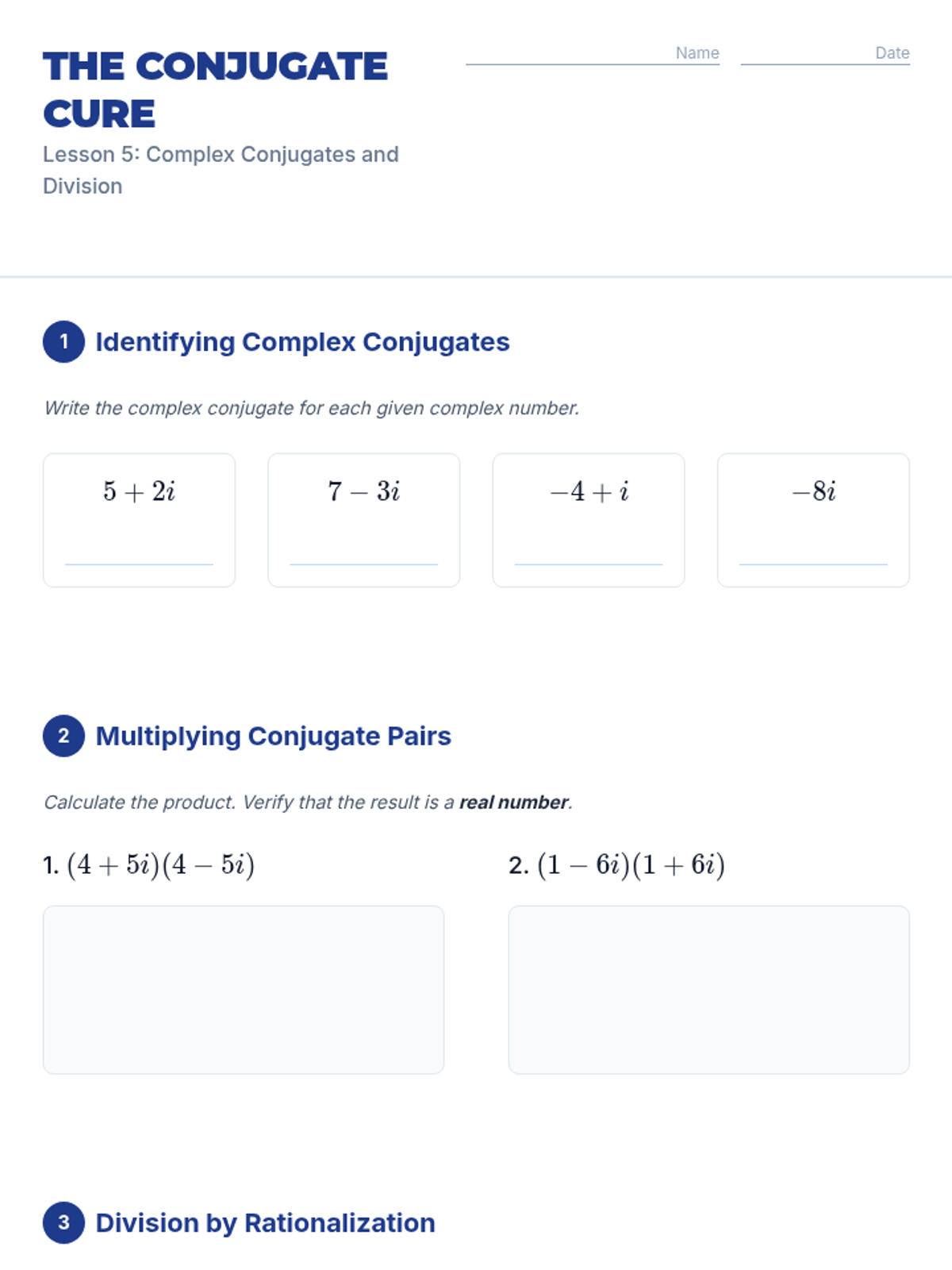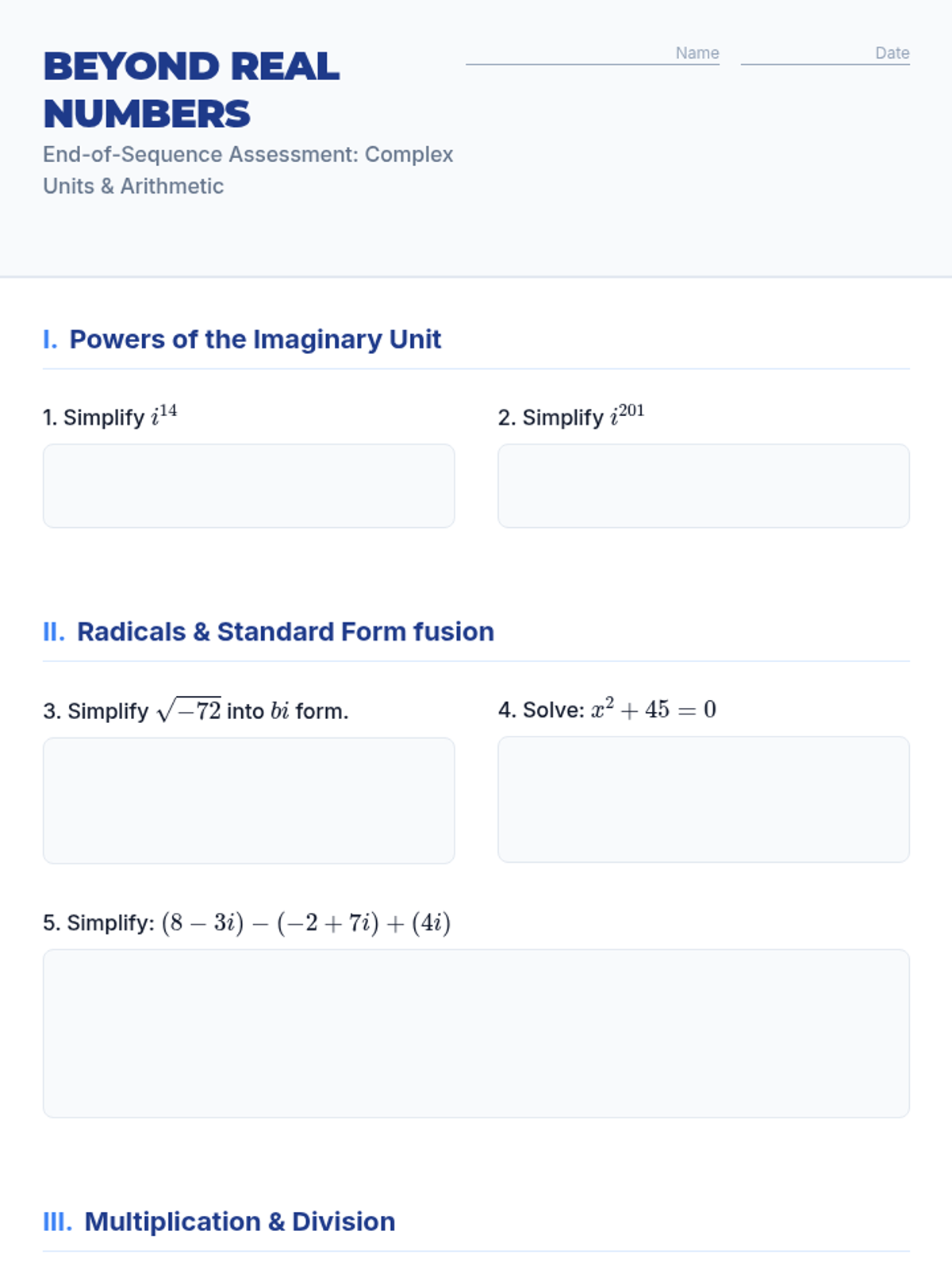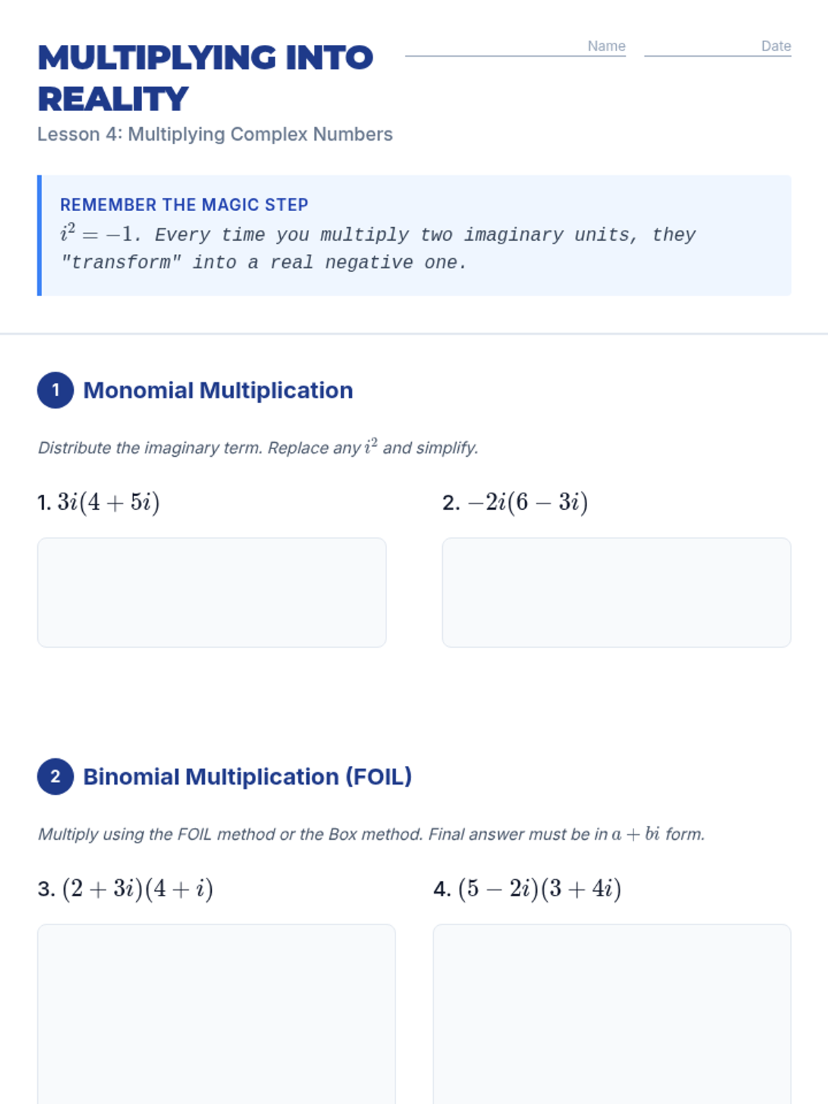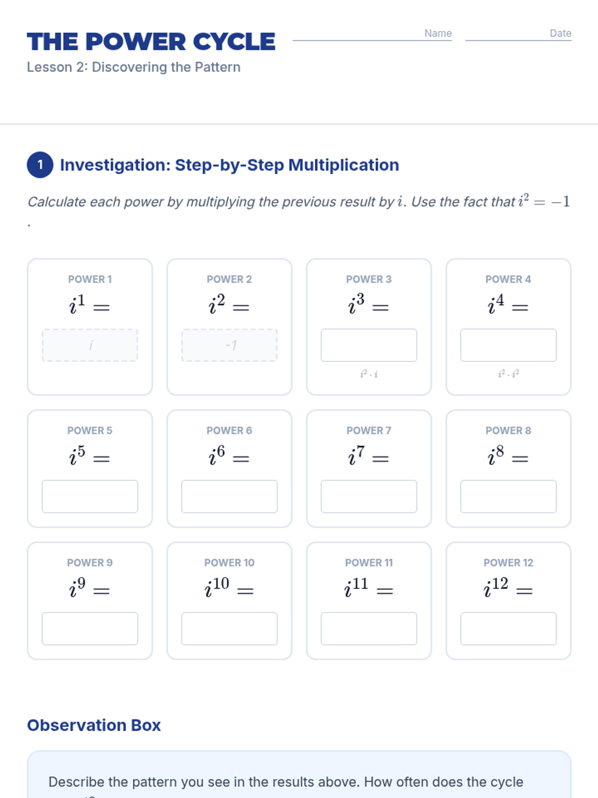 This sequence introduces 10th-grade students to the imaginary unit 'i' and the set of complex numbers. Students will explore the limitations of real numbers, discover the cyclic nature of powers of 'i', and master arithmetic operations (addition, subtraction, multiplication, and division) with complex numbers in standard form.