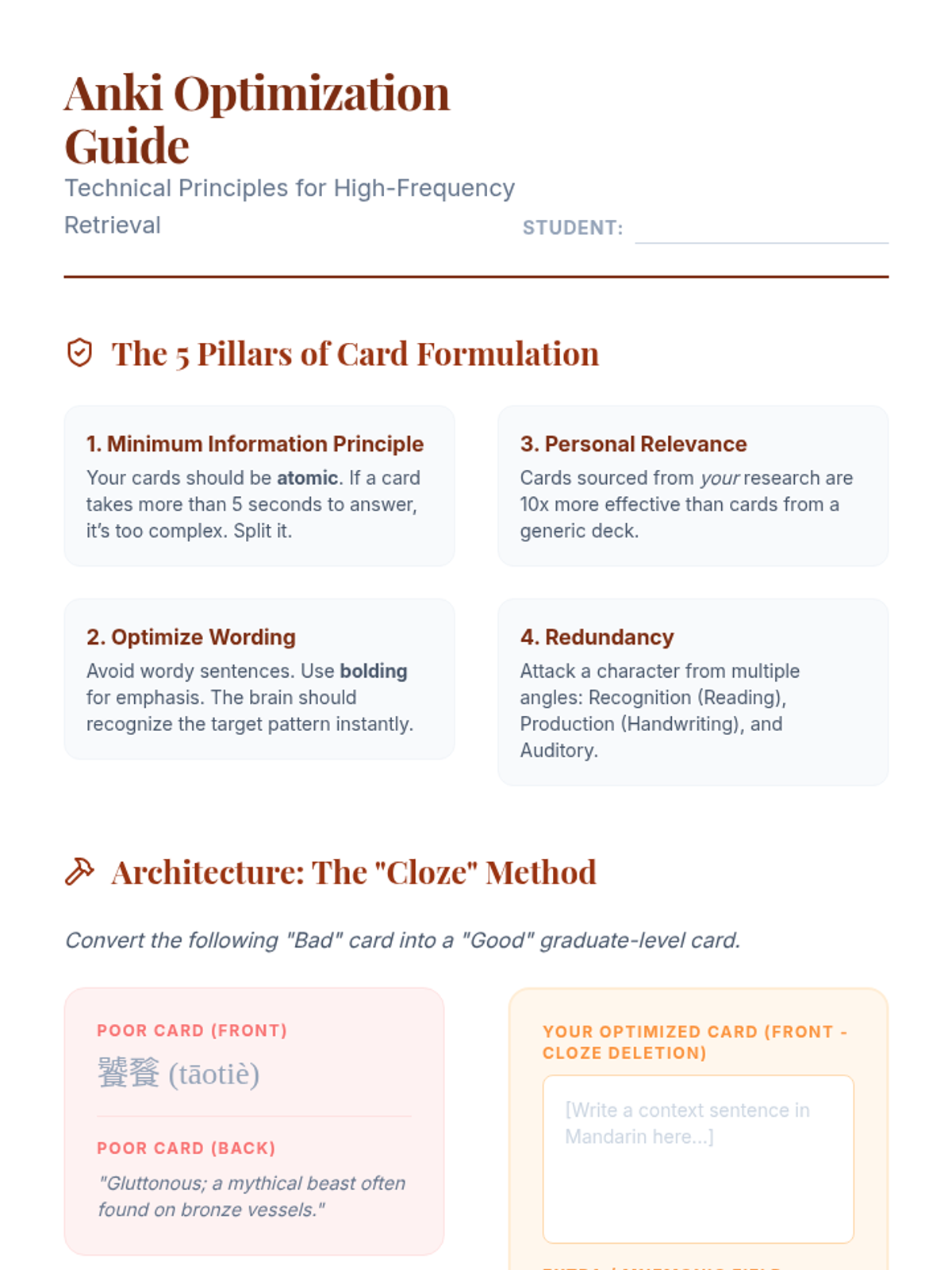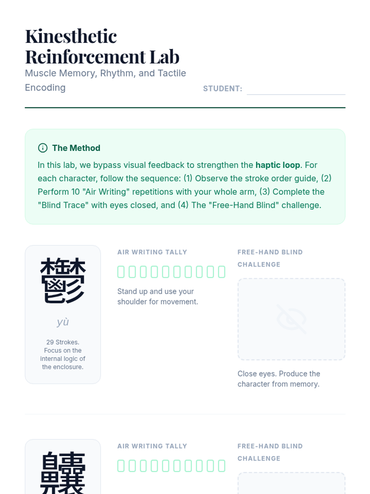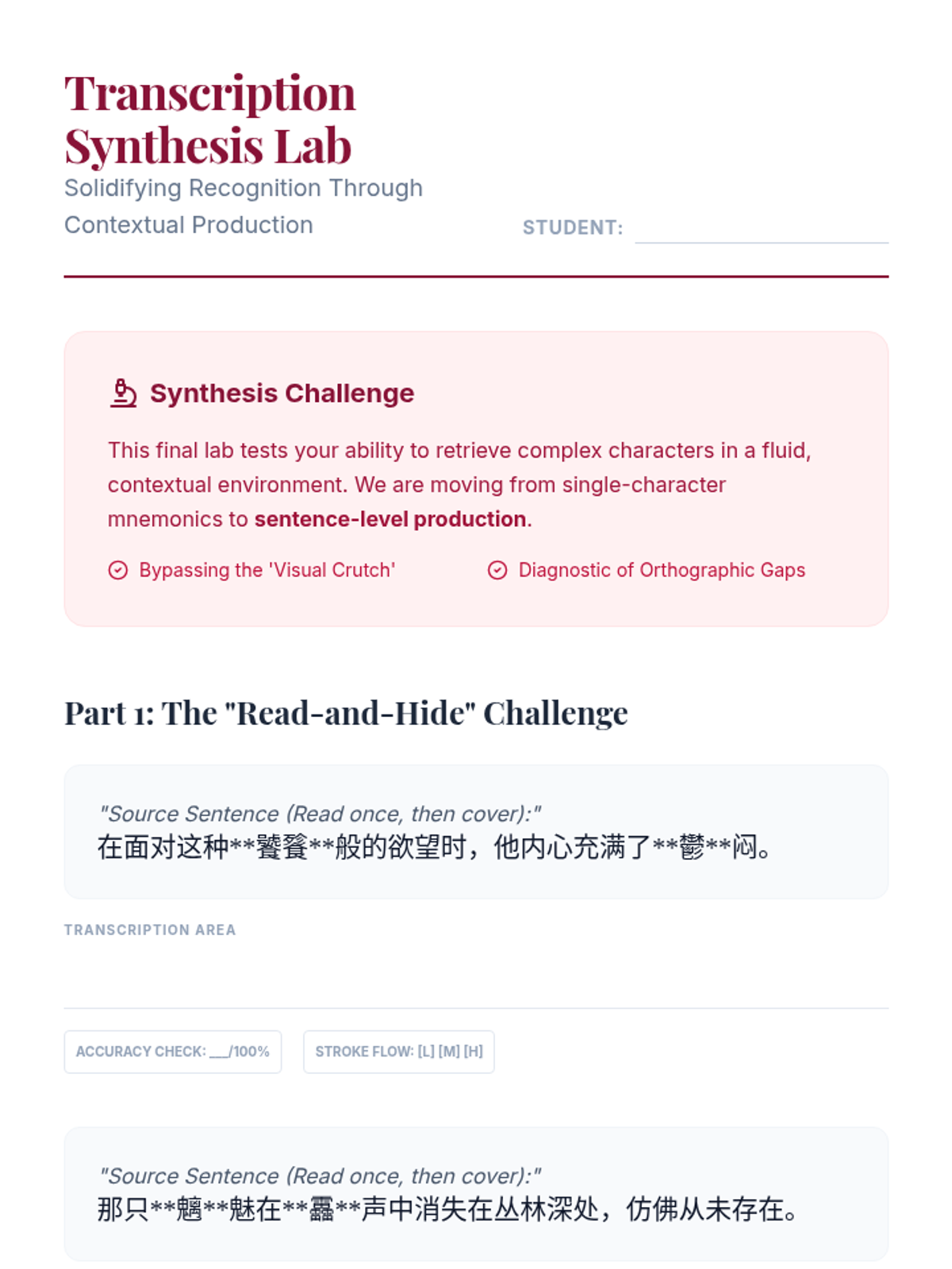 A graduate-level sequence focused on cognitive science and mnemonic strategies for retaining complex, low-frequency Mandarin characters. Students move beyond rote memorization to explore the method of loci, narrative encoding, and kinesthetic reinforcement.