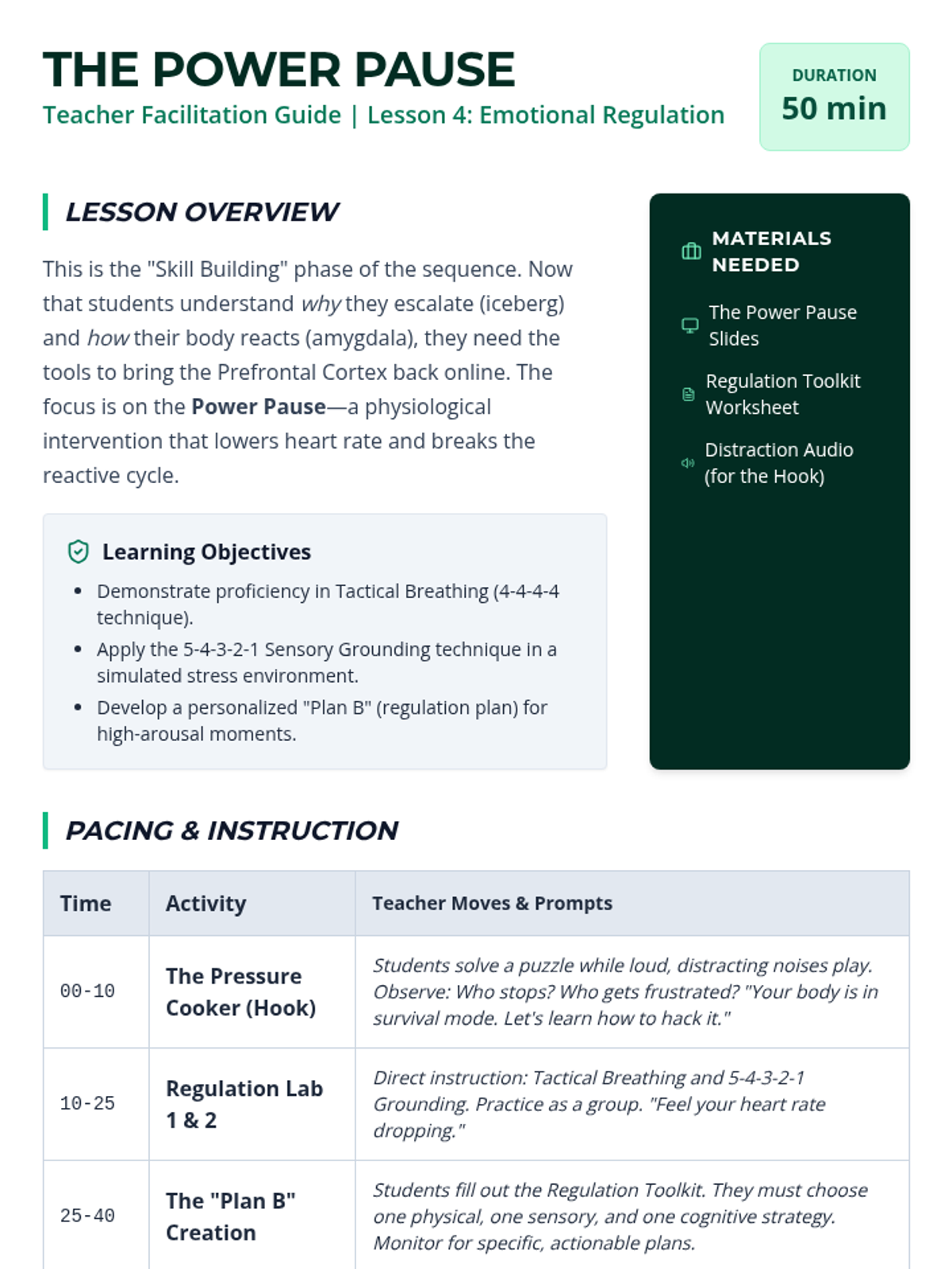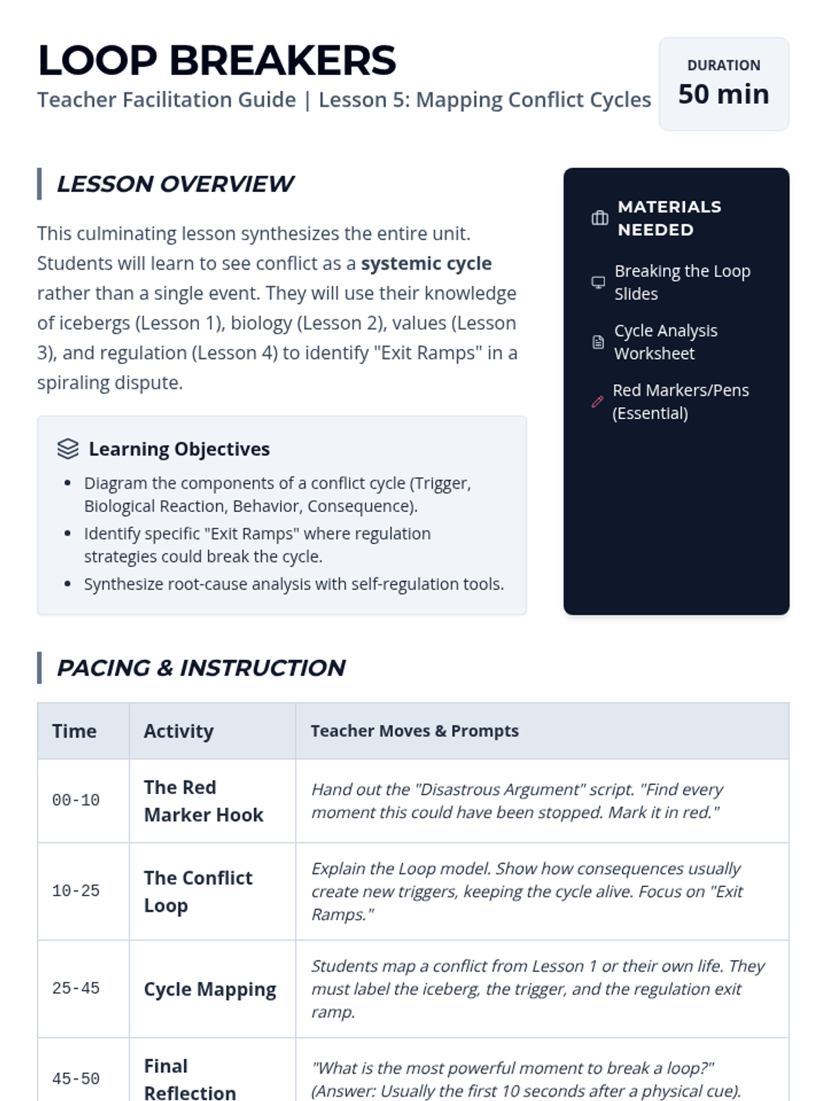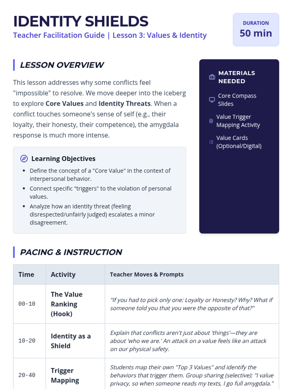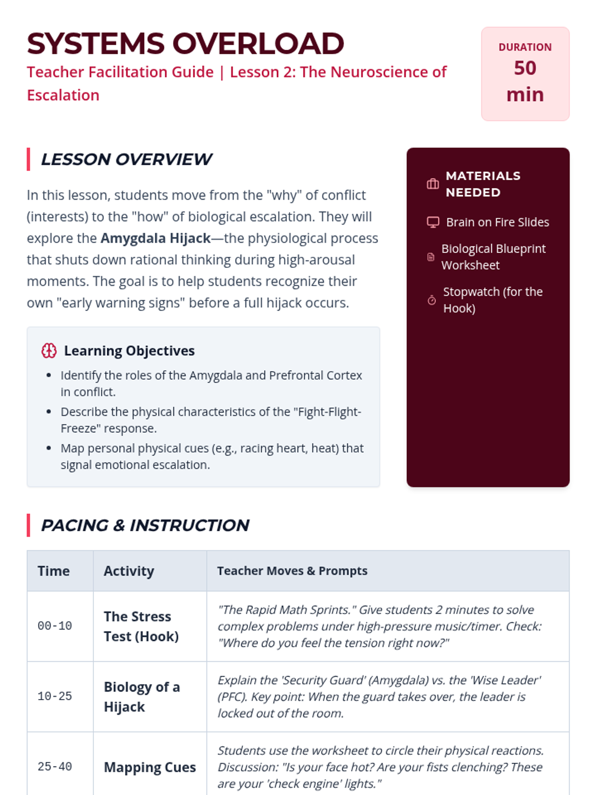 A comprehensive 9th-grade sequence exploring the psychological and biological roots of conflict. Students learn to distinguish visible behaviors from hidden needs, understand the neuroscience of emotional escalation, and develop practical self-regulation strategies to navigate complex interpersonal disputes.
