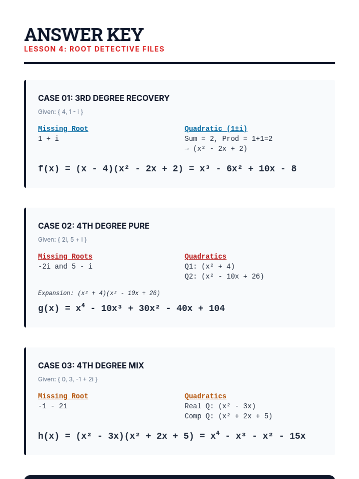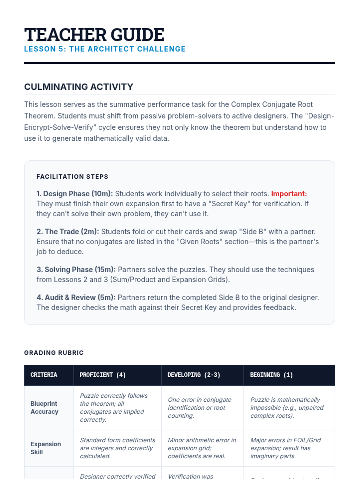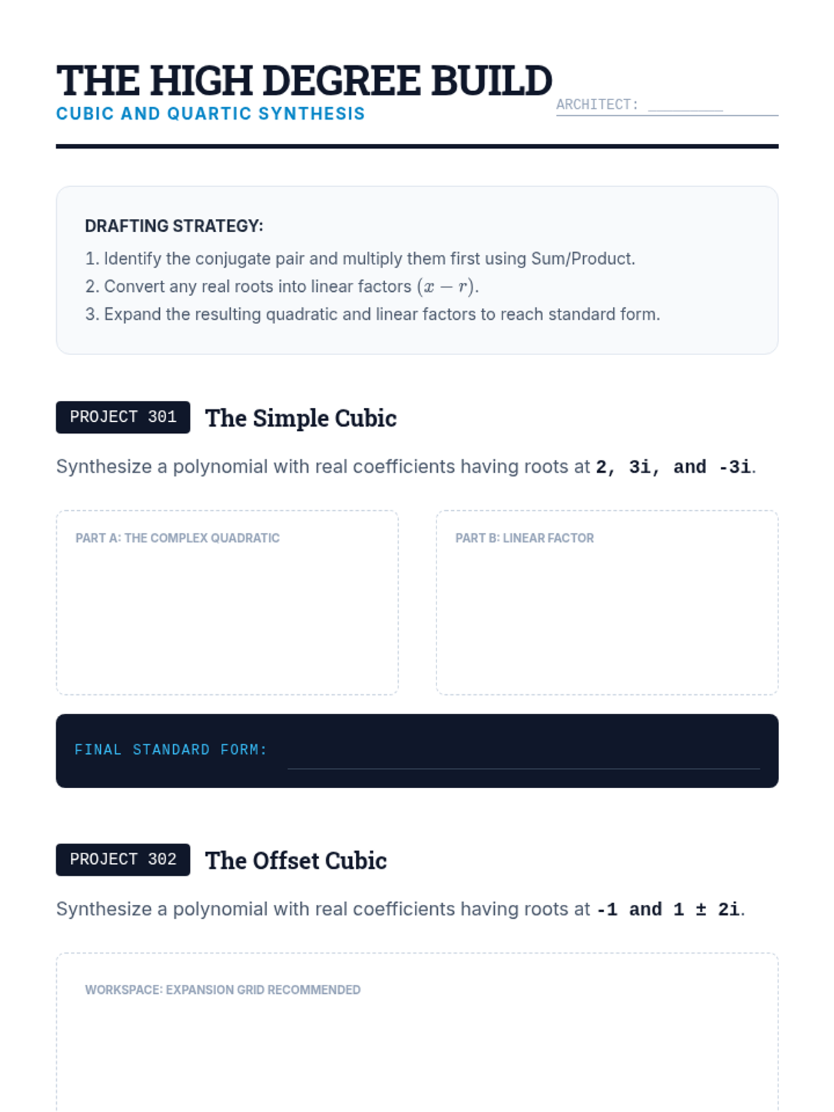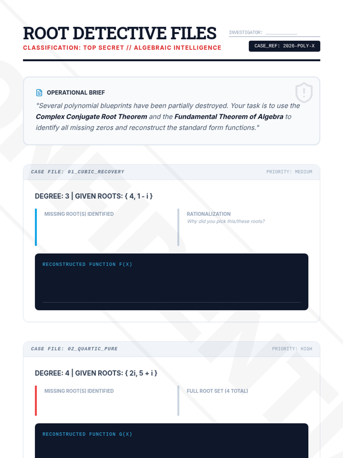 A comprehensive 12th-grade algebra sequence exploring the Complex Conjugate Root Theorem. Students investigate why non-real roots must appear in conjugate pairs to maintain real coefficients and practice constructing polynomials of various degrees from given complex roots.