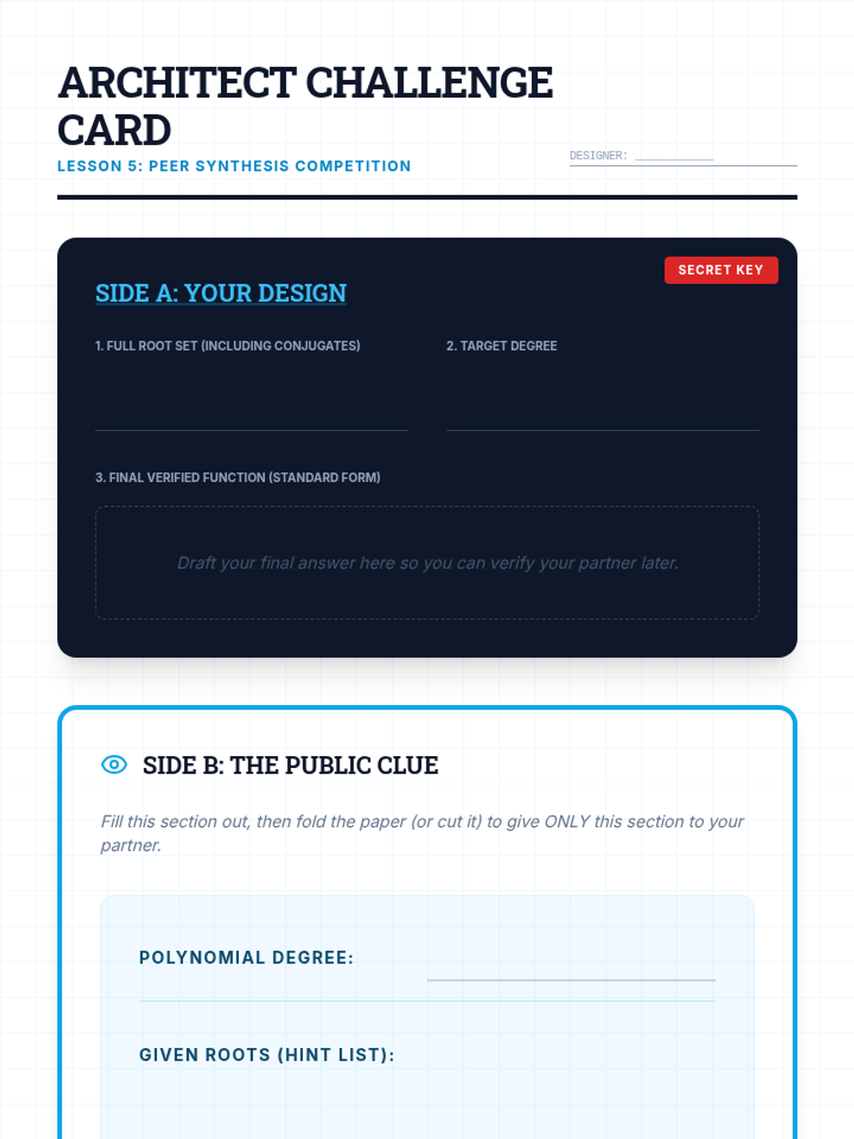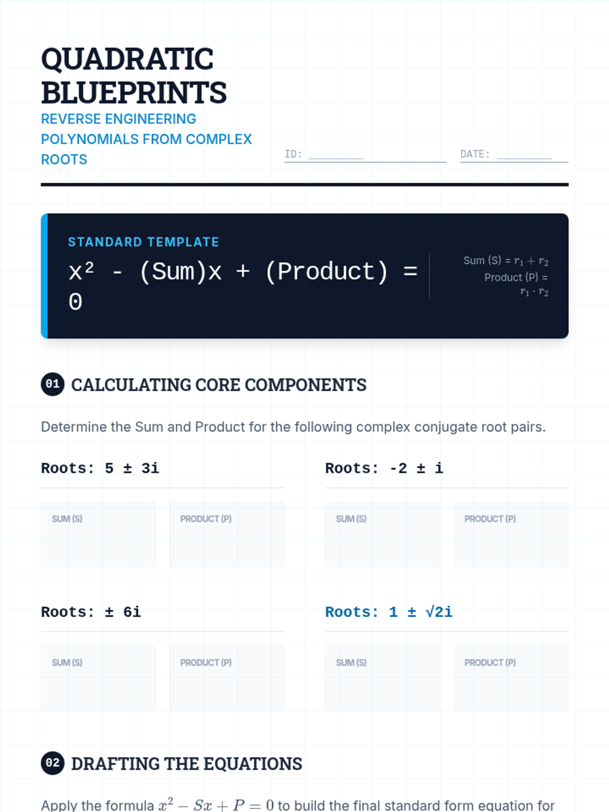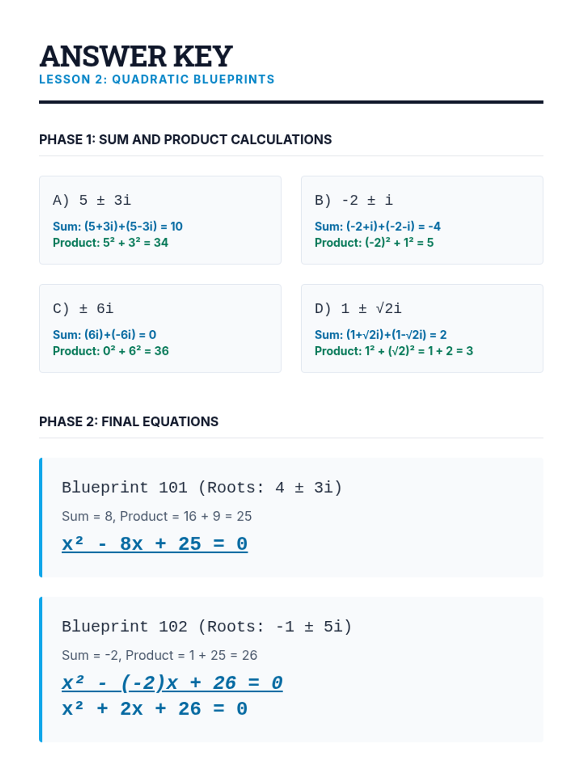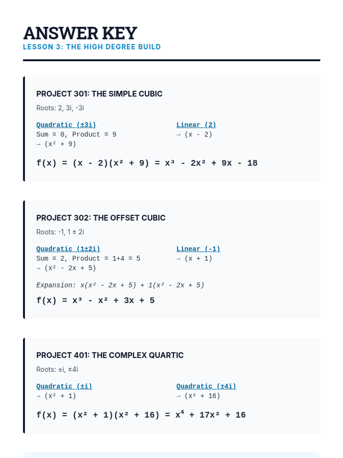 A comprehensive 12th-grade algebra sequence exploring the Complex Conjugate Root Theorem. Students investigate why non-real roots must appear in conjugate pairs to maintain real coefficients and practice constructing polynomials of various degrees from given complex roots.