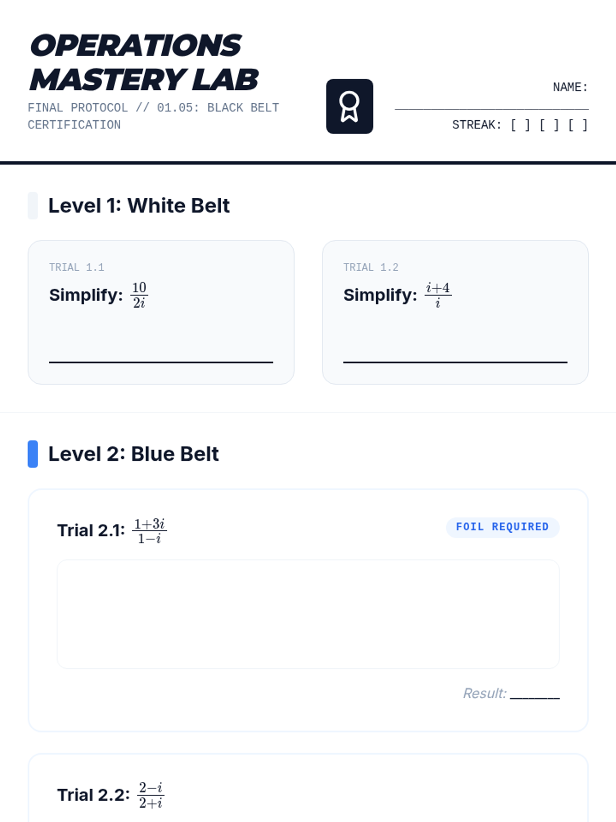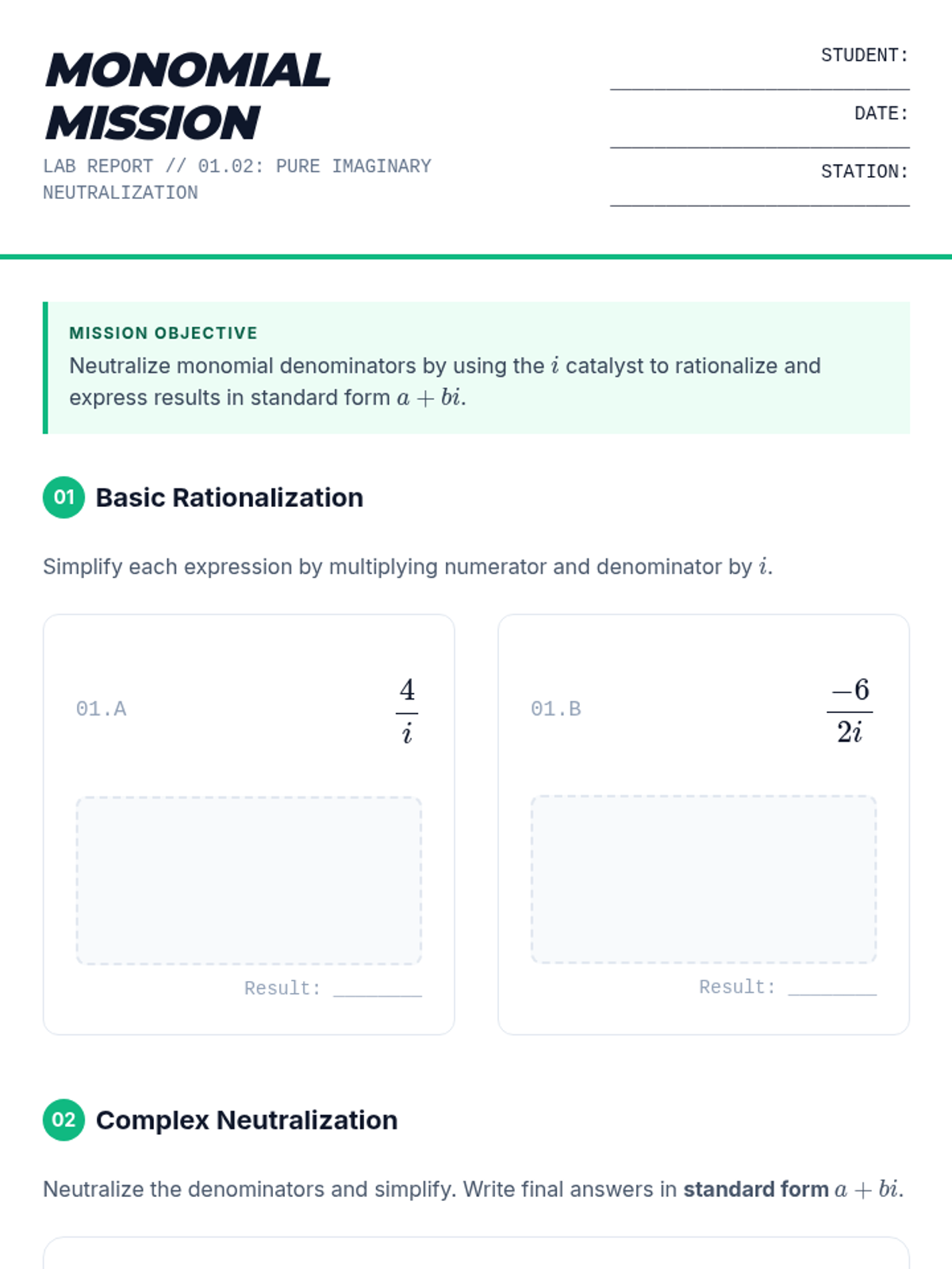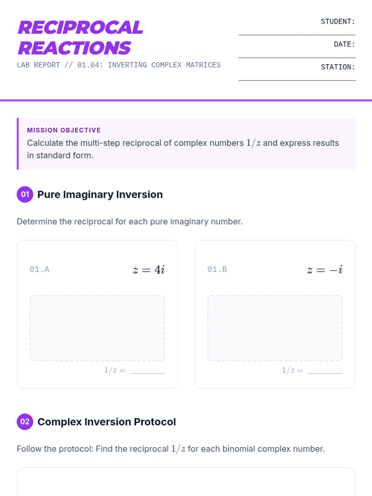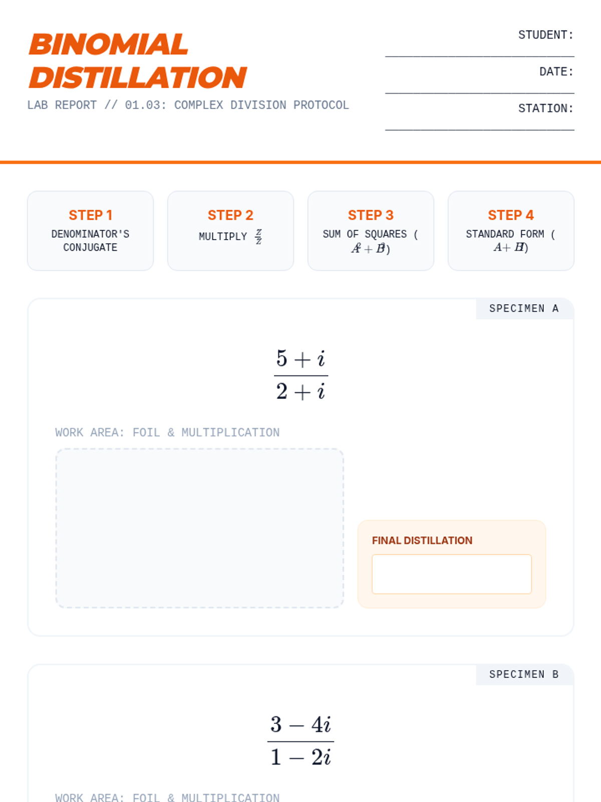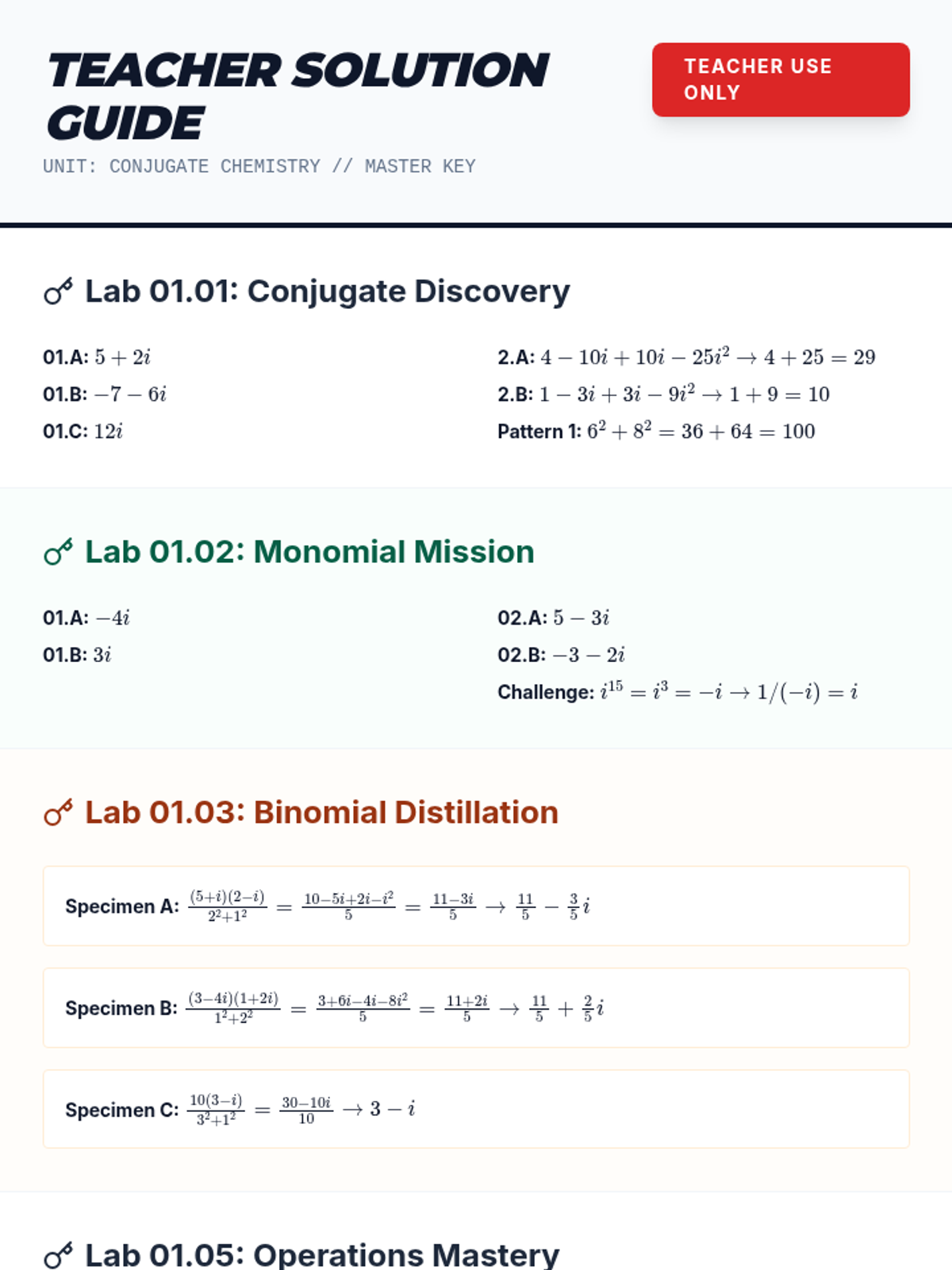 A 5-lesson sequence for 11th-grade students focusing on the properties of complex conjugates and their application in dividing complex numbers. Students progress from basic conjugate multiplication to mastering division with binomial denominators and reciprocals.