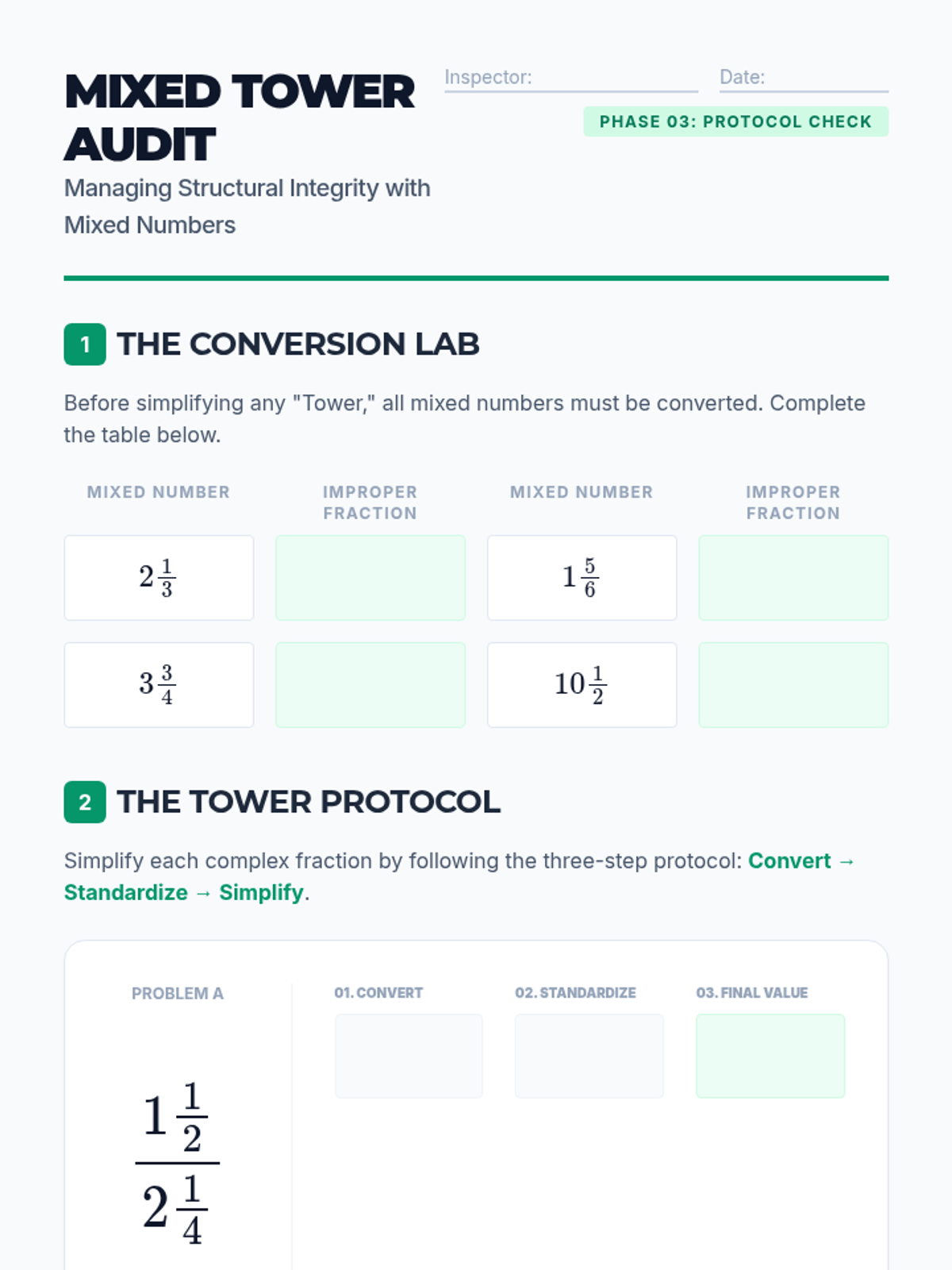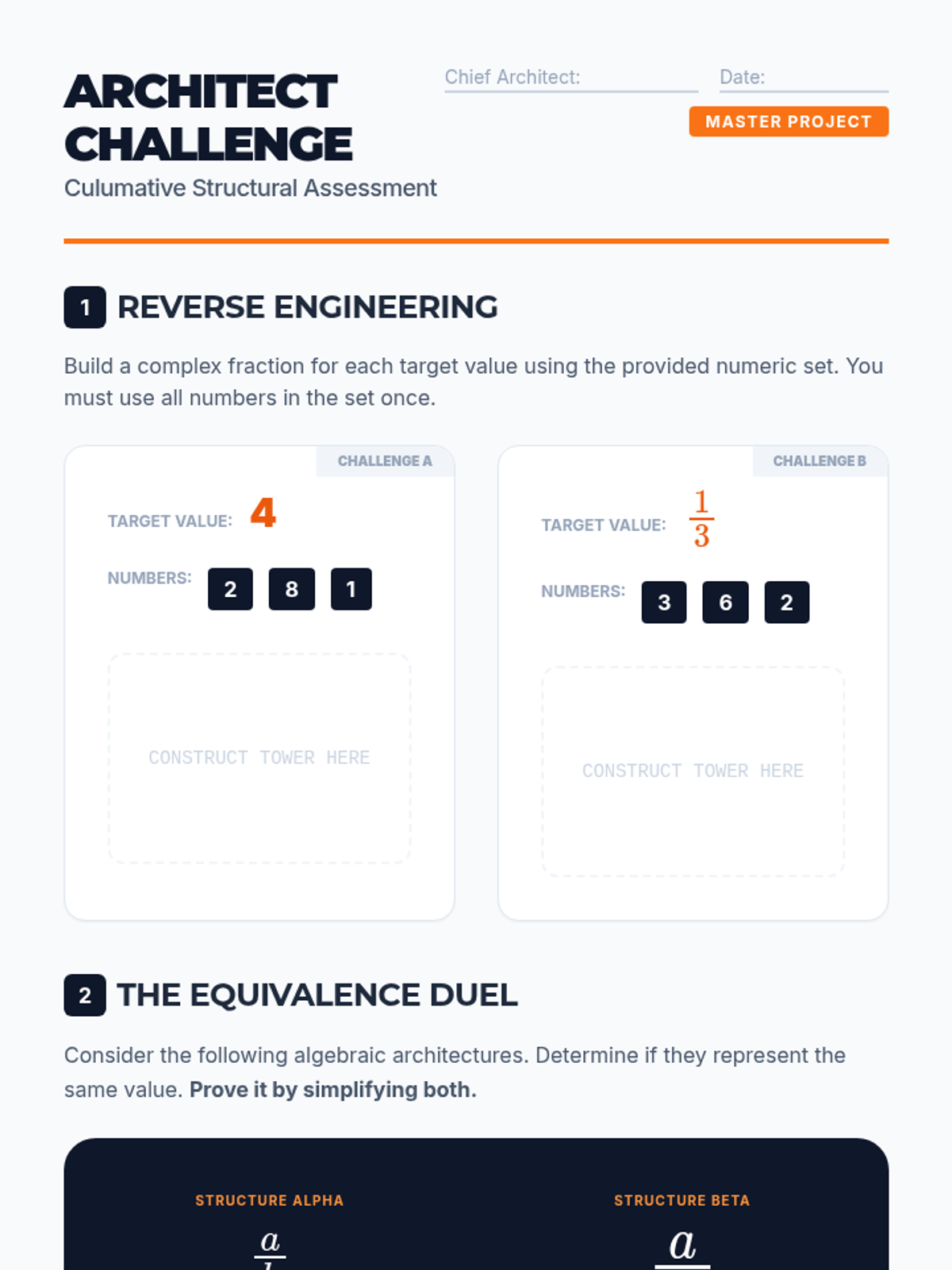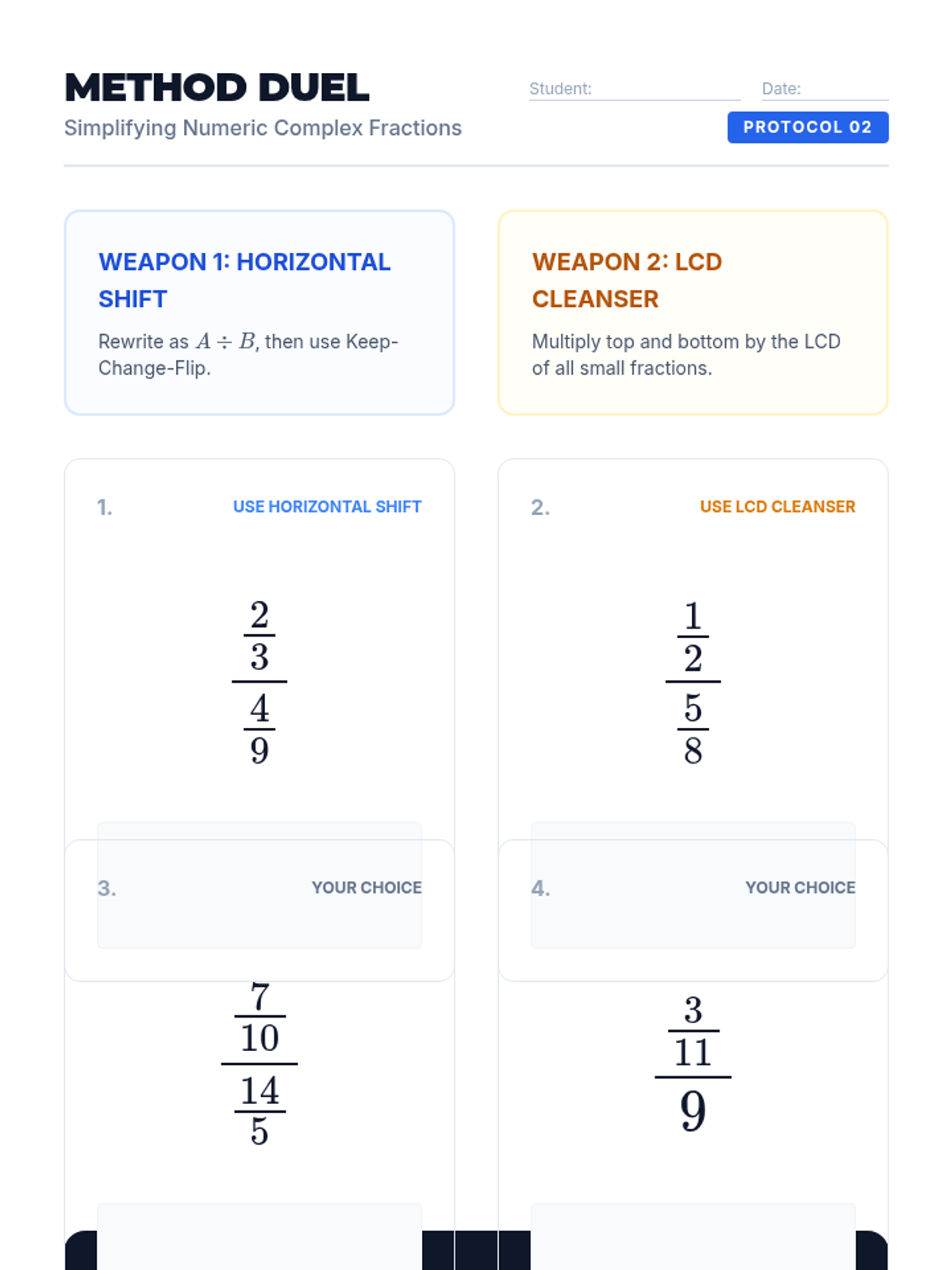 A comprehensive sequence for 9th-grade students transitioning from arithmetic division to algebraic rational expressions using complex fractions. Students explore structural identity, two primary simplification methods, and the introduction of variables.