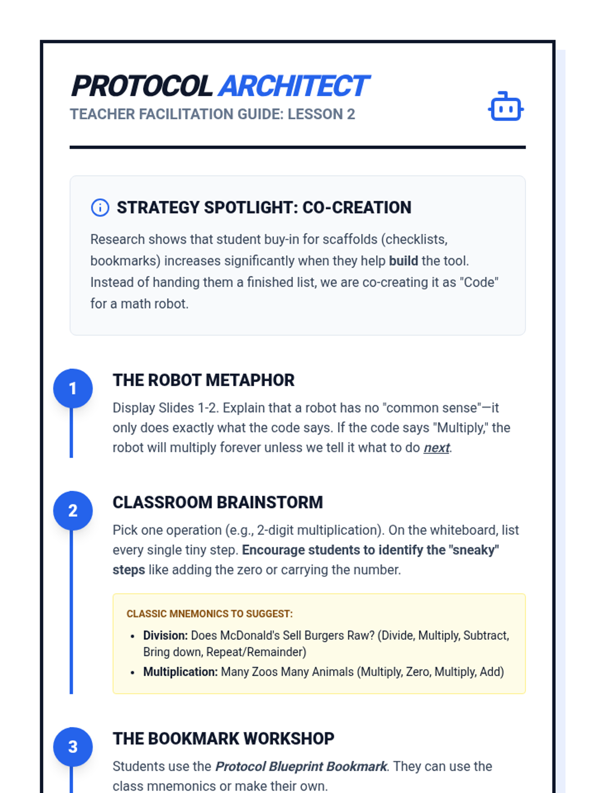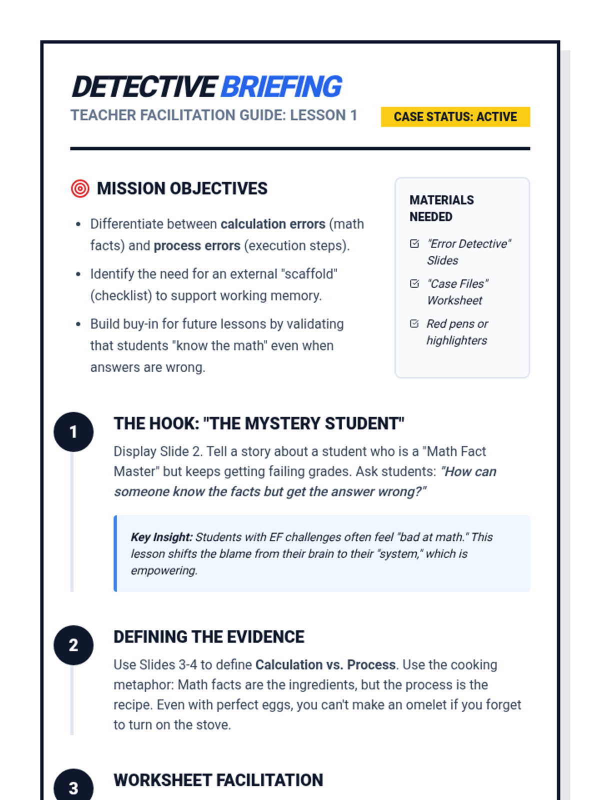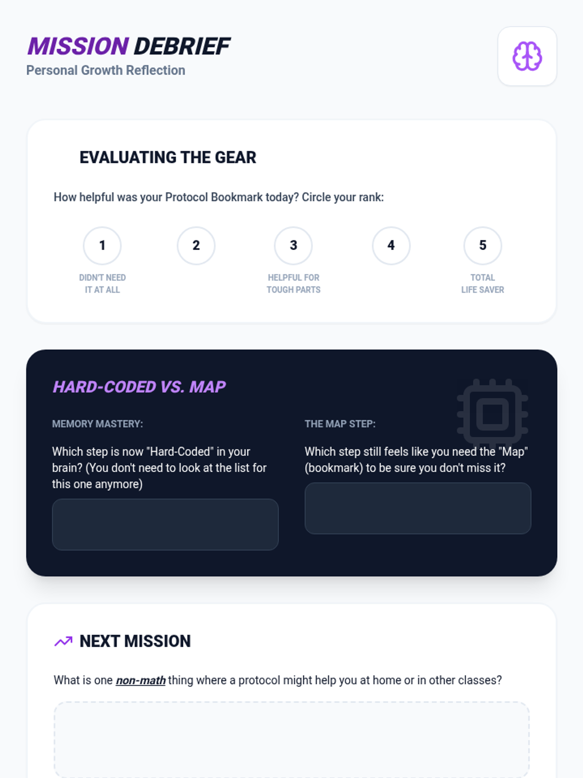 A 5-lesson sequence for 5th-grade students focused on executive function and metacognitive strategies for breaking down complex math problems. Students move from analyzing process errors to co-creating and independently using personalized problem-solving protocols.