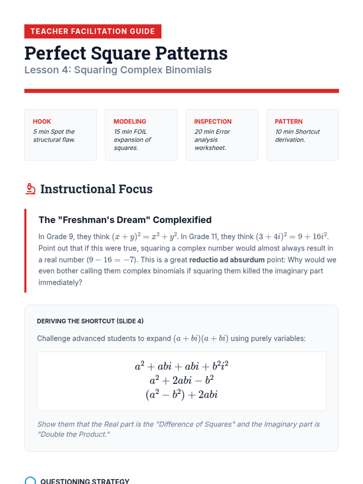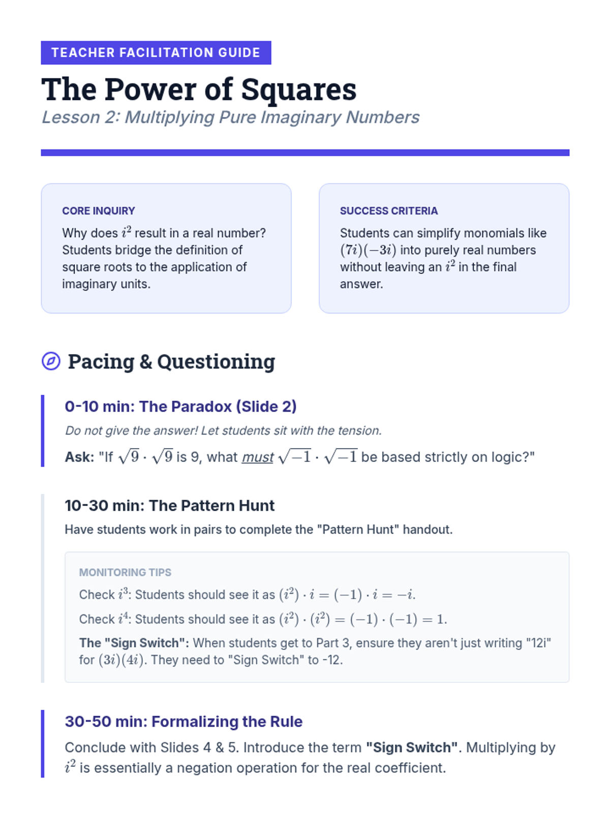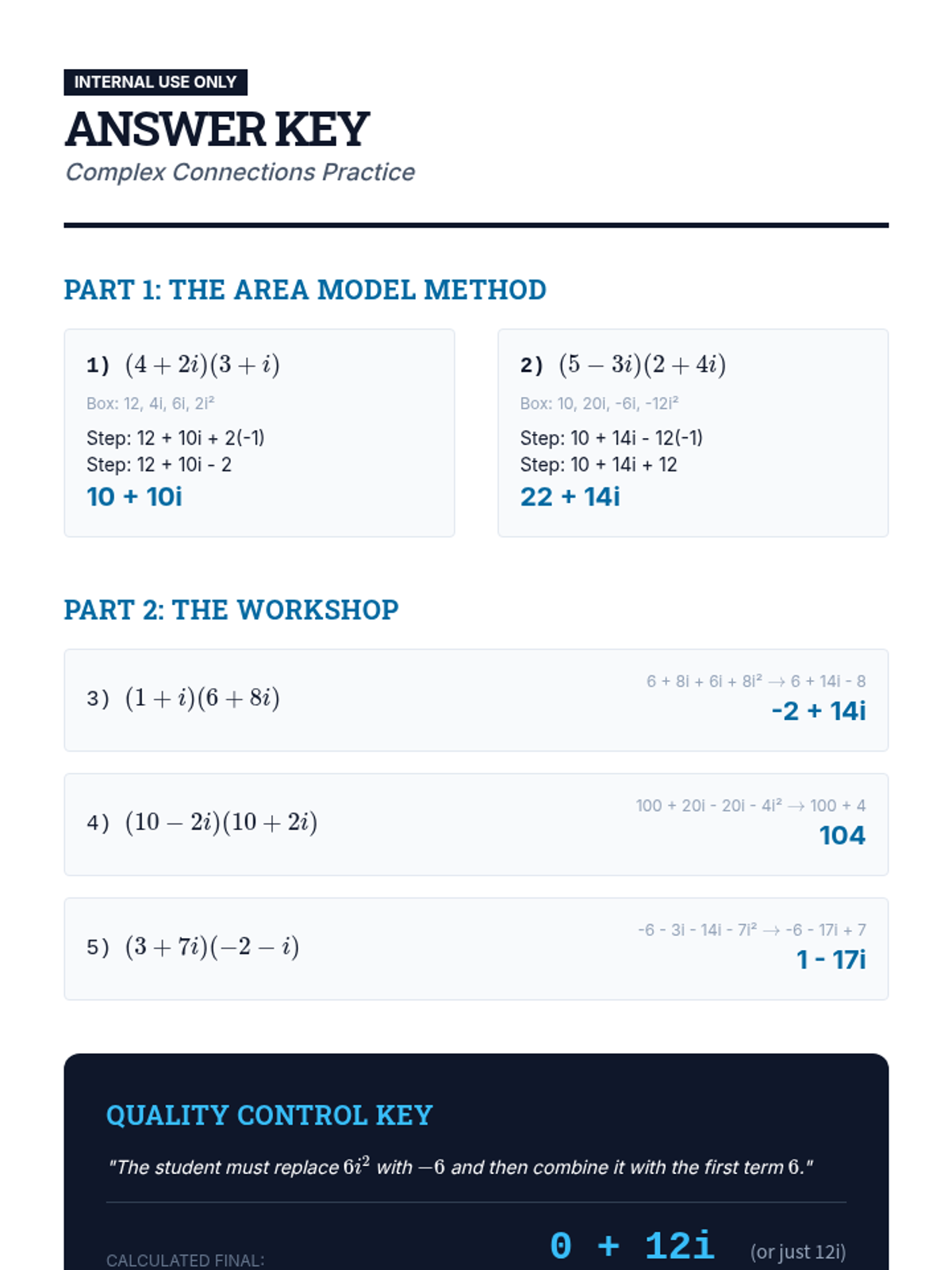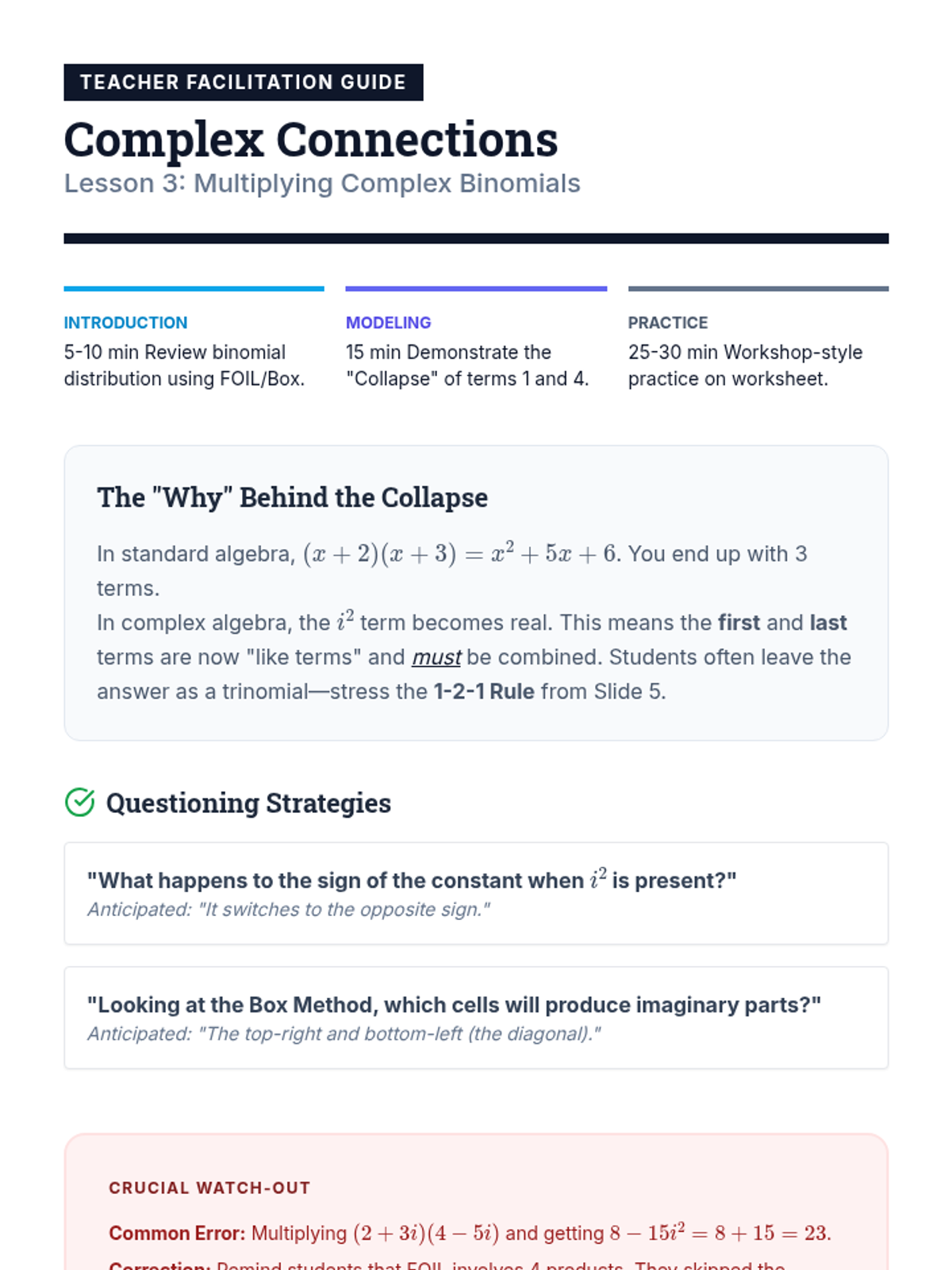 A comprehensive workshop-style unit for 11th Grade Algebra students focusing on adding, subtracting, and multiplying complex numbers. Students learn to manipulate complex expressions by treating 'i' as a variable while applying the fundamental rule that i² = -1.