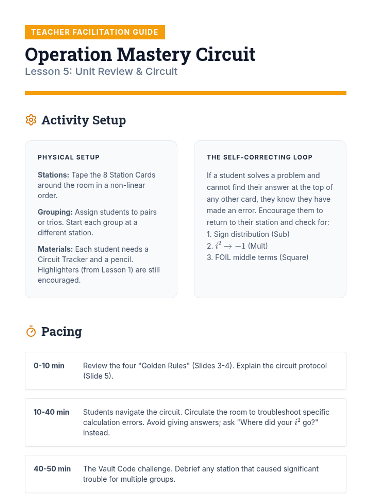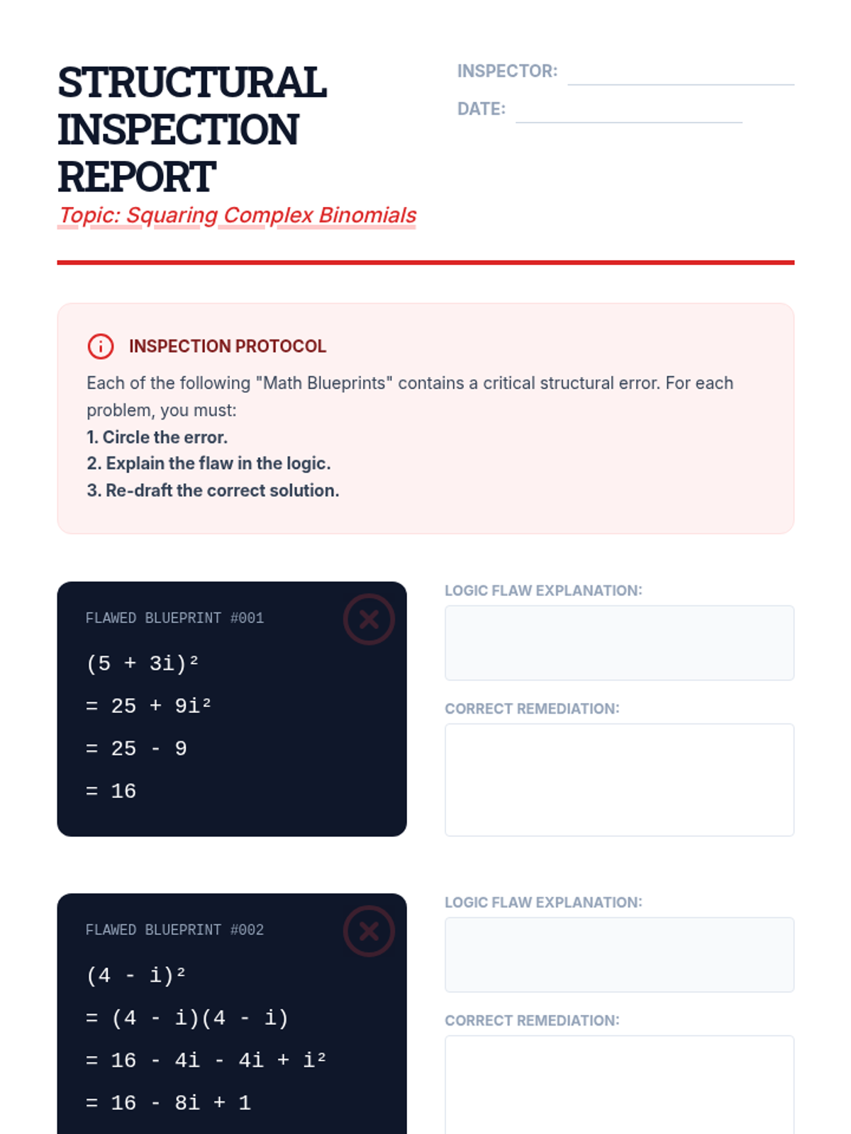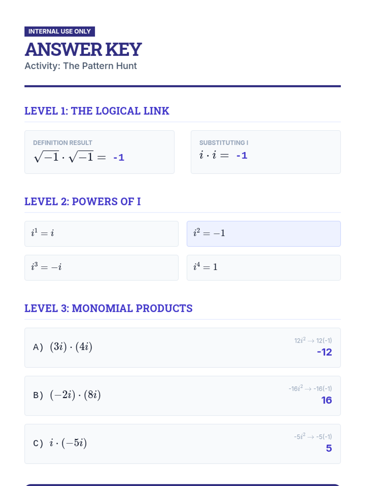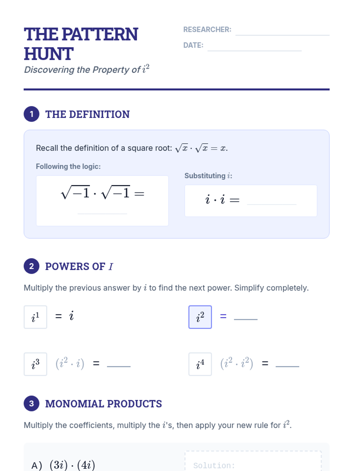 A comprehensive workshop-style unit for 11th Grade Algebra students focusing on adding, subtracting, and multiplying complex numbers. Students learn to manipulate complex expressions by treating 'i' as a variable while applying the fundamental rule that i² = -1.