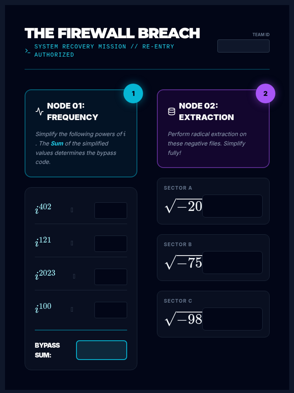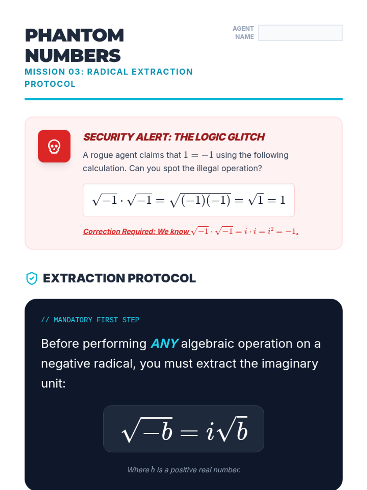 A game-based exploration of the imaginary unit $i$, focusing on its cyclic powers and the simplification of radicals with negative radicands. Students move from discovery to mastery through tournaments and escape-room style puzzles.