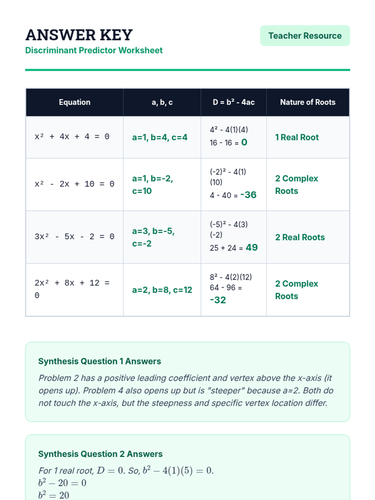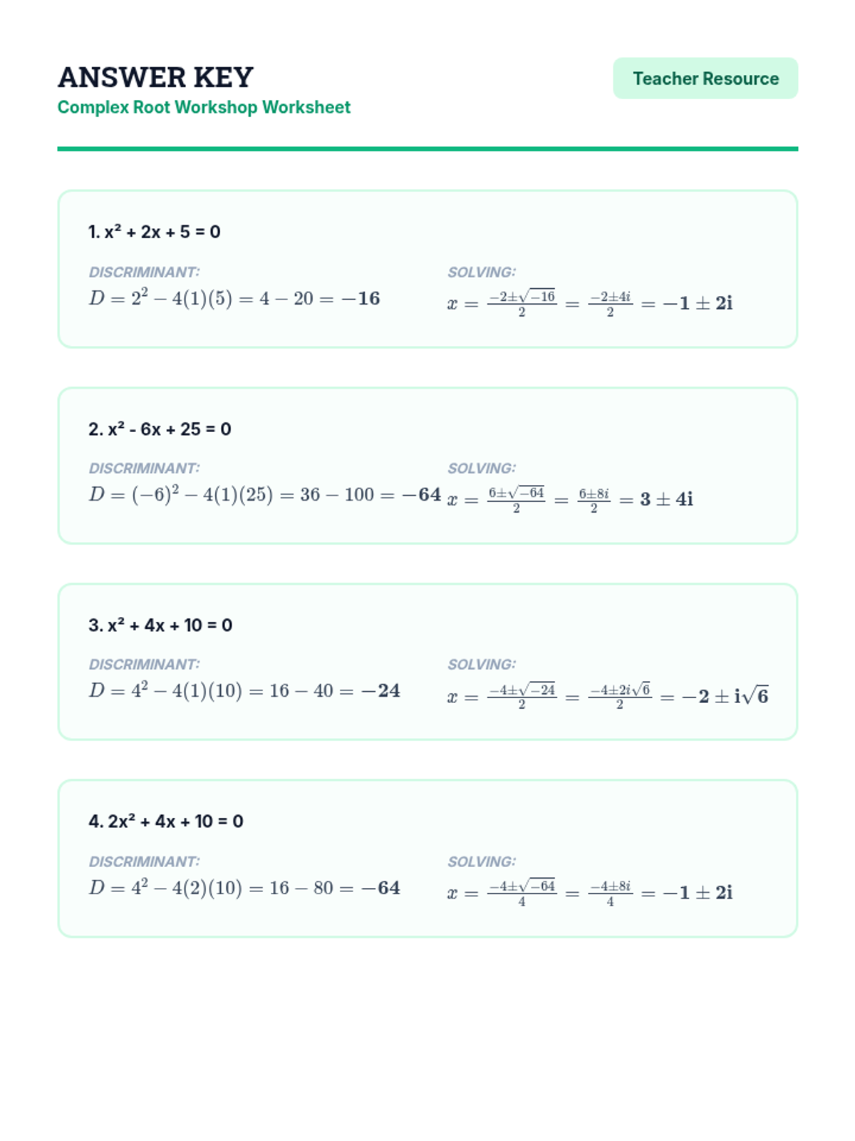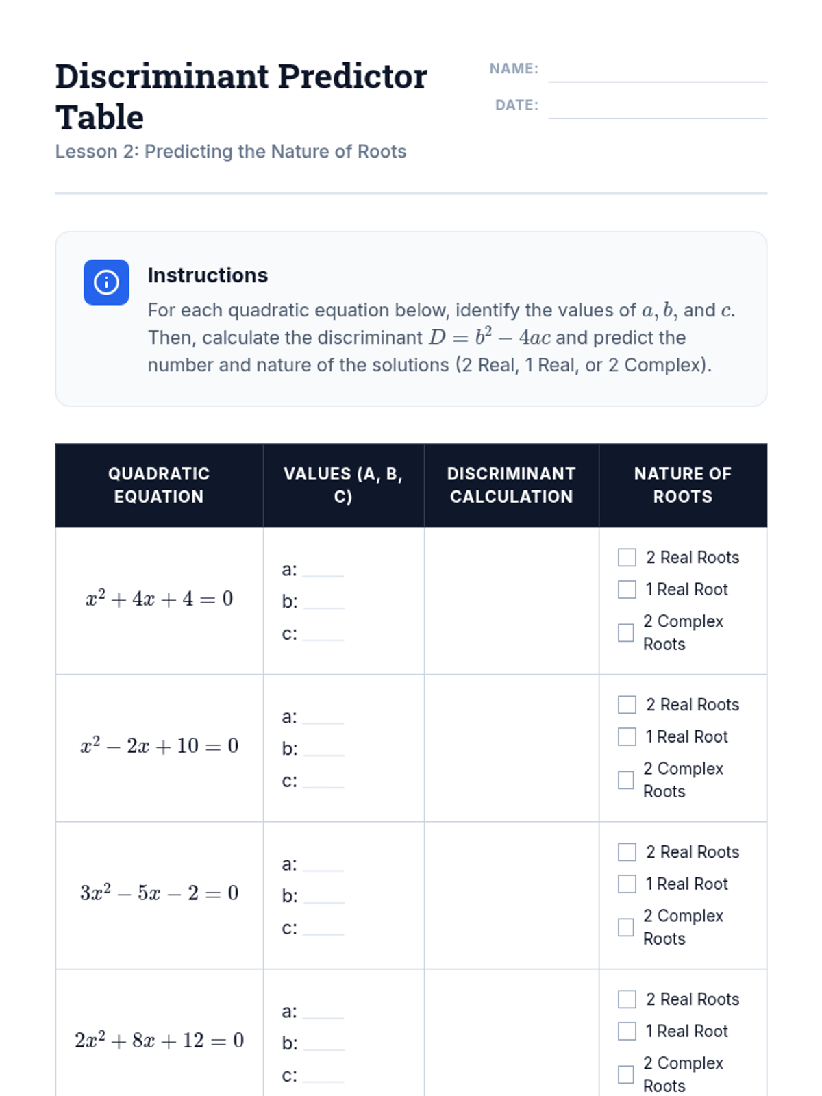 This sequence guides 10th-grade students through the transition from real to complex solutions in quadratic equations. Students explore the geometric meaning of non-real roots, use the discriminant as a predictive tool, and master algebraic techniques like the Quadratic Formula and Completing the Square to find exact complex solutions.