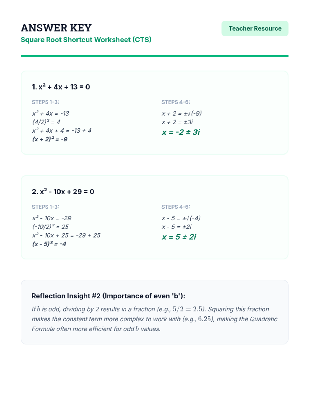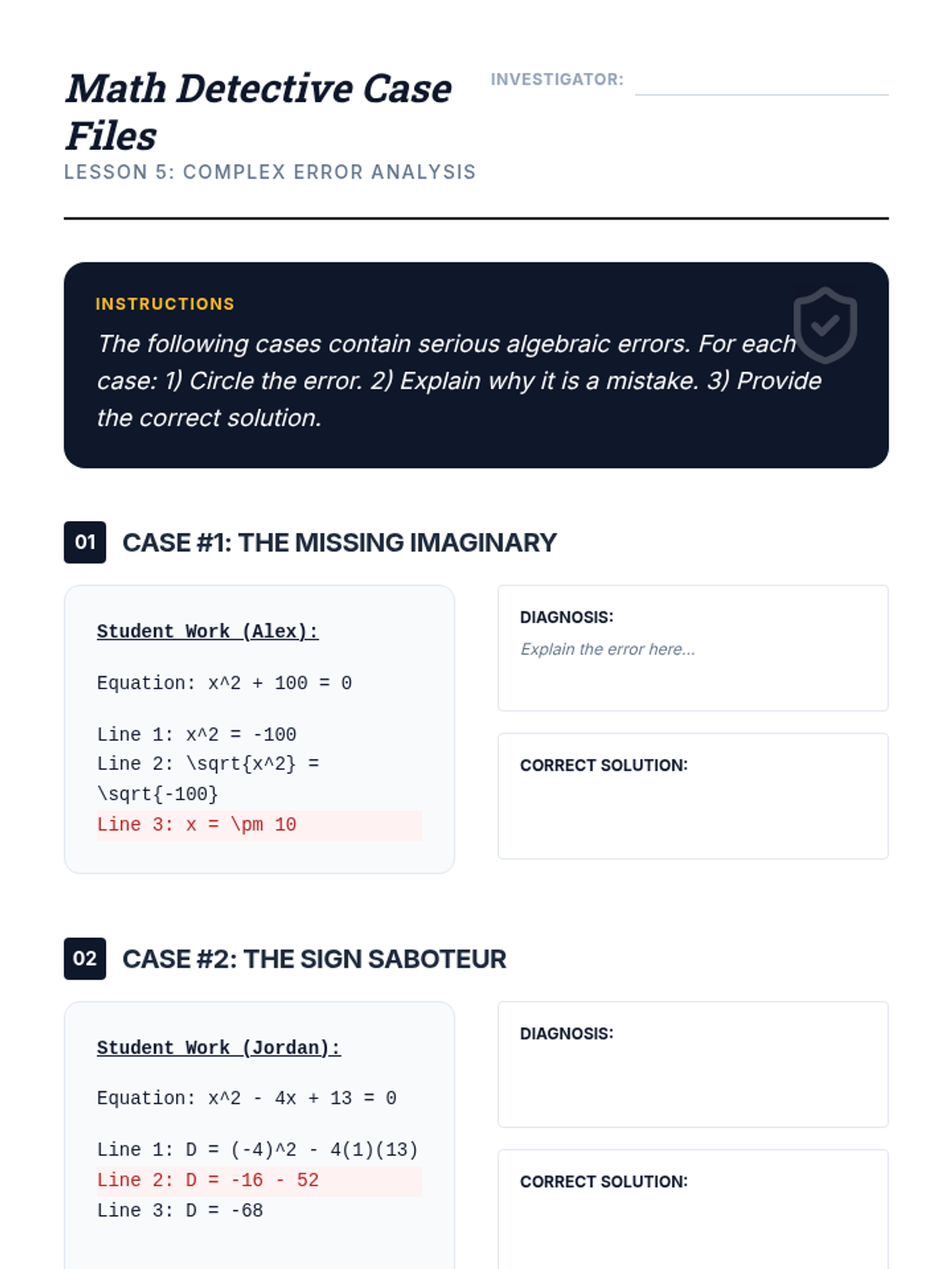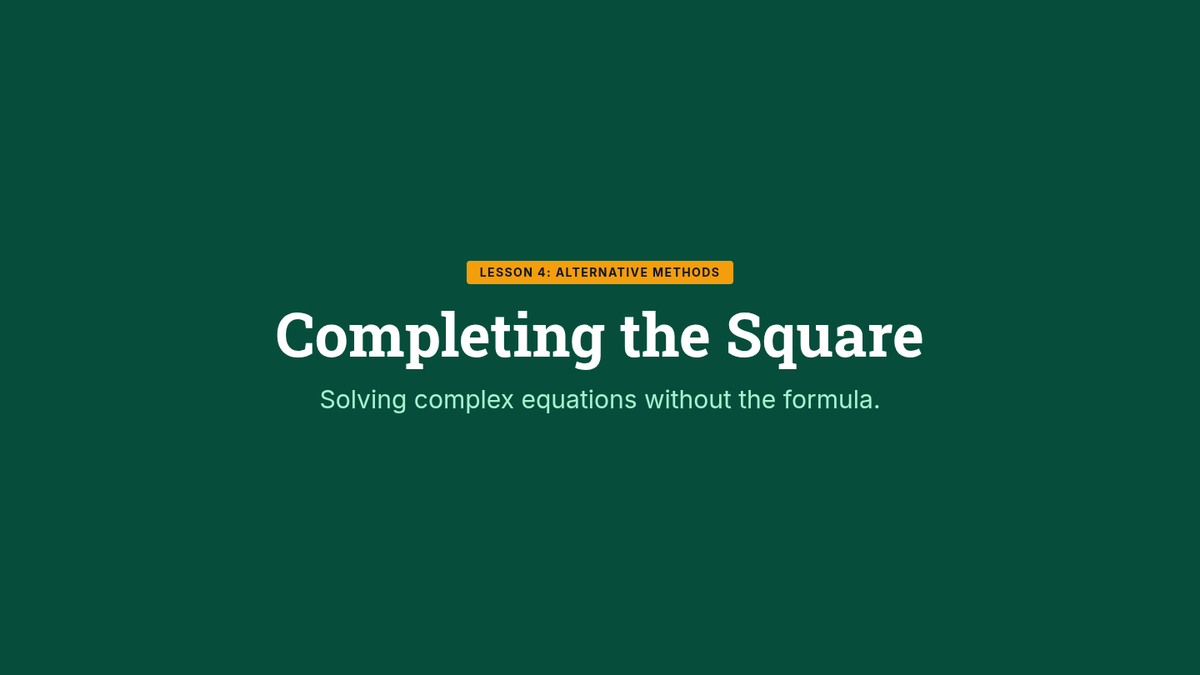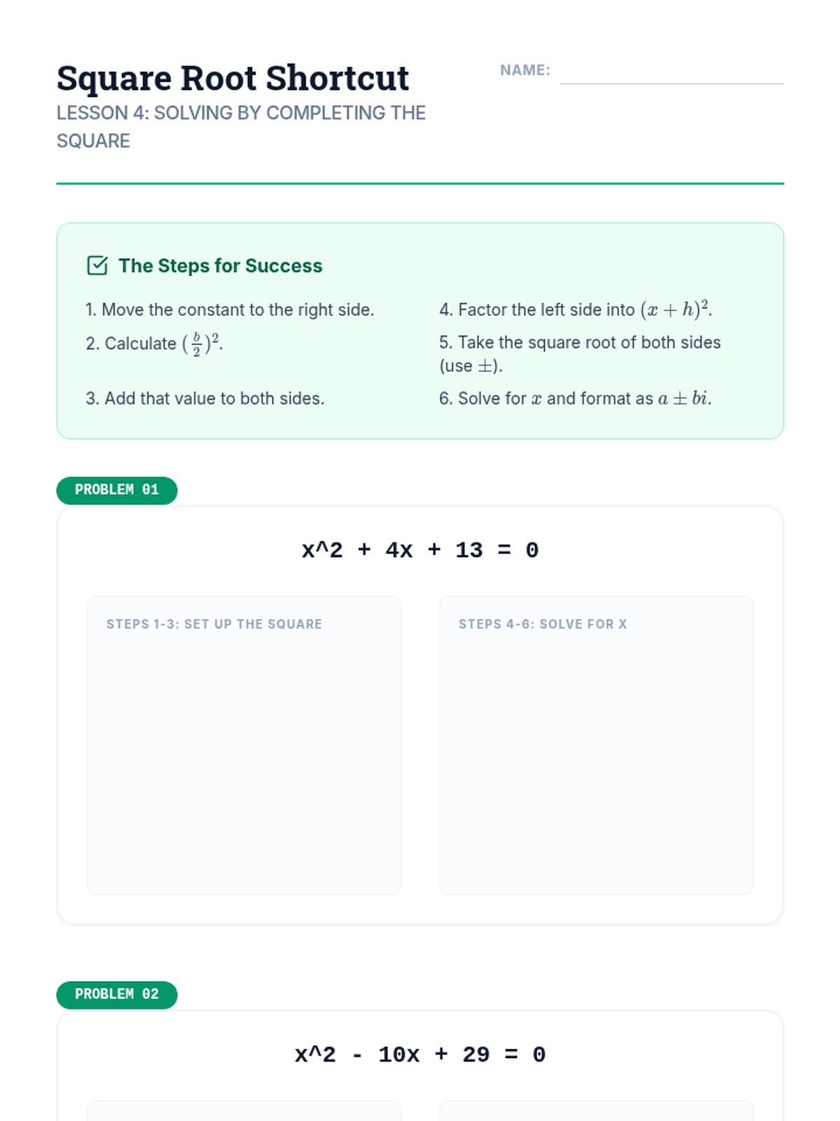 This sequence guides 10th-grade students through the transition from real to complex solutions in quadratic equations. Students explore the geometric meaning of non-real roots, use the discriminant as a predictive tool, and master algebraic techniques like the Quadratic Formula and Completing the Square to find exact complex solutions.