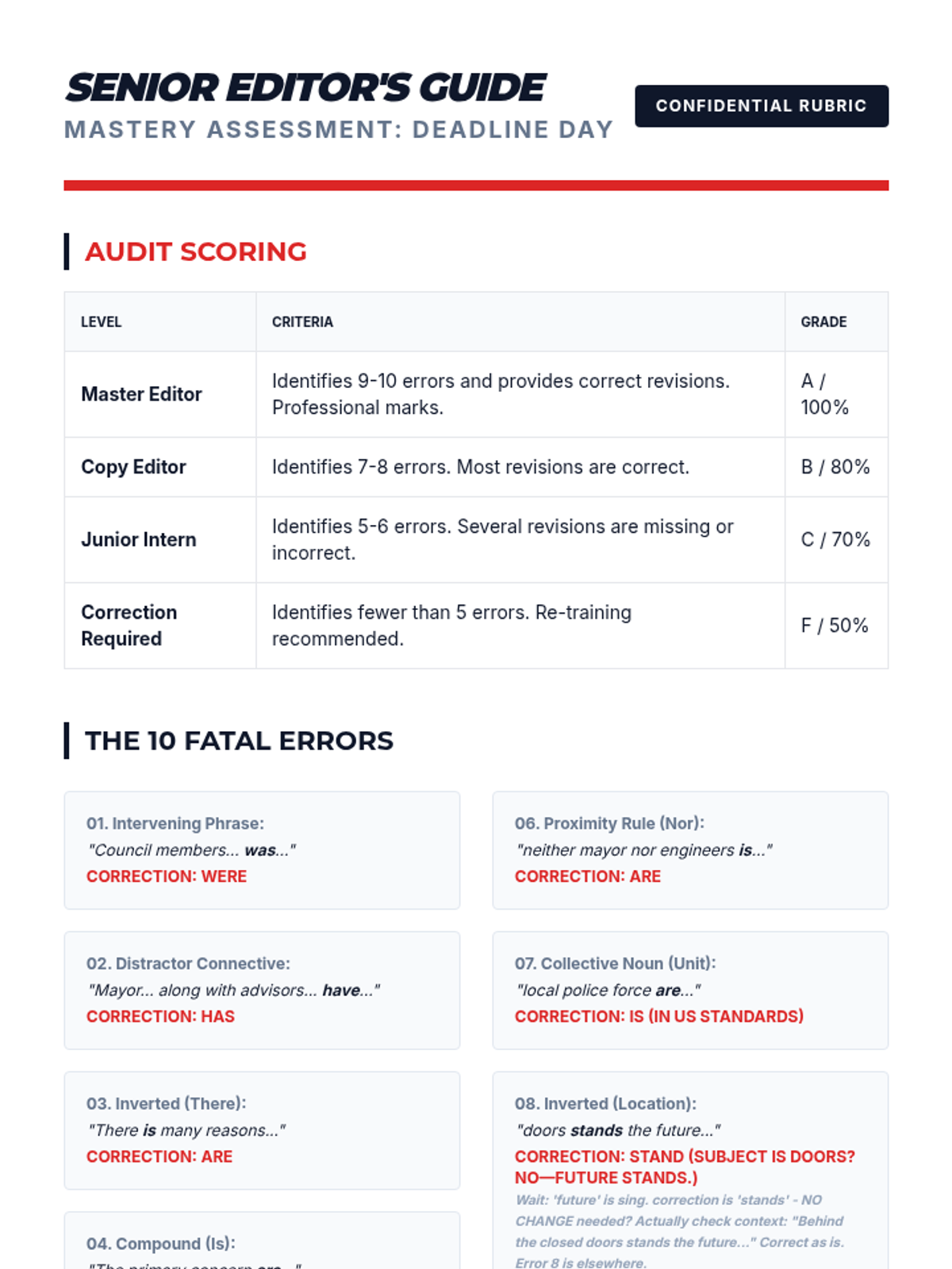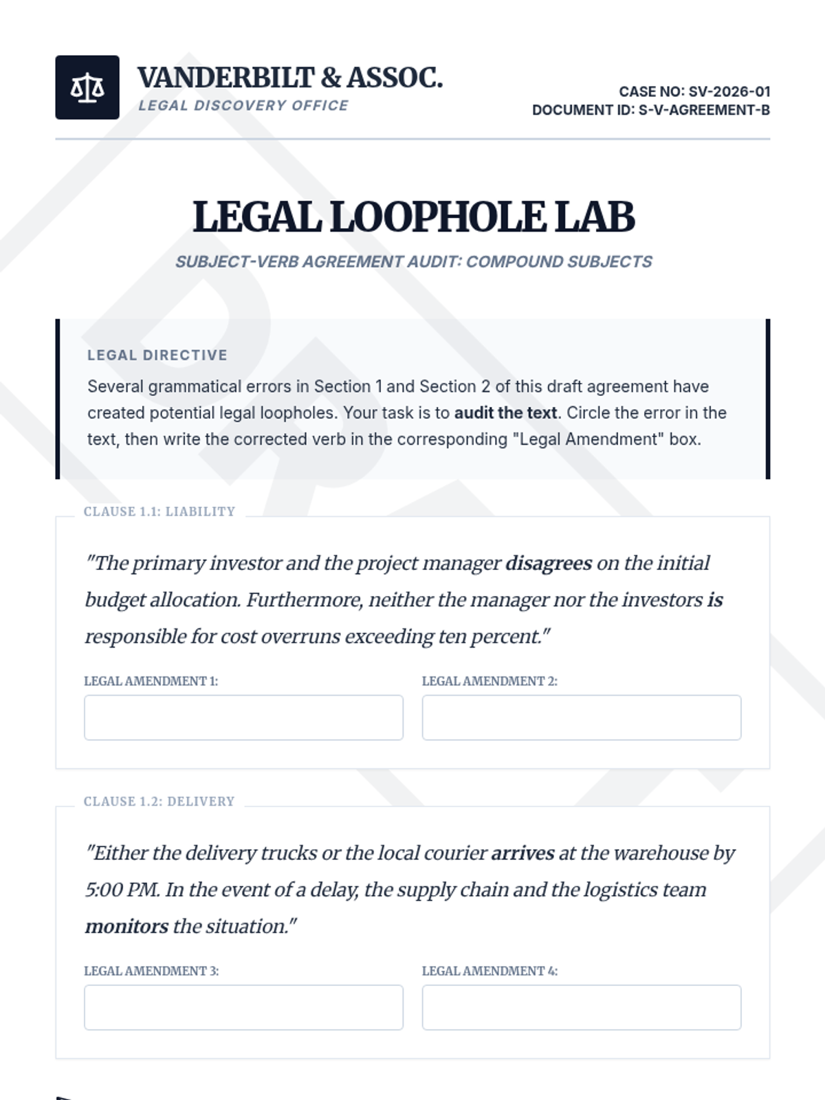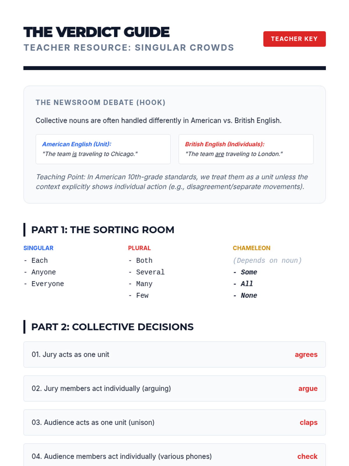 A high-stakes grammar sequence for 10th graders focusing on subject-verb agreement in complex syntactic environments. Students move from isolating subjects in long sentences to editing professional-grade texts under pressure.