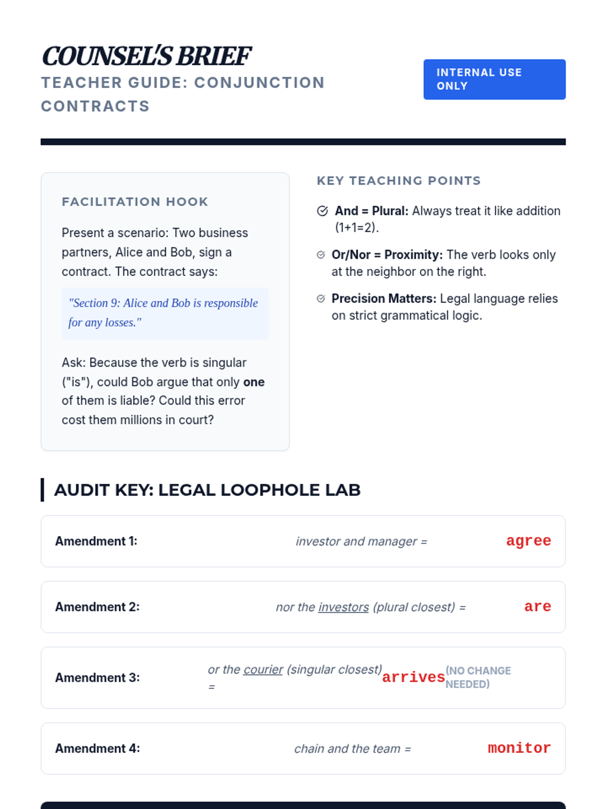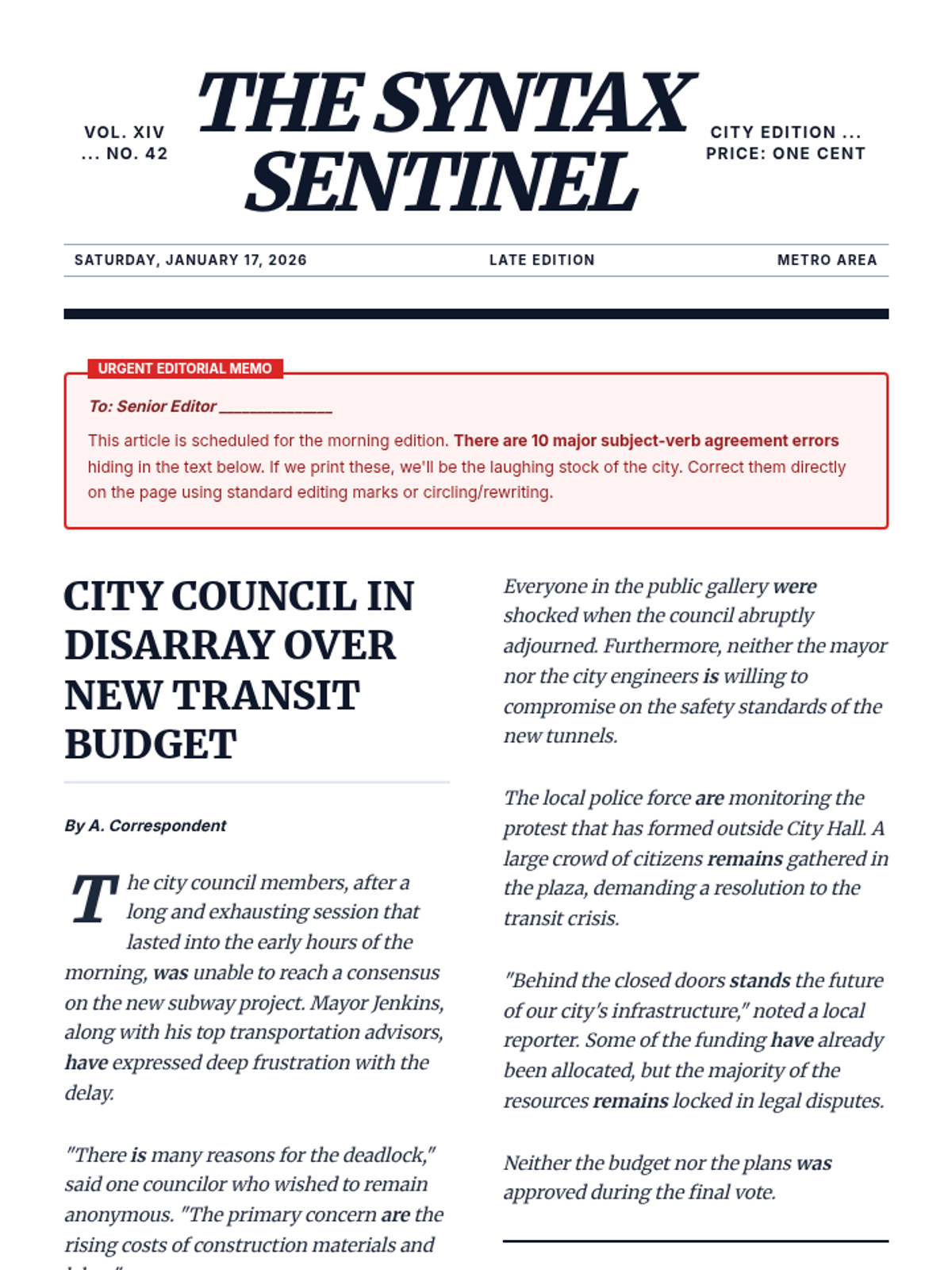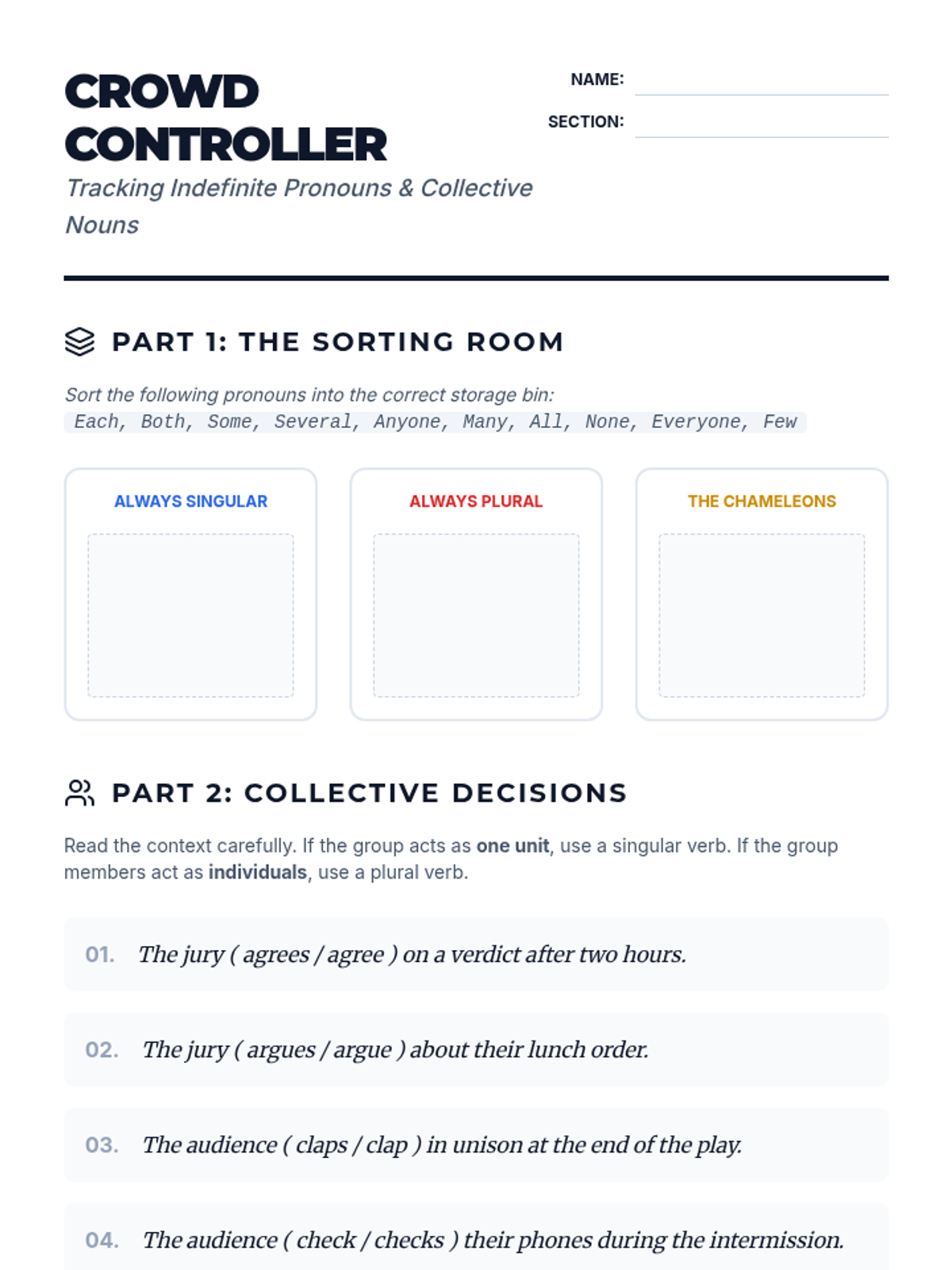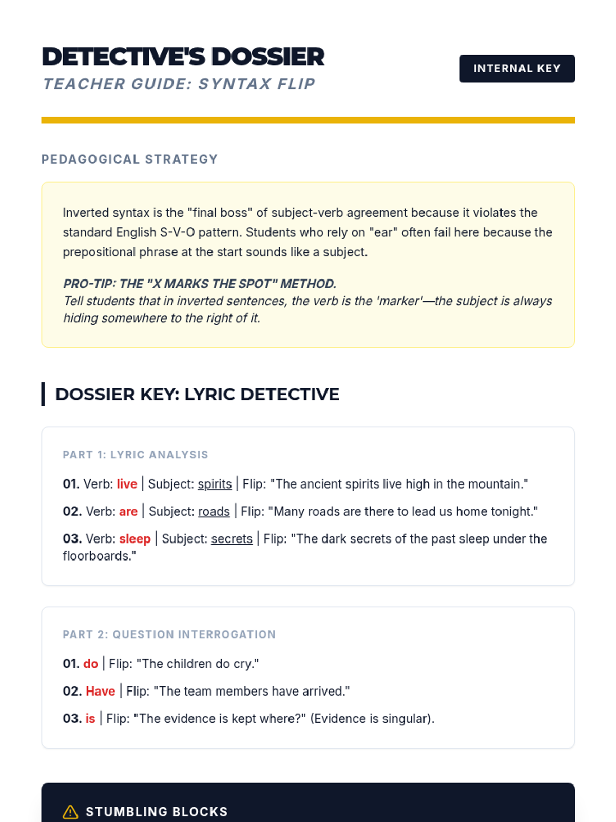 A high-stakes grammar sequence for 10th graders focusing on subject-verb agreement in complex syntactic environments. Students move from isolating subjects in long sentences to editing professional-grade texts under pressure.