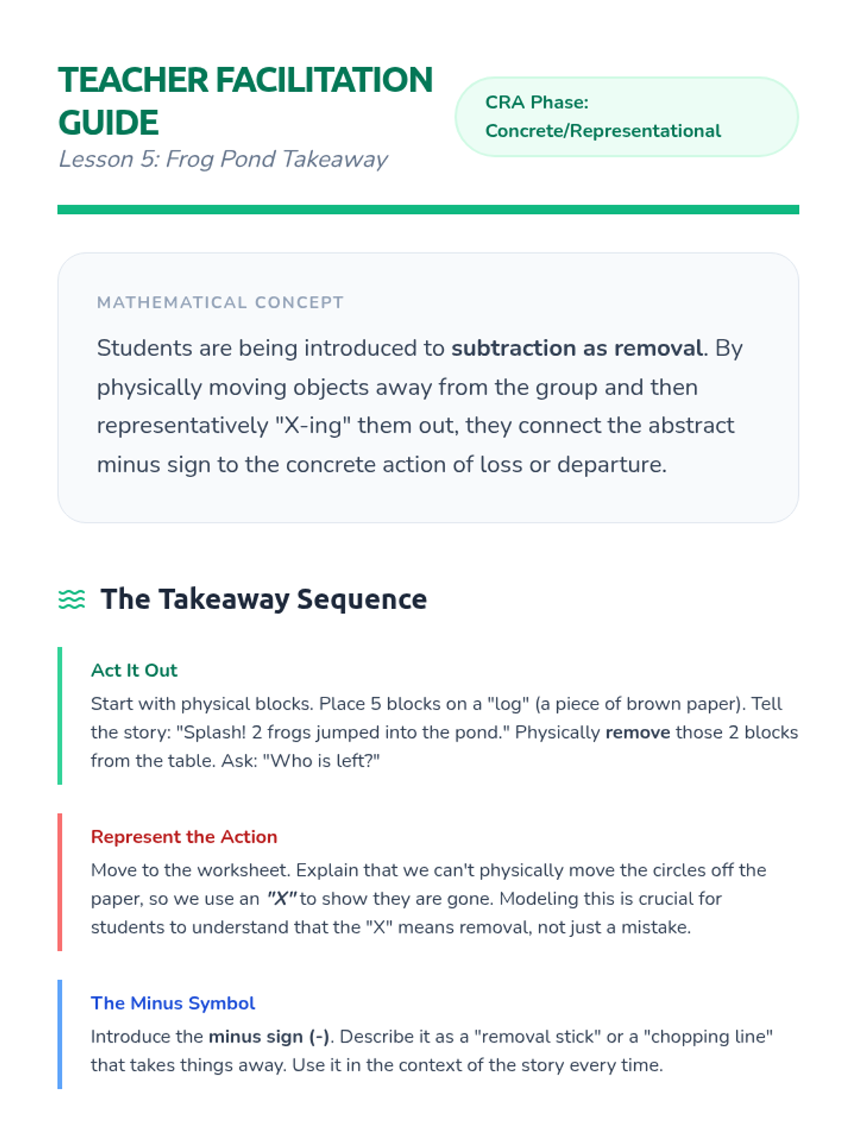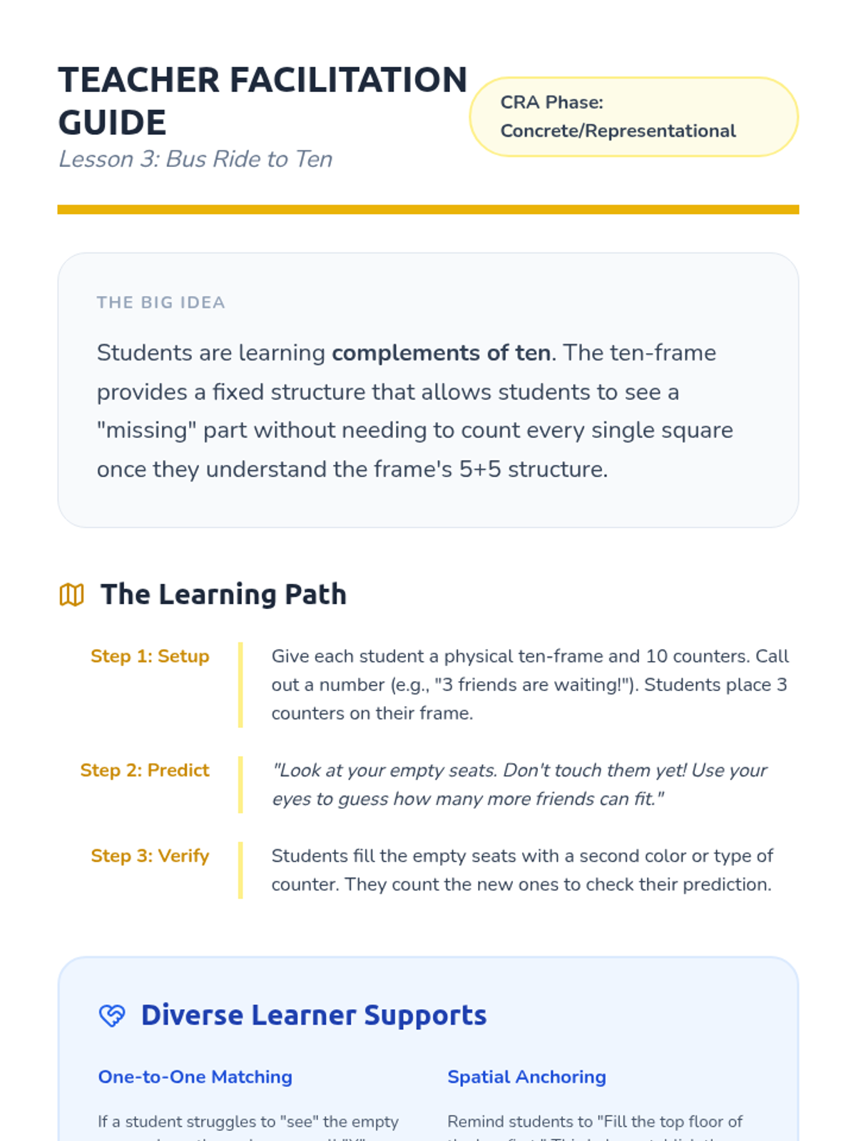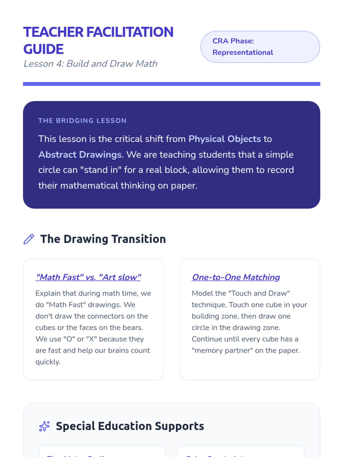 This Kindergarten math sequence uses the Concrete-Representational-Abstract (CRA) framework to teach composing and decomposing numbers. Students progress from tactile manipulation of physical objects to visual representations and early symbolic equations, specifically supporting diverse learners through sensory-rich mathematical exploration.