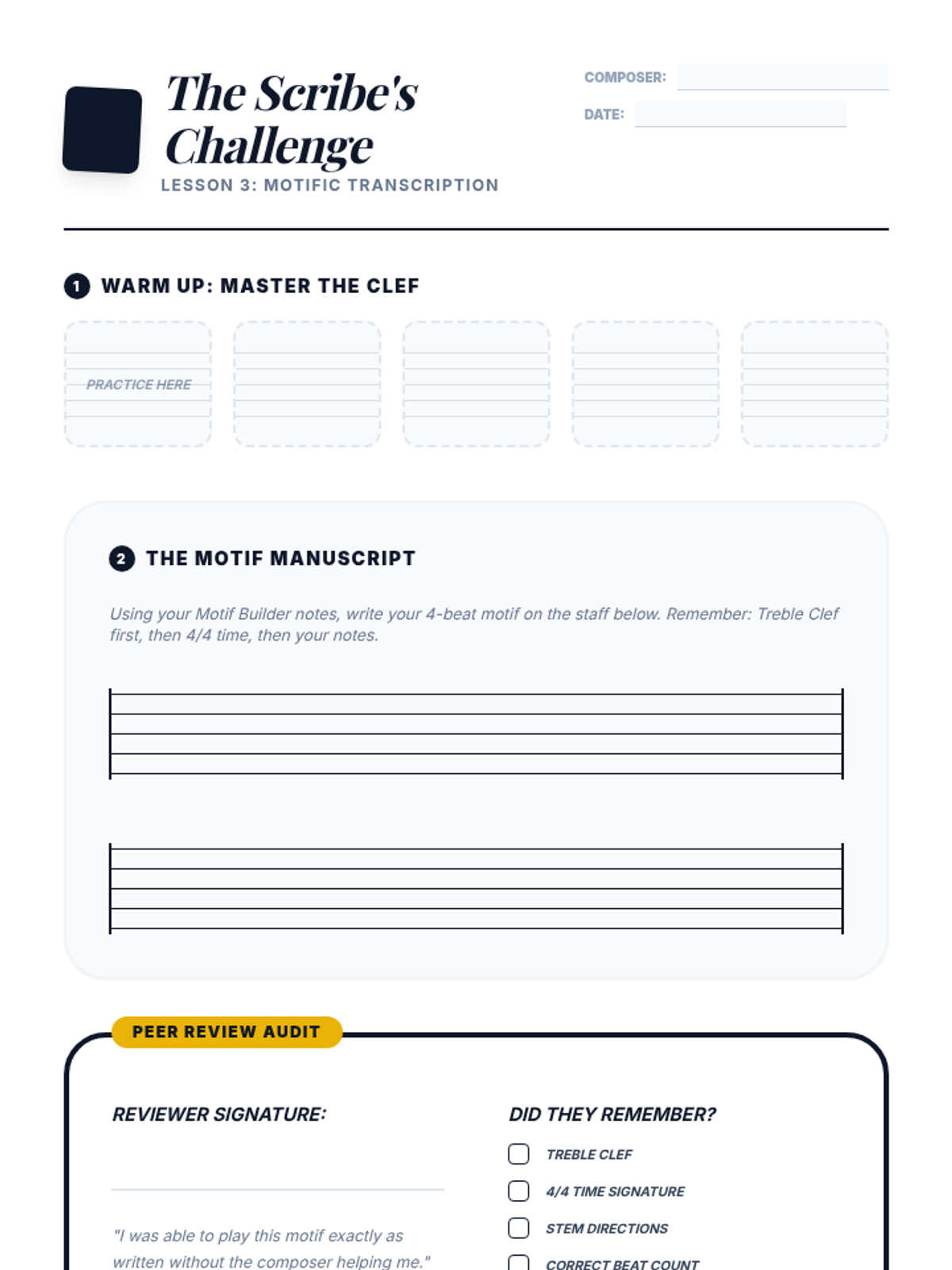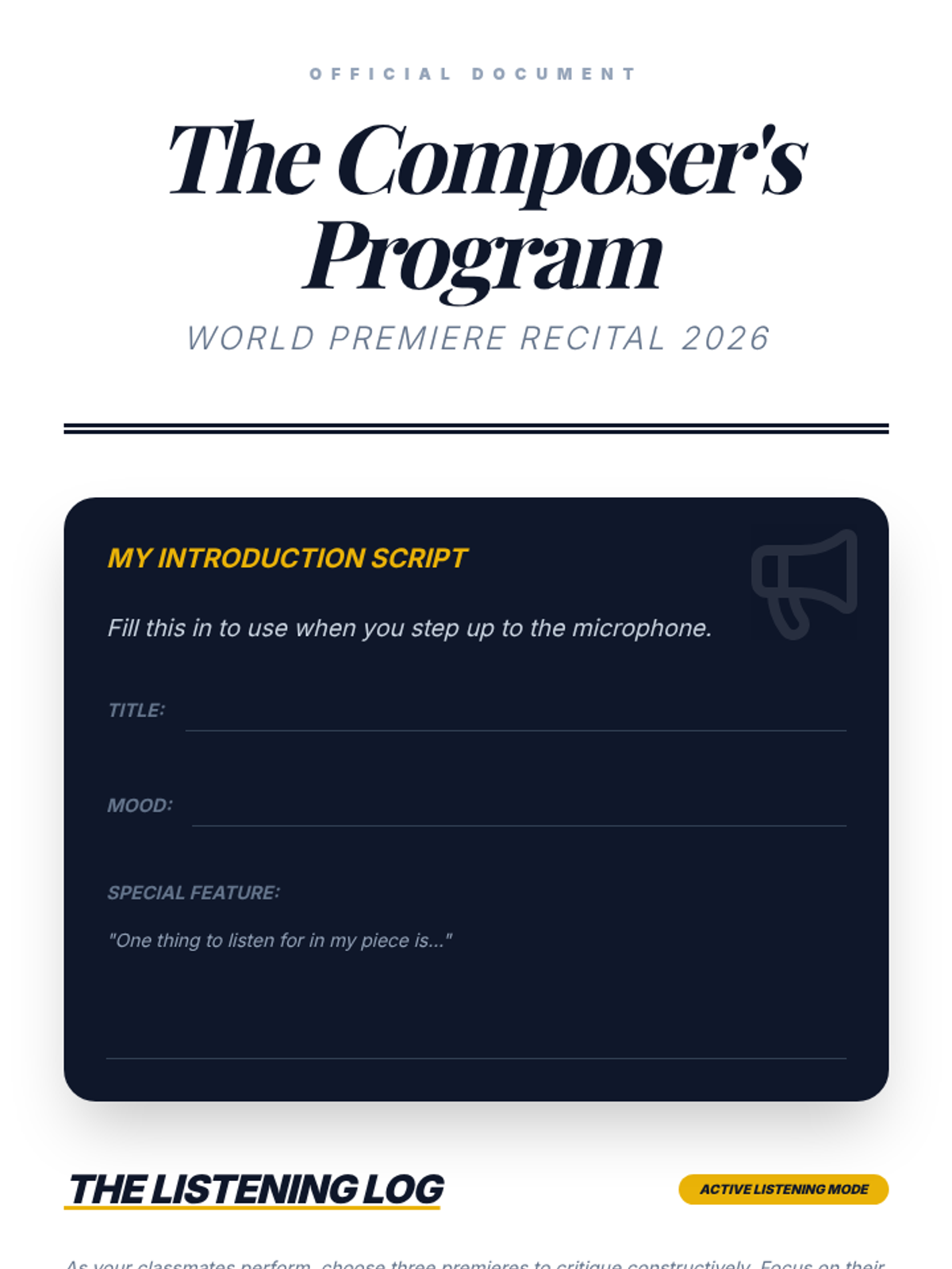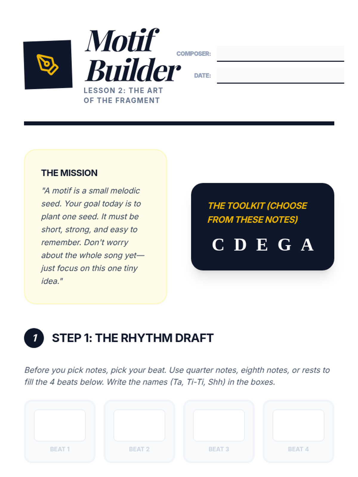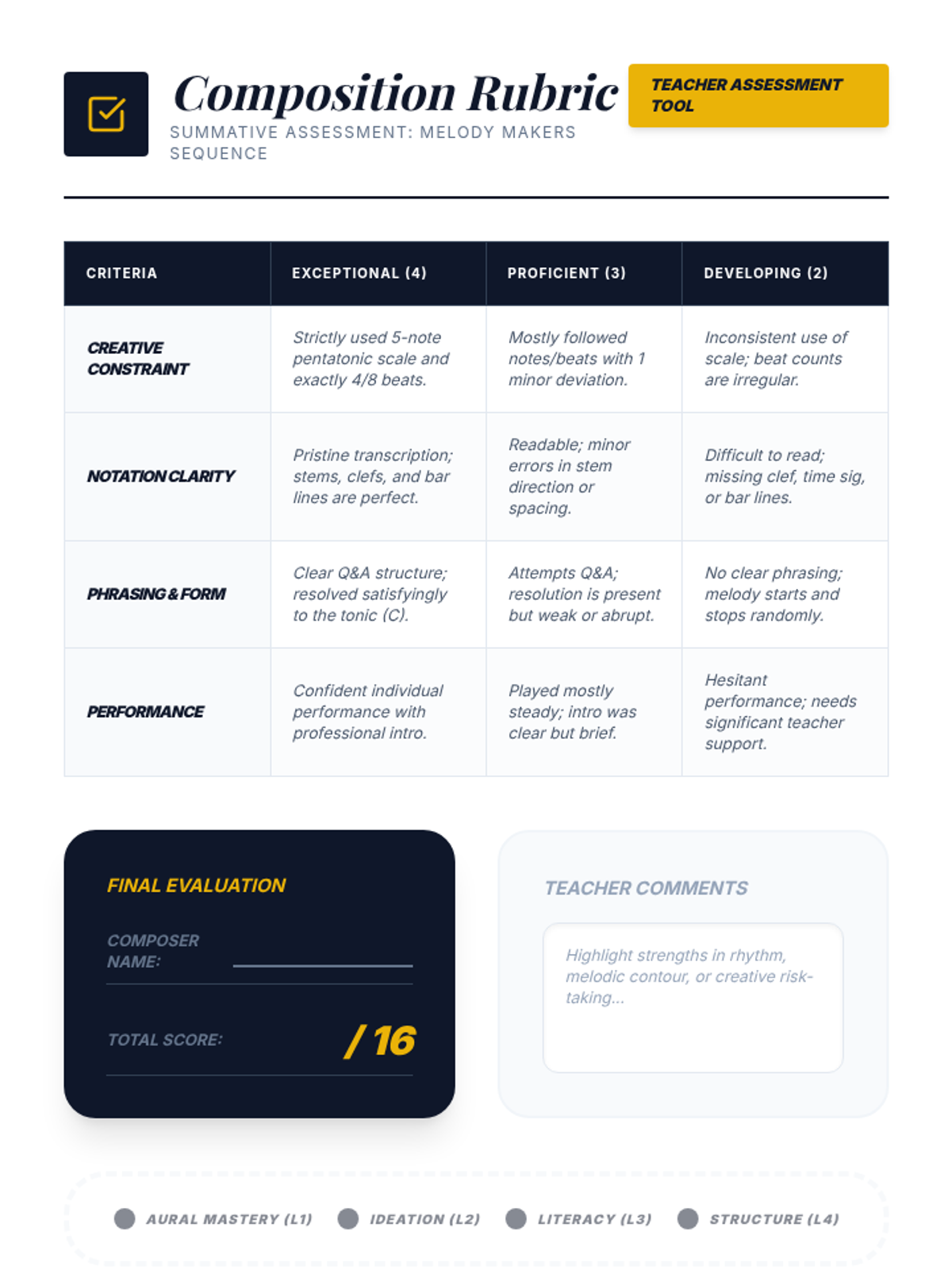 A 5th-grade music sequence where students transition from improvisation to full melodic composition. They explore motifs, notation, and phrasing, culminating in a class recital of original works.
