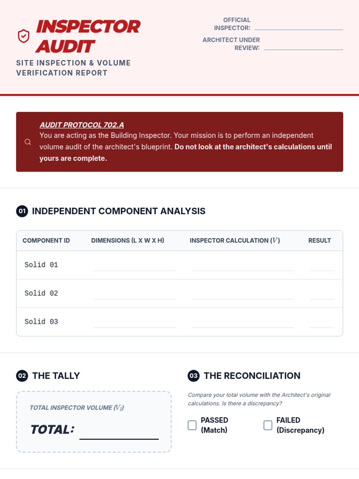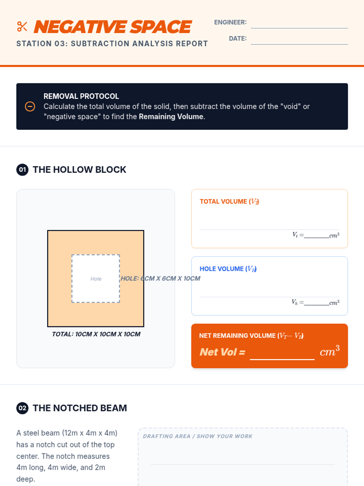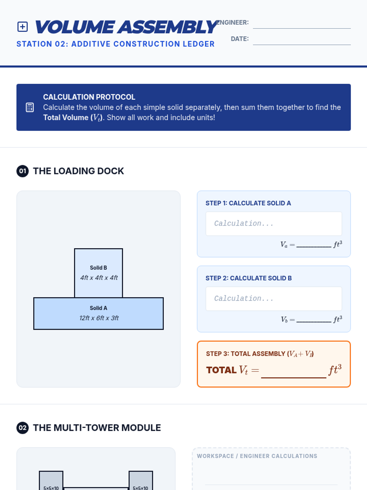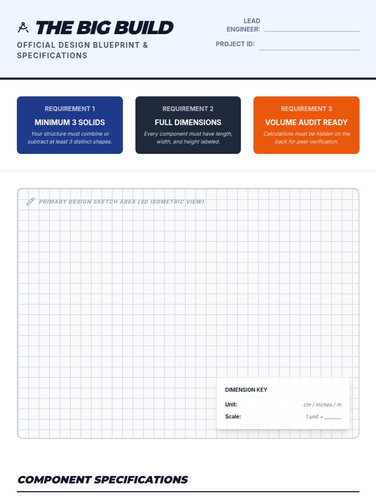 A project-based geometry unit where 6th-grade students act as structural engineers to decompose, calculate, and design complex composite 3D structures using additive and subtractive volume methods.
