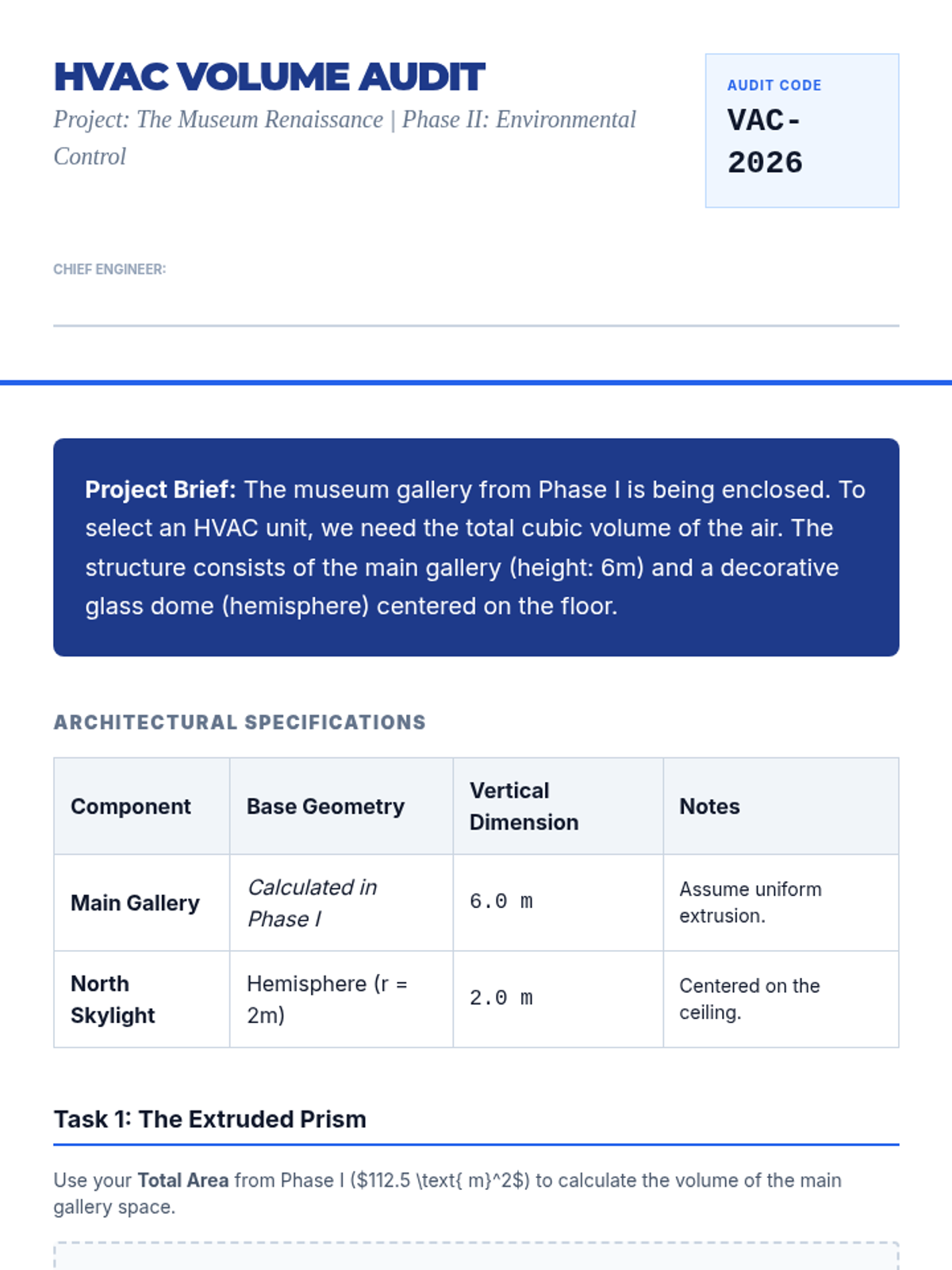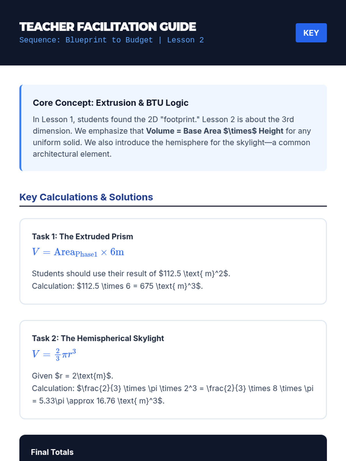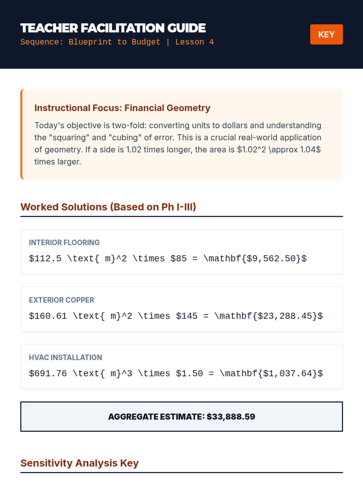 A project-based geometry sequence where 12th-grade students act as architectural consultants. They decompose complex floor plans, calculate volumes for HVAC systems, determine material needs for roofing/cladding using trigonometry, and perform cost estimation with error analysis.