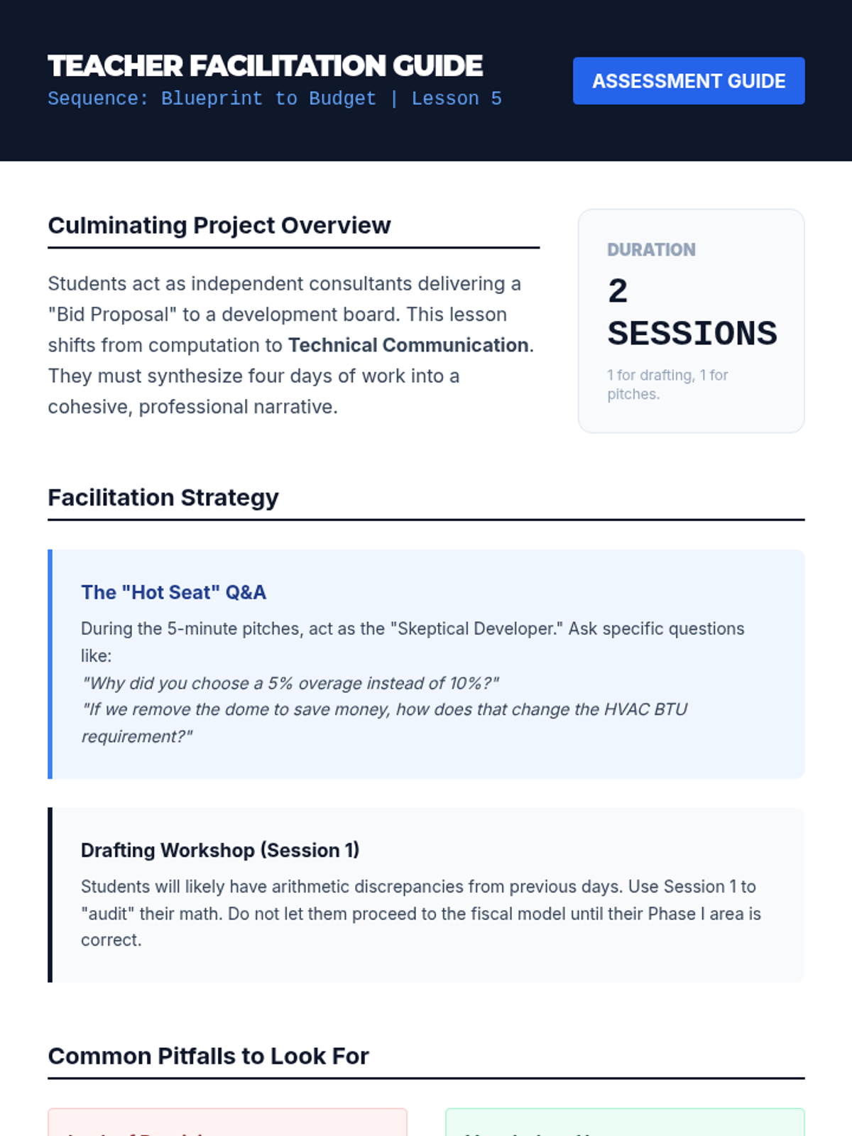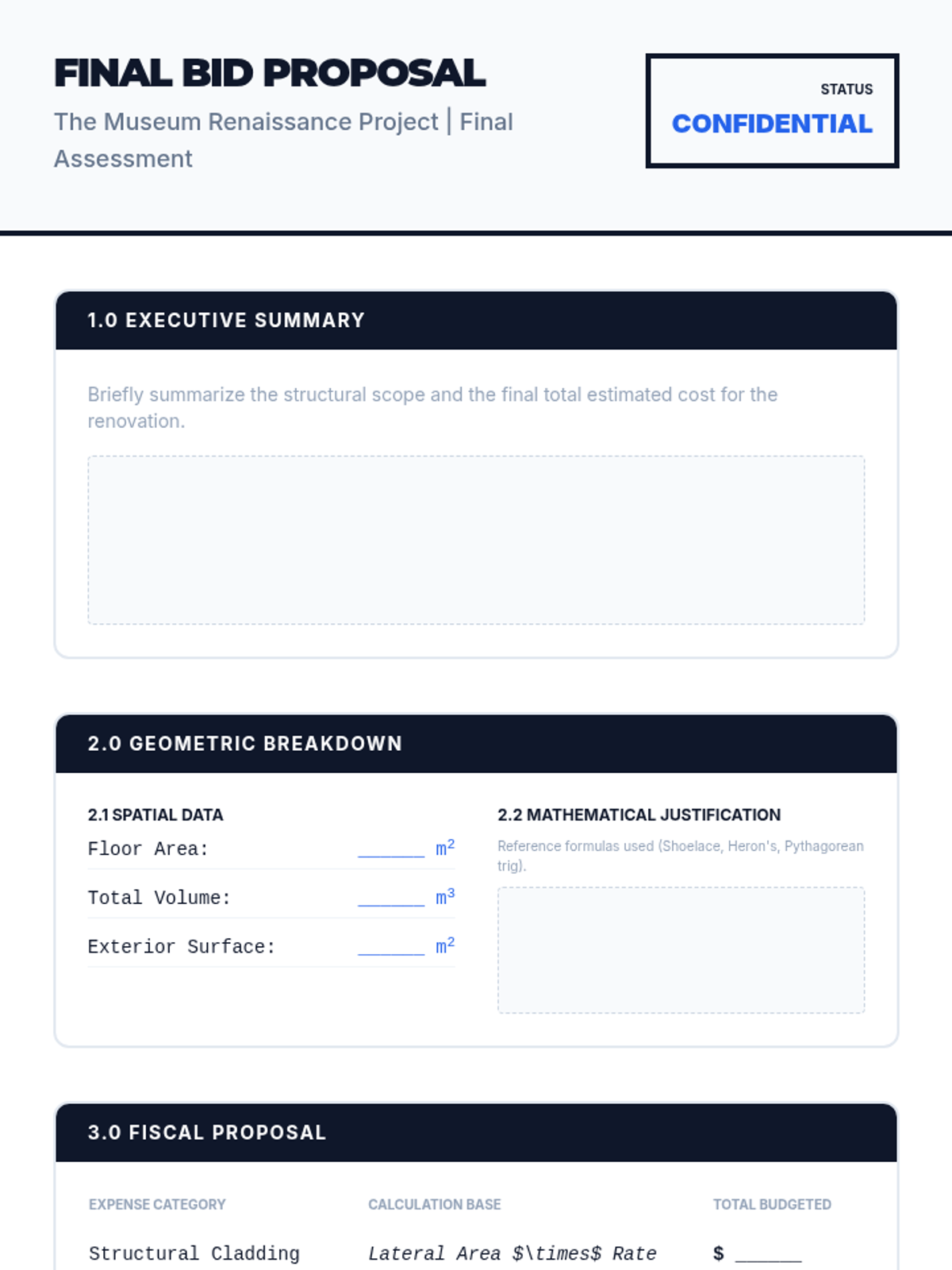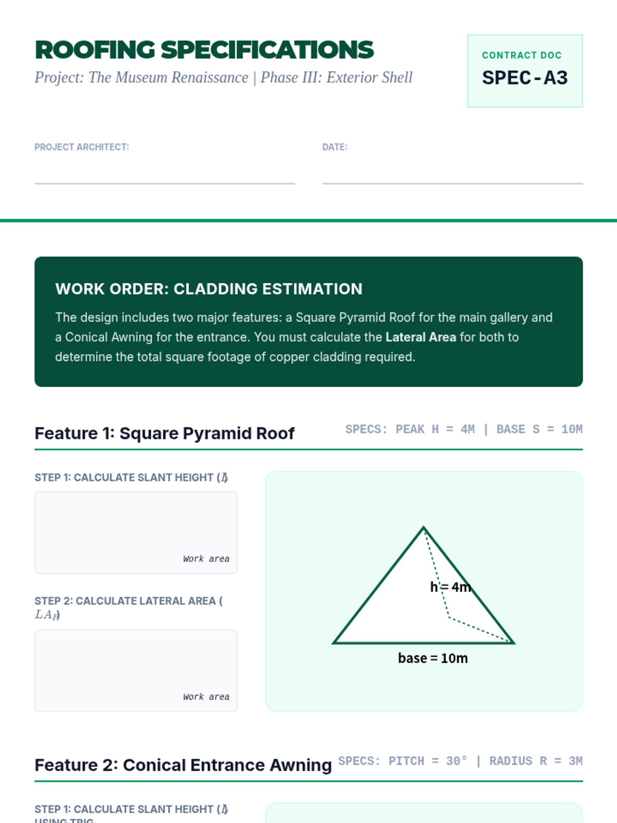 A project-based geometry sequence where 12th-grade students act as architectural consultants. They decompose complex floor plans, calculate volumes for HVAC systems, determine material needs for roofing/cladding using trigonometry, and perform cost estimation with error analysis.