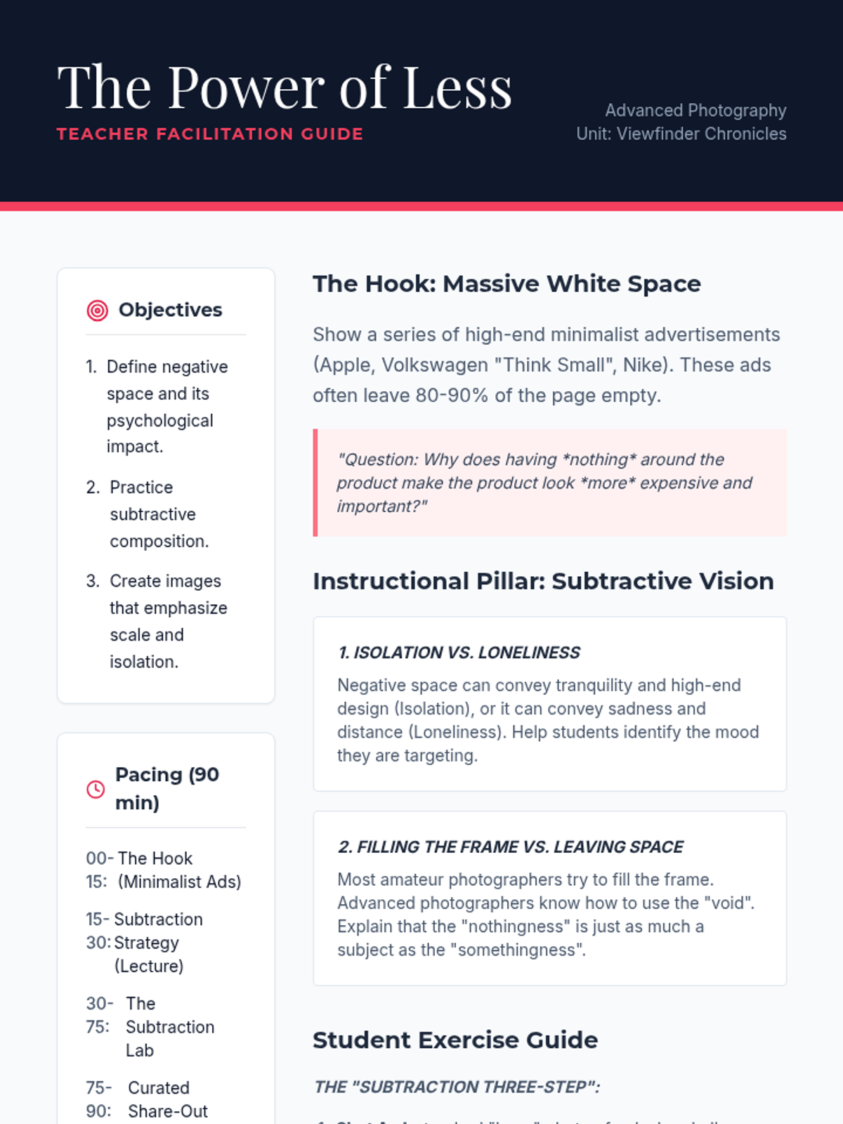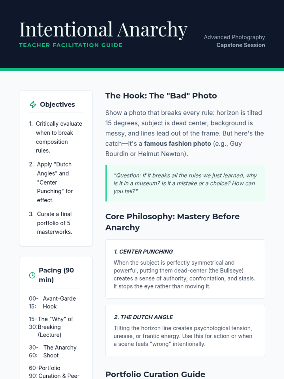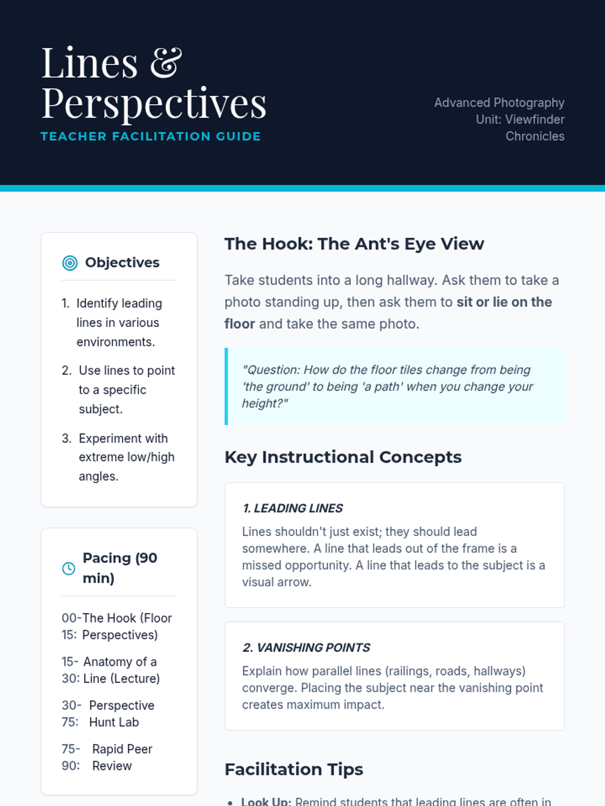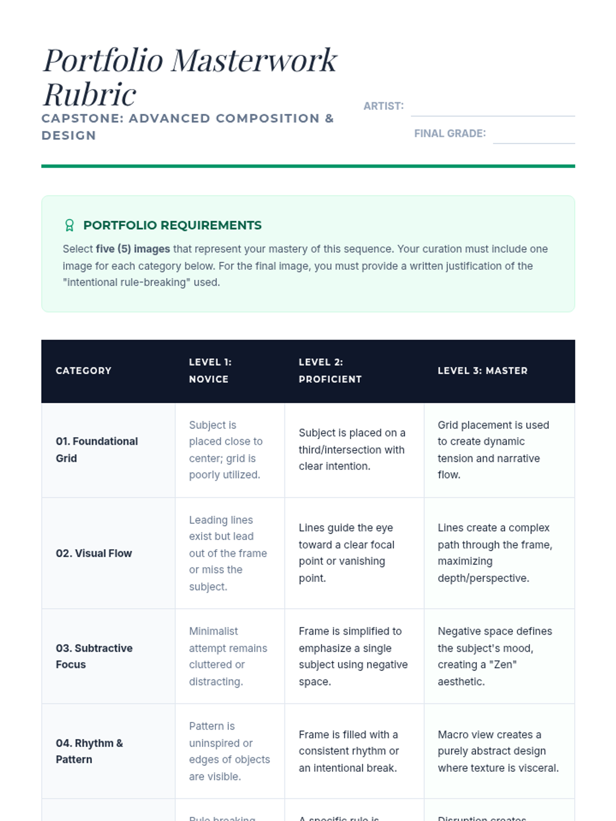 A comprehensive 11th-grade photography sequence focusing on advanced composition, guiding students from foundational rules to intentional creative disruption. Students will explore the Rule of Thirds, leading lines, negative space, and pattern, culminating in a sophisticated portfolio project.