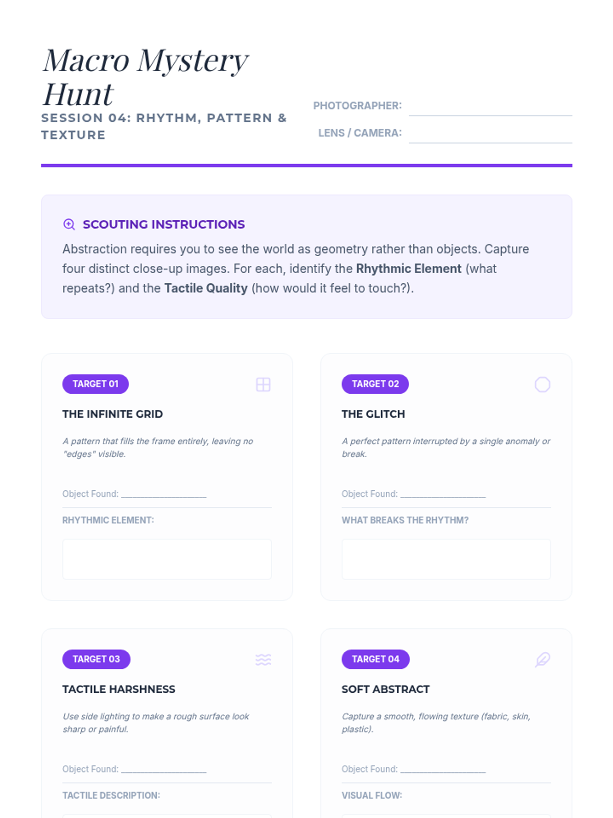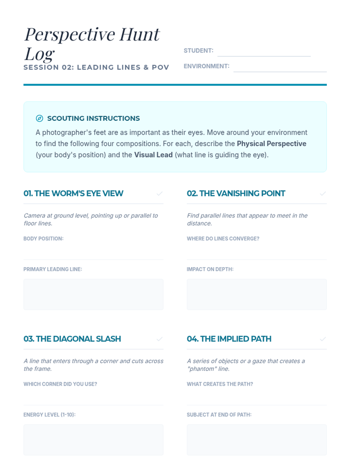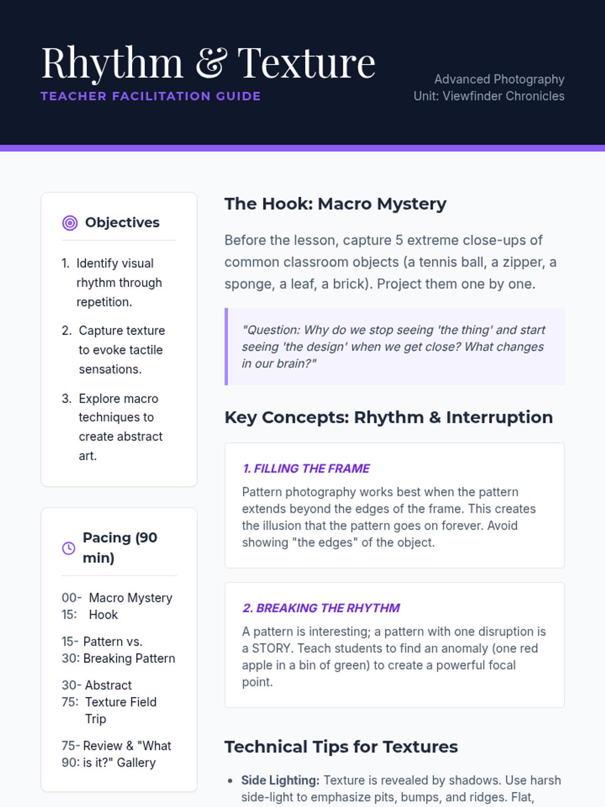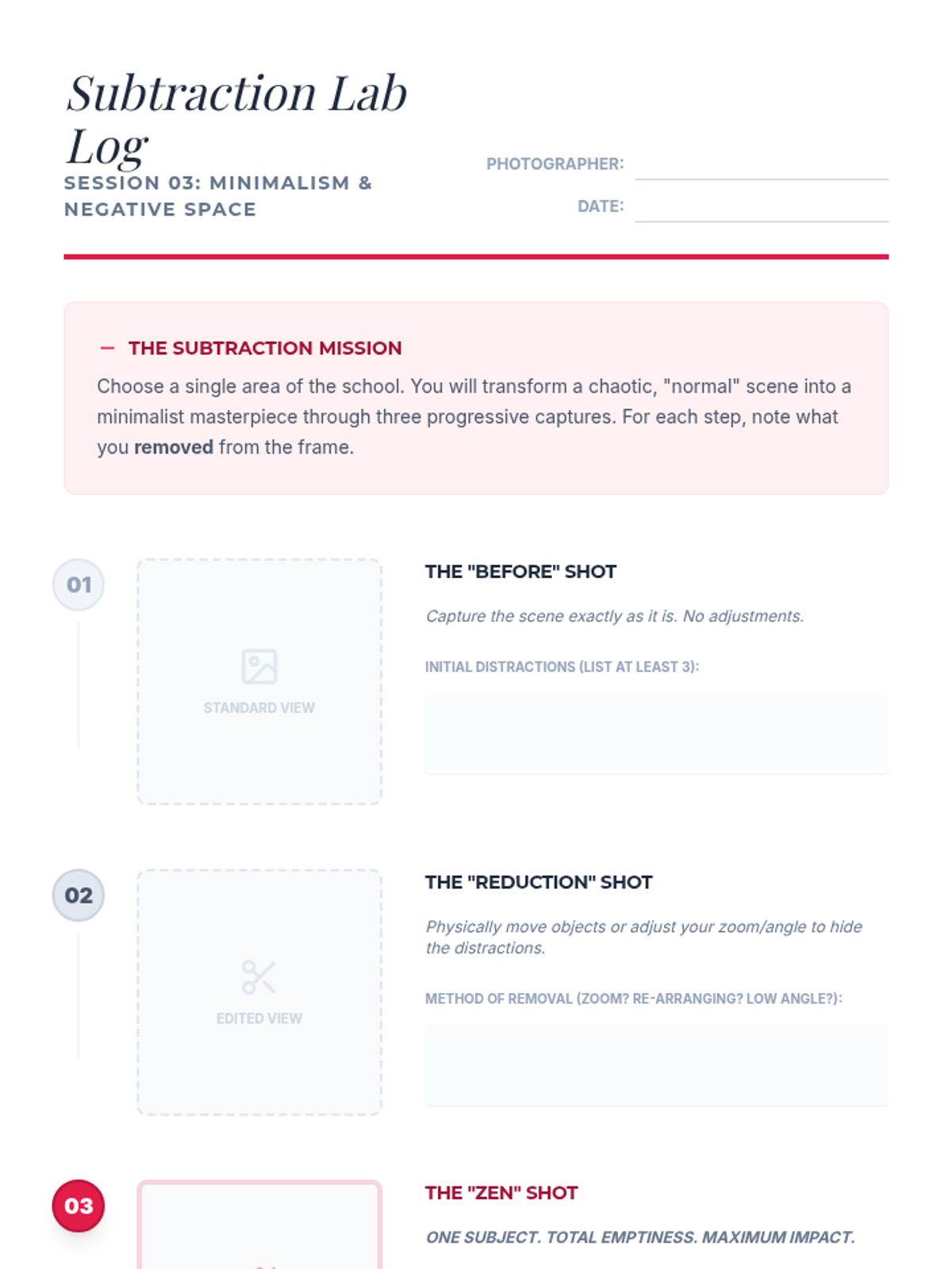 A comprehensive 11th-grade photography sequence focusing on advanced composition, guiding students from foundational rules to intentional creative disruption. Students will explore the Rule of Thirds, leading lines, negative space, and pattern, culminating in a sophisticated portfolio project.