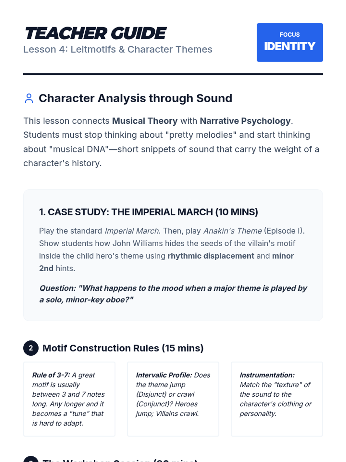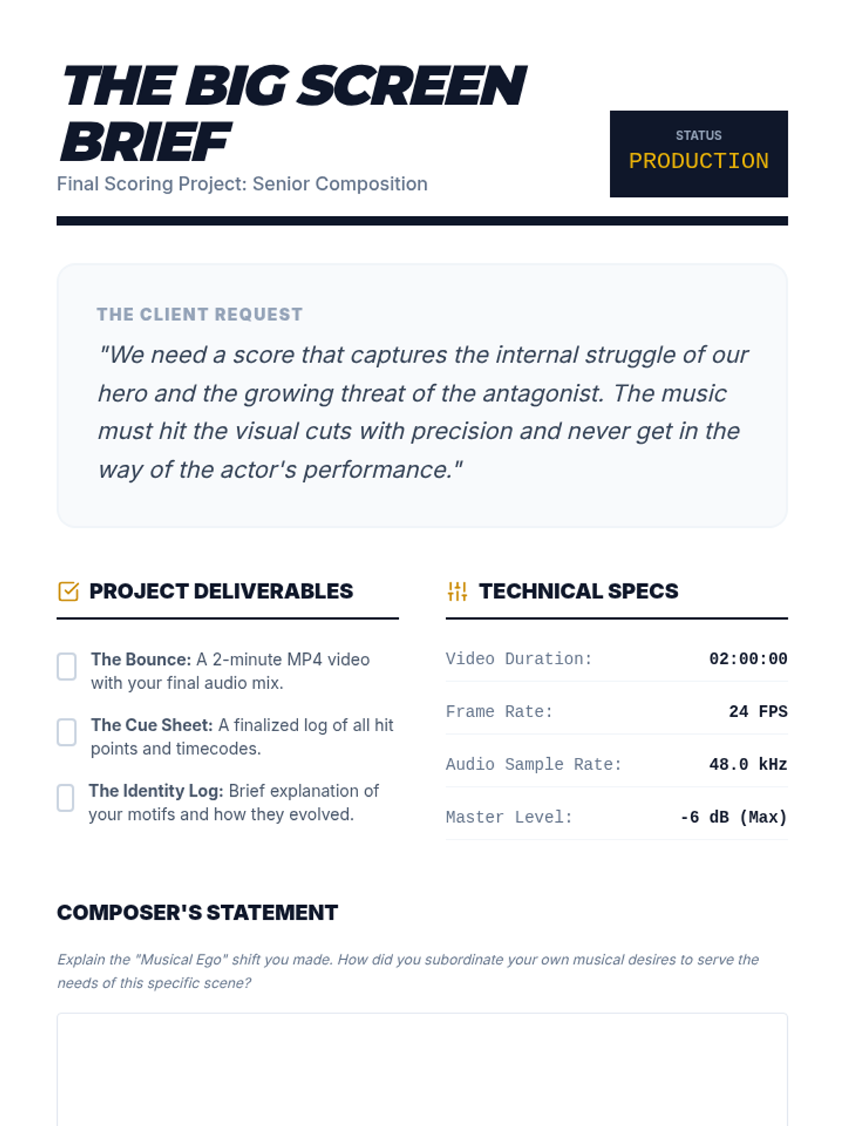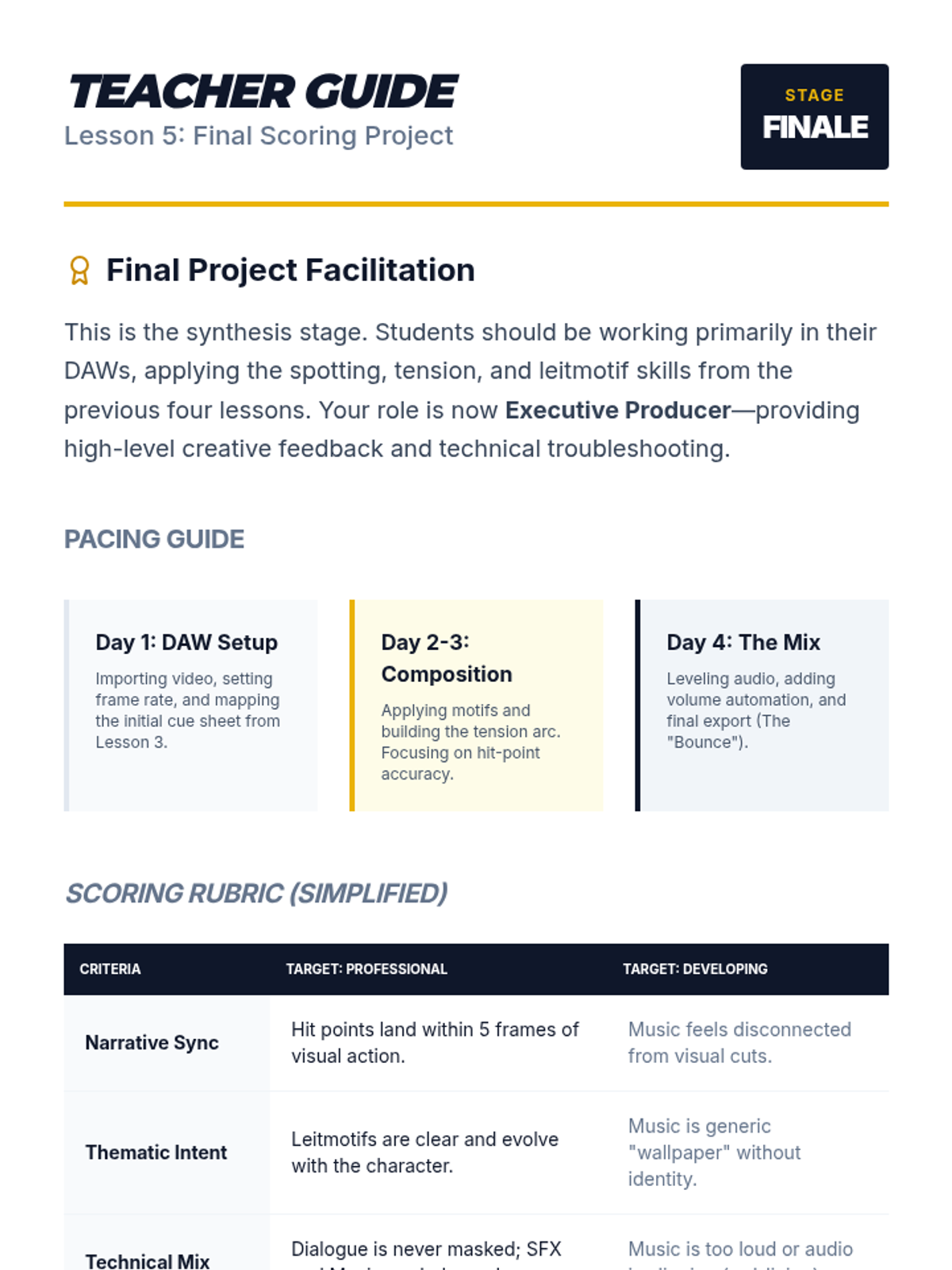 A comprehensive 11th-grade music composition sequence focused on scoring for visual media. Students explore the psychological impact of music, techniques for tension, technical synchronization, and character-driven leitmotifs, culminating in a final scoring project for a film clip.