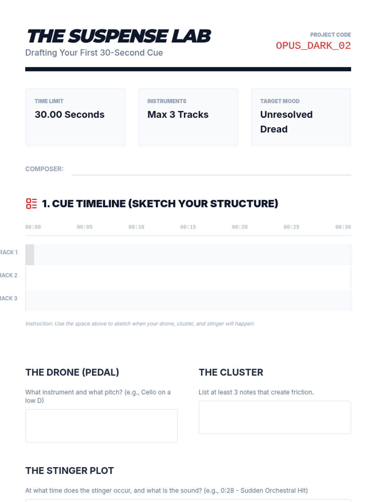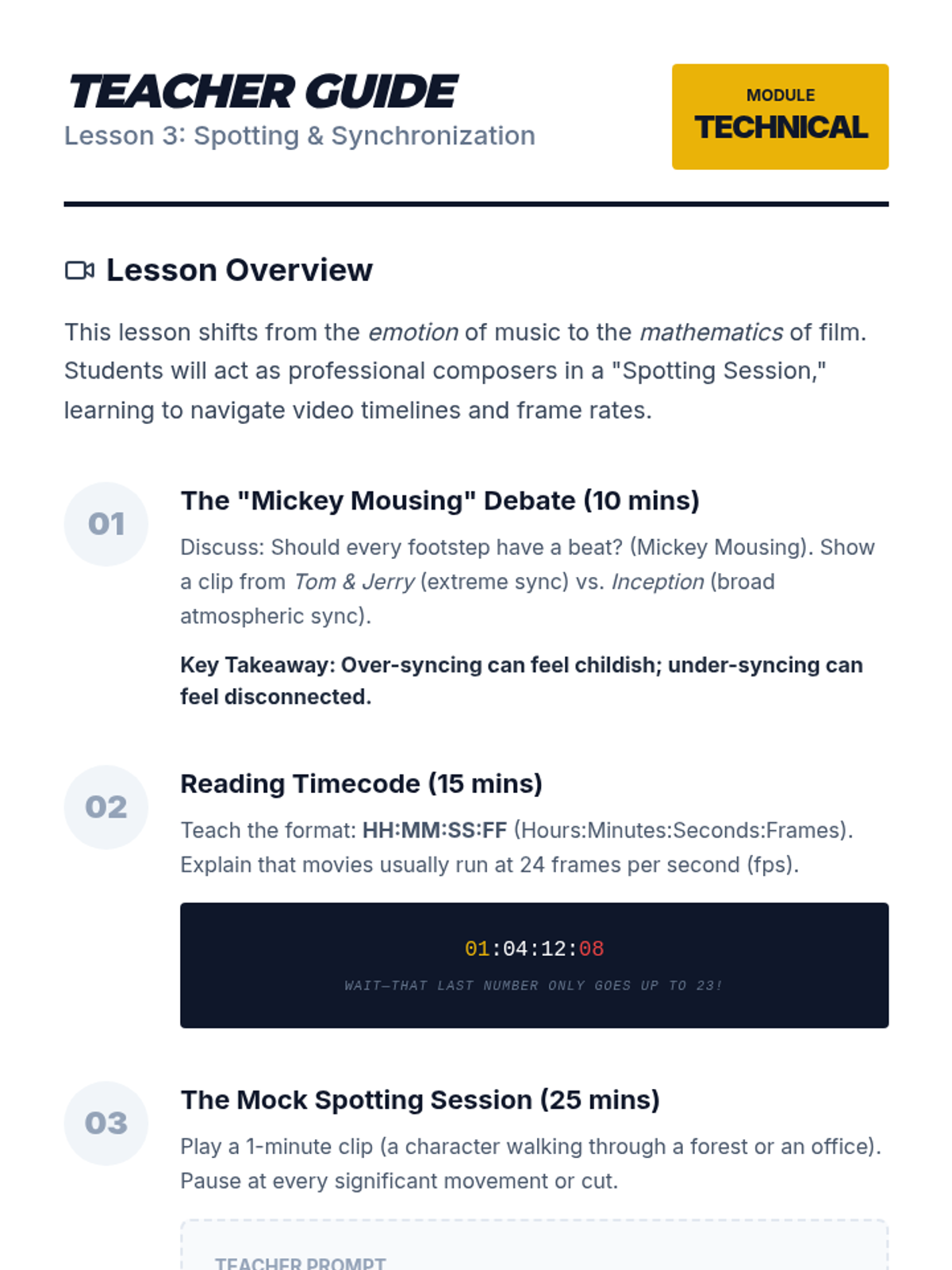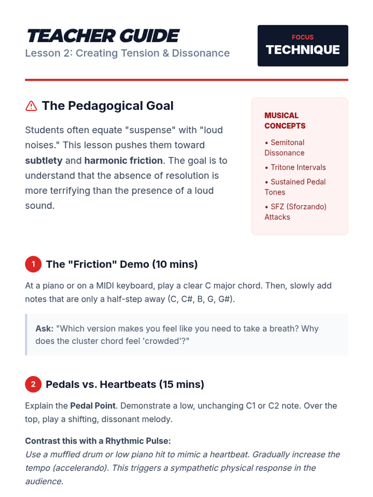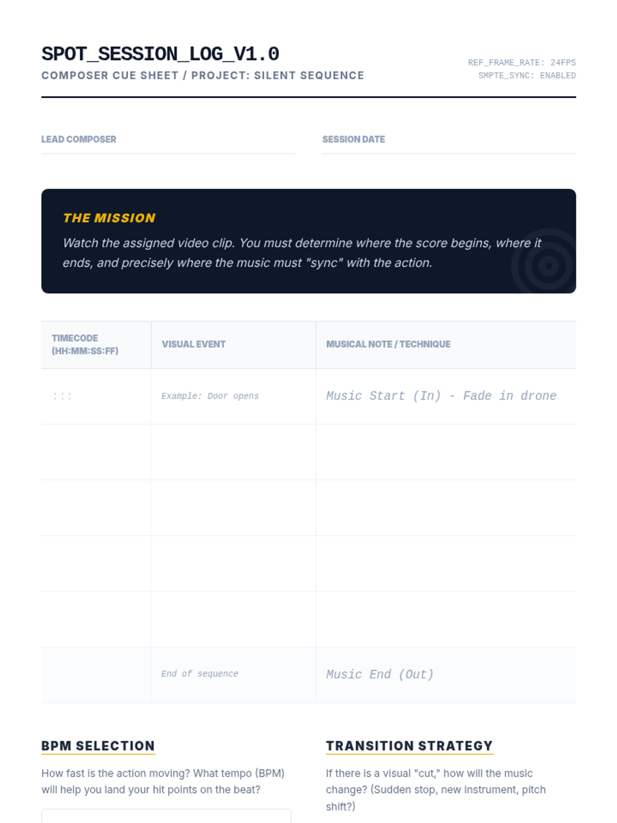 A comprehensive 11th-grade music composition sequence focused on scoring for visual media. Students explore the psychological impact of music, techniques for tension, technical synchronization, and character-driven leitmotifs, culminating in a final scoring project for a film clip.