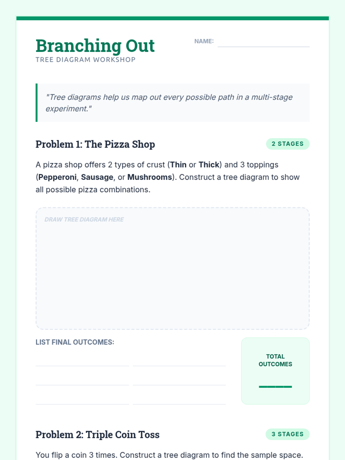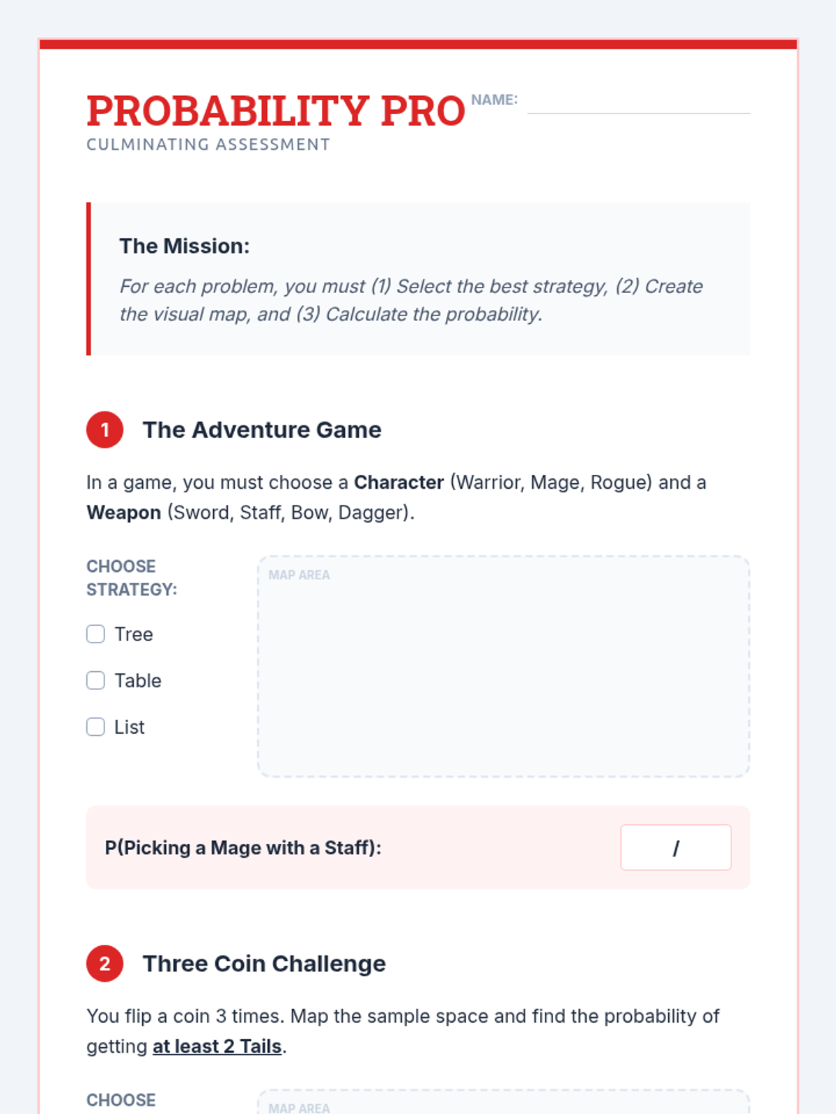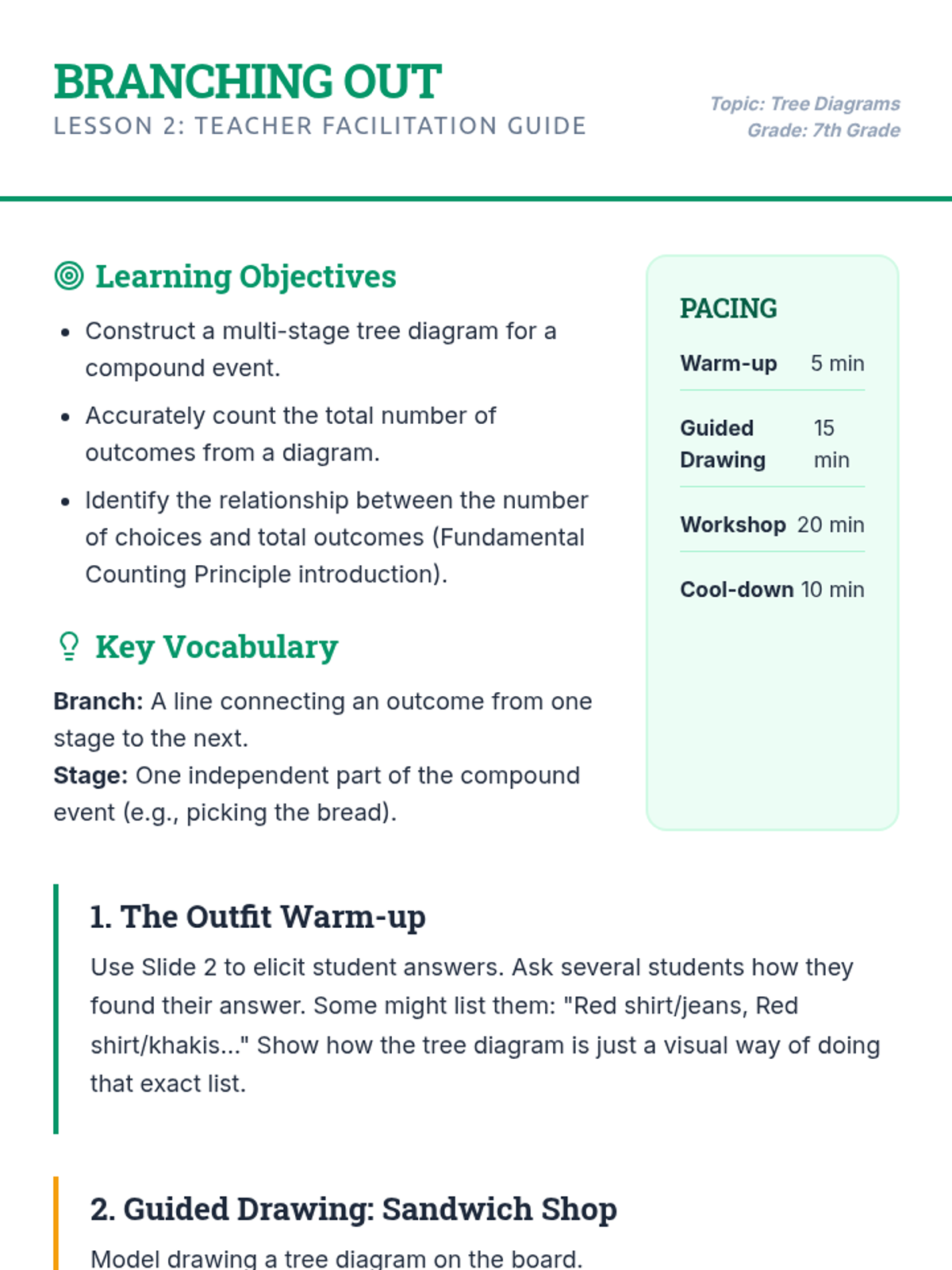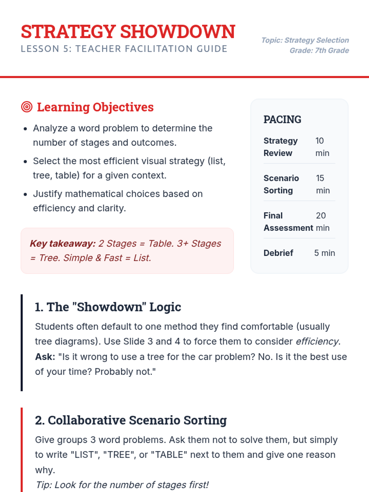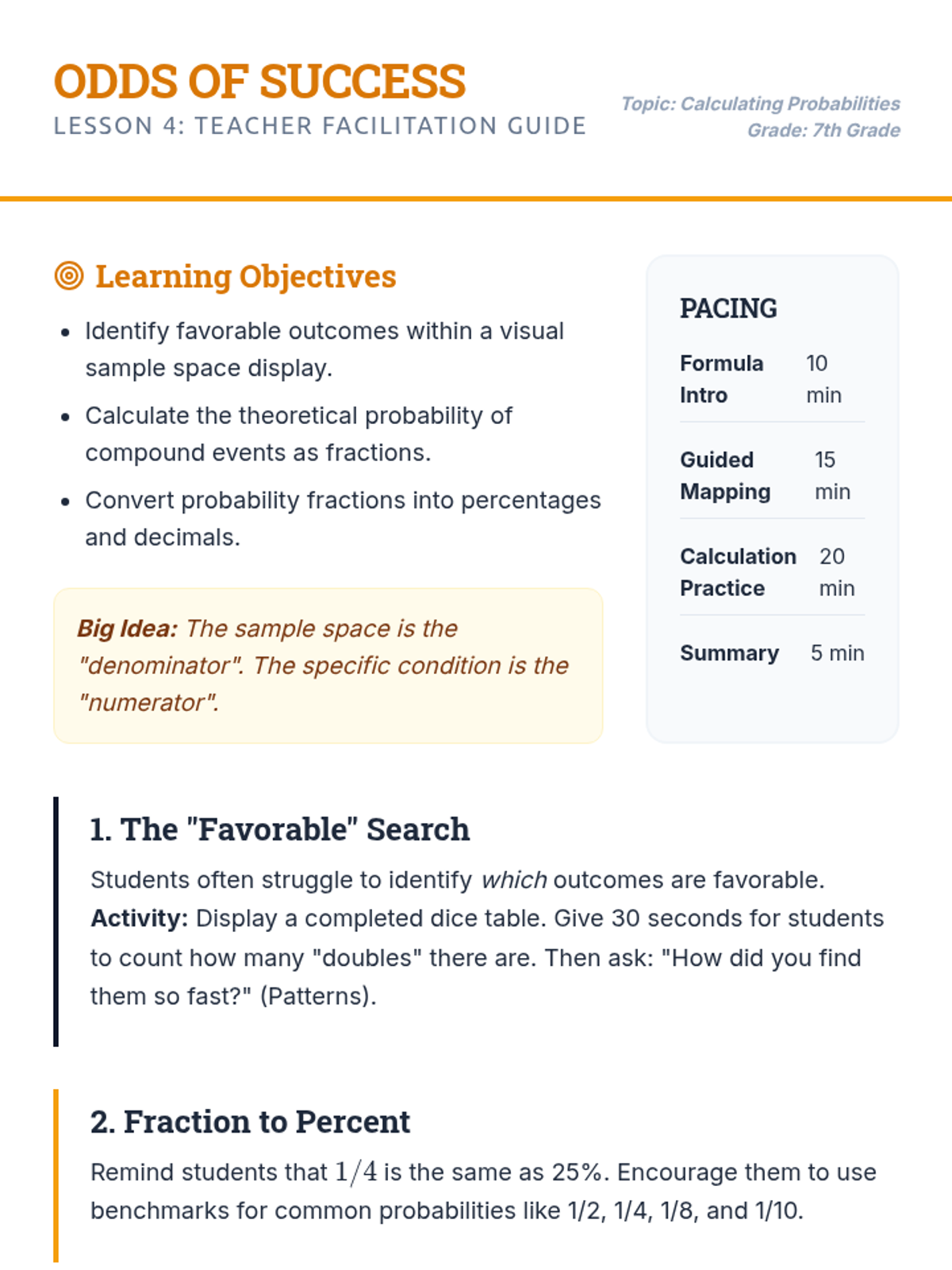 A comprehensive unit for 7th graders on compound event probability, moving from visual mapping (tree diagrams, tables) to theoretical calculations and strategy selection.