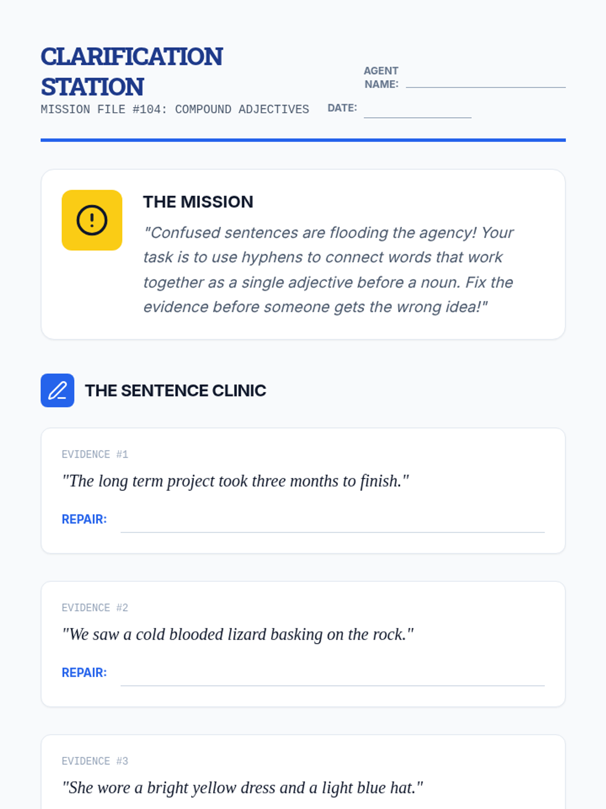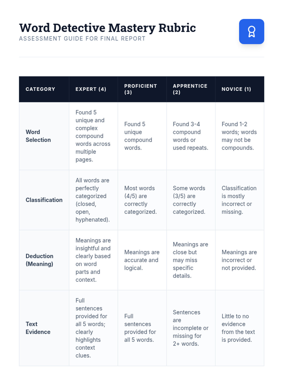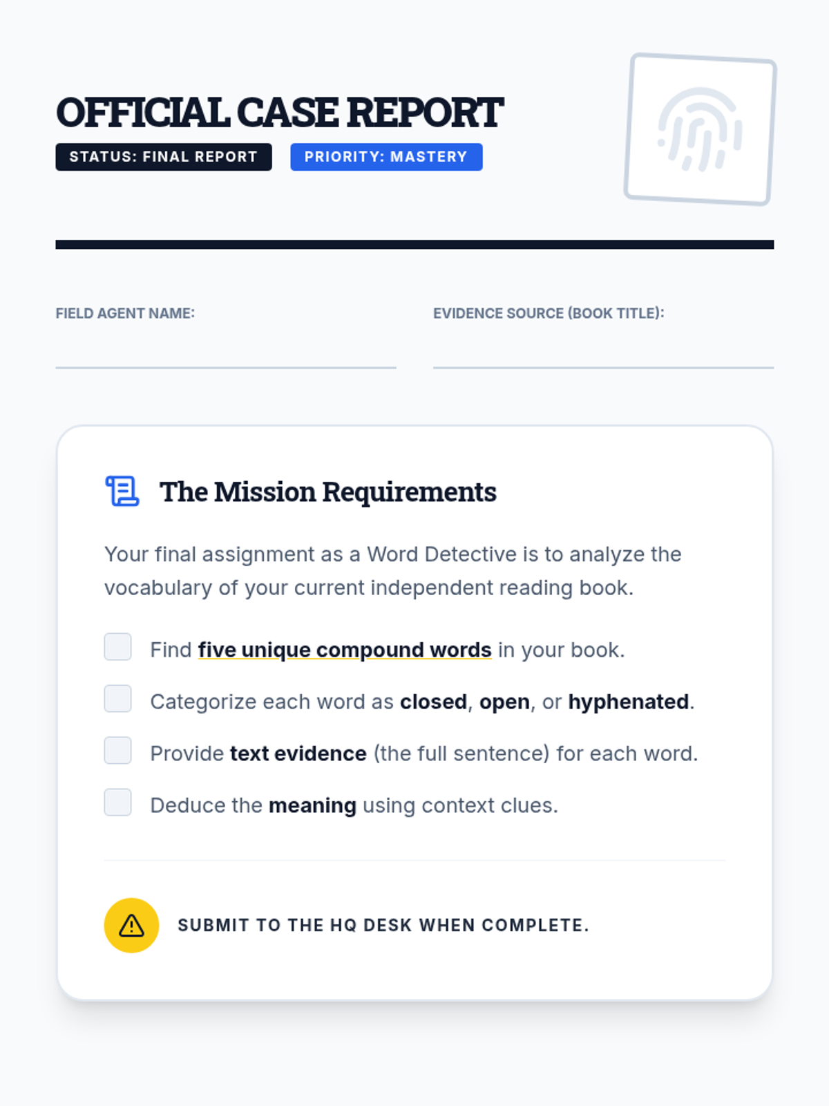 A 4th-grade ELA sequence where students become 'Word Detectives' to investigate the structure, types, and meanings of compound words using context clues and grammatical analysis.
