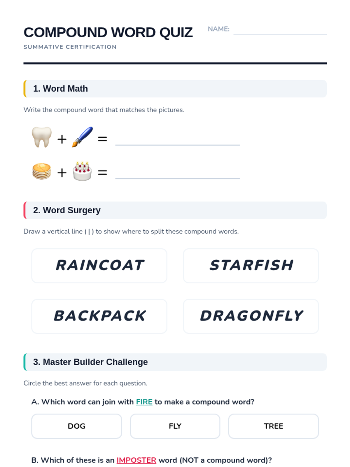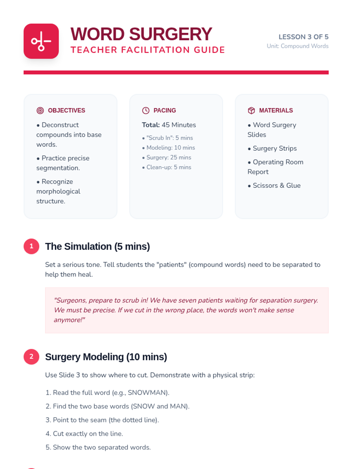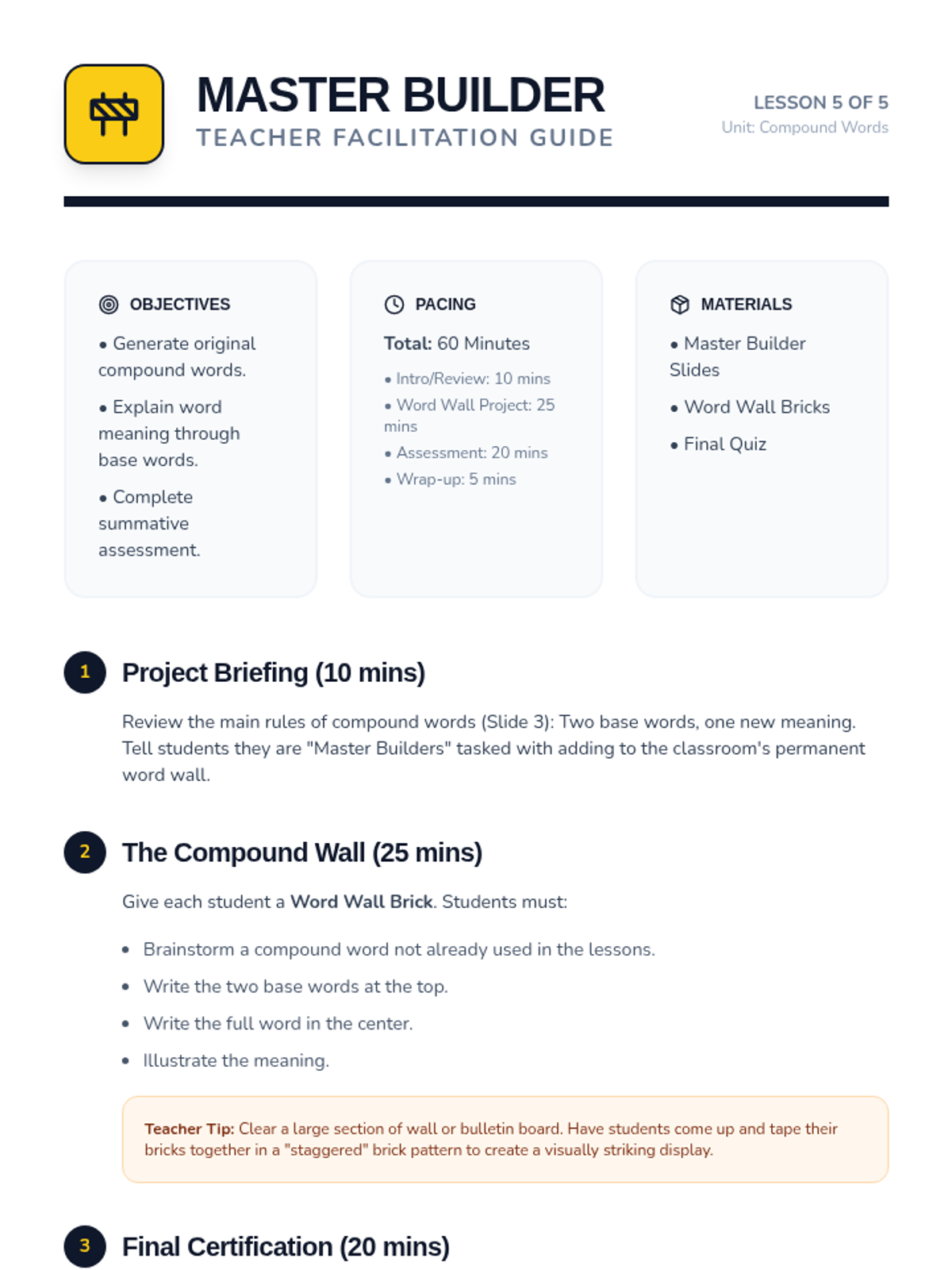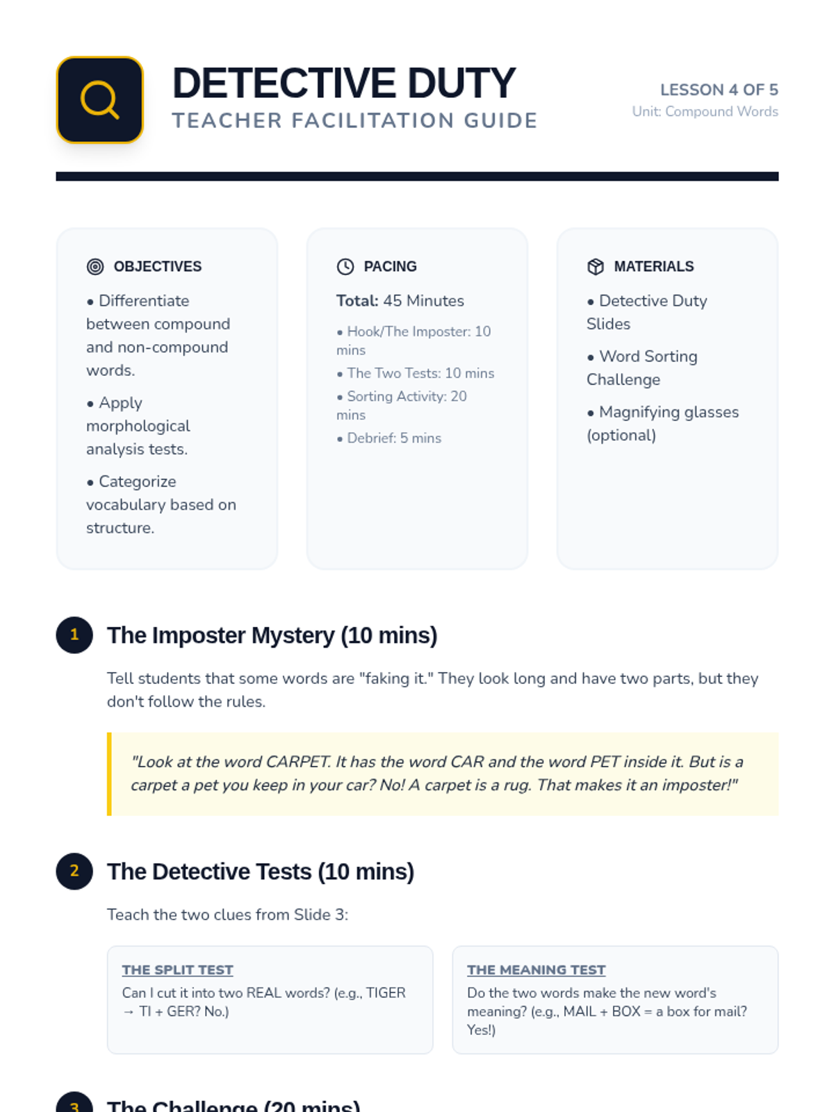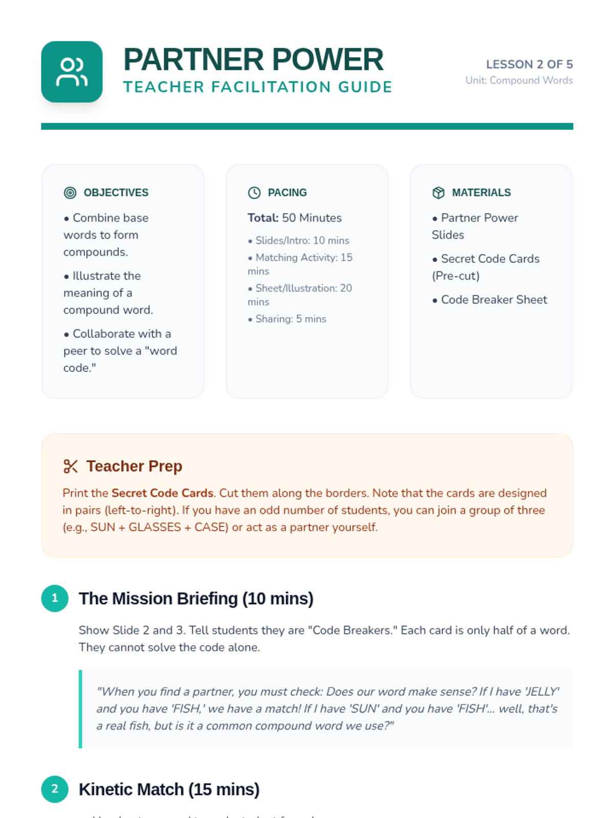 A comprehensive 2nd-grade English Language Arts sequence exploring the formation, identification, and deconstruction of compound words through visual aids, hands-on activities, and linguistic analysis.