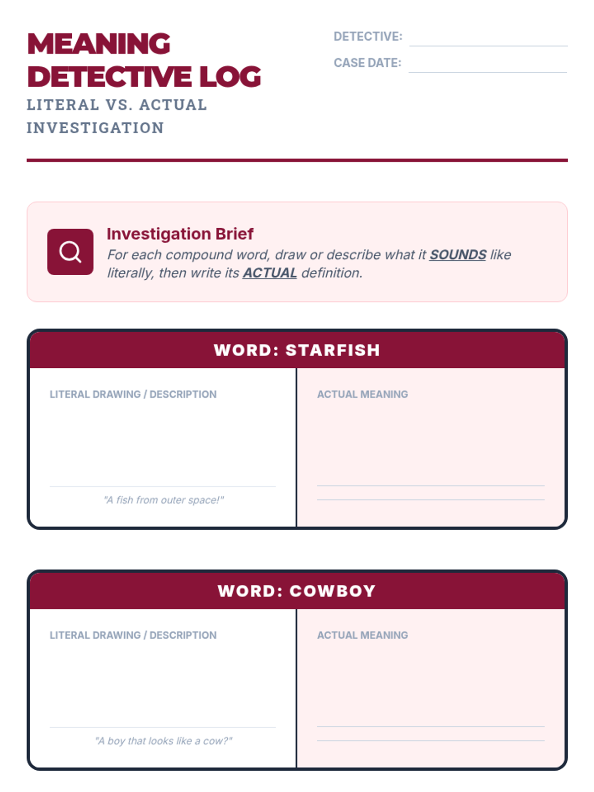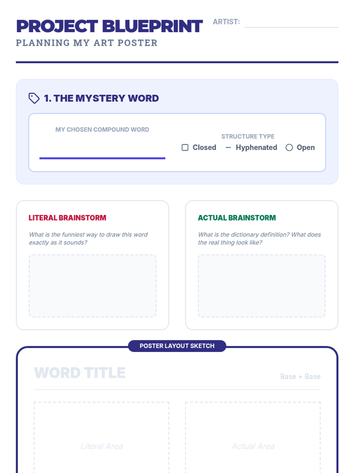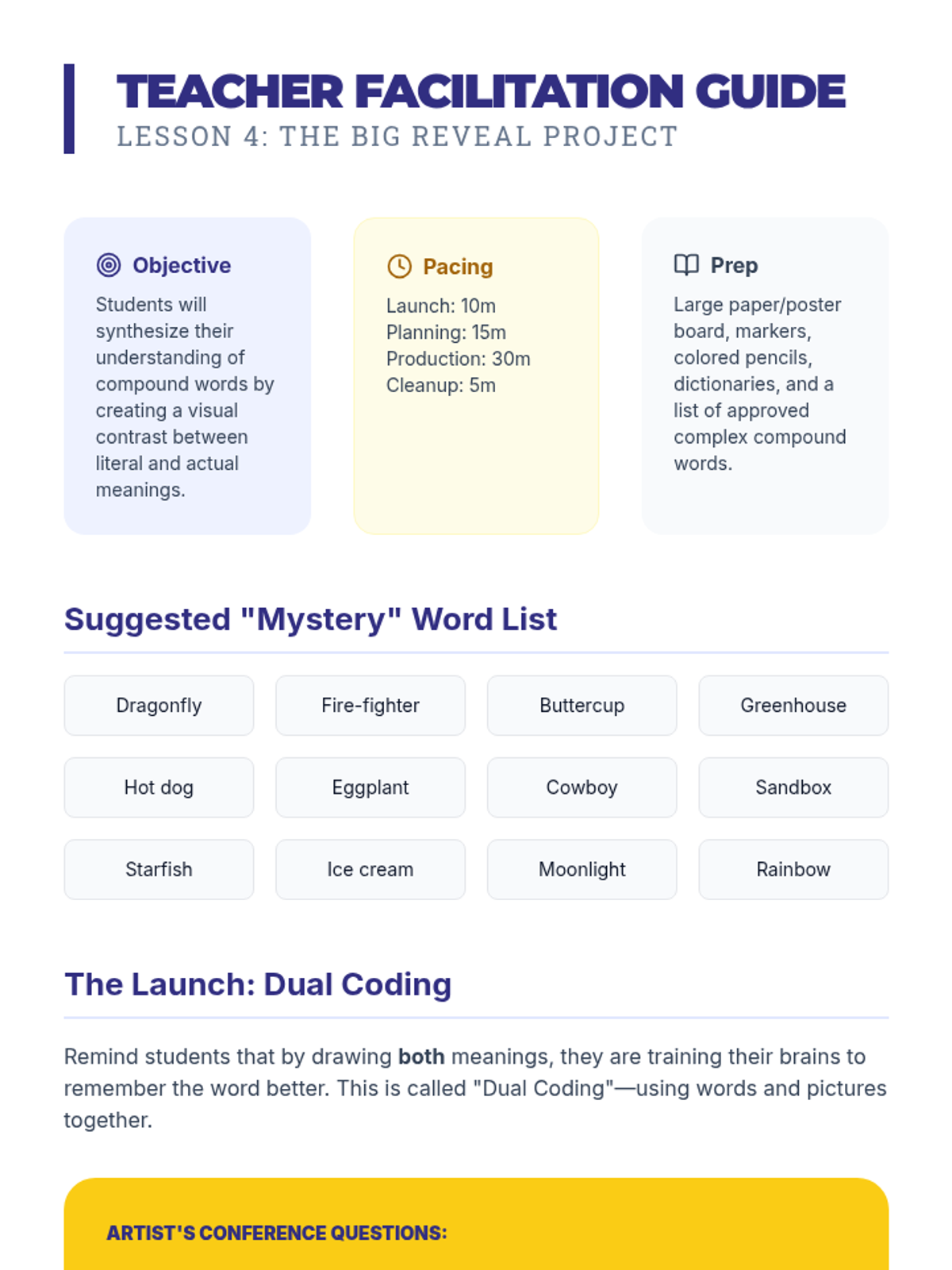 A 4th-grade ELA unit that uses visual arts and morphology to help students deconstruct, categorize, and creatively illustrate compound words, moving from simple closed compounds to more complex figurative meanings.