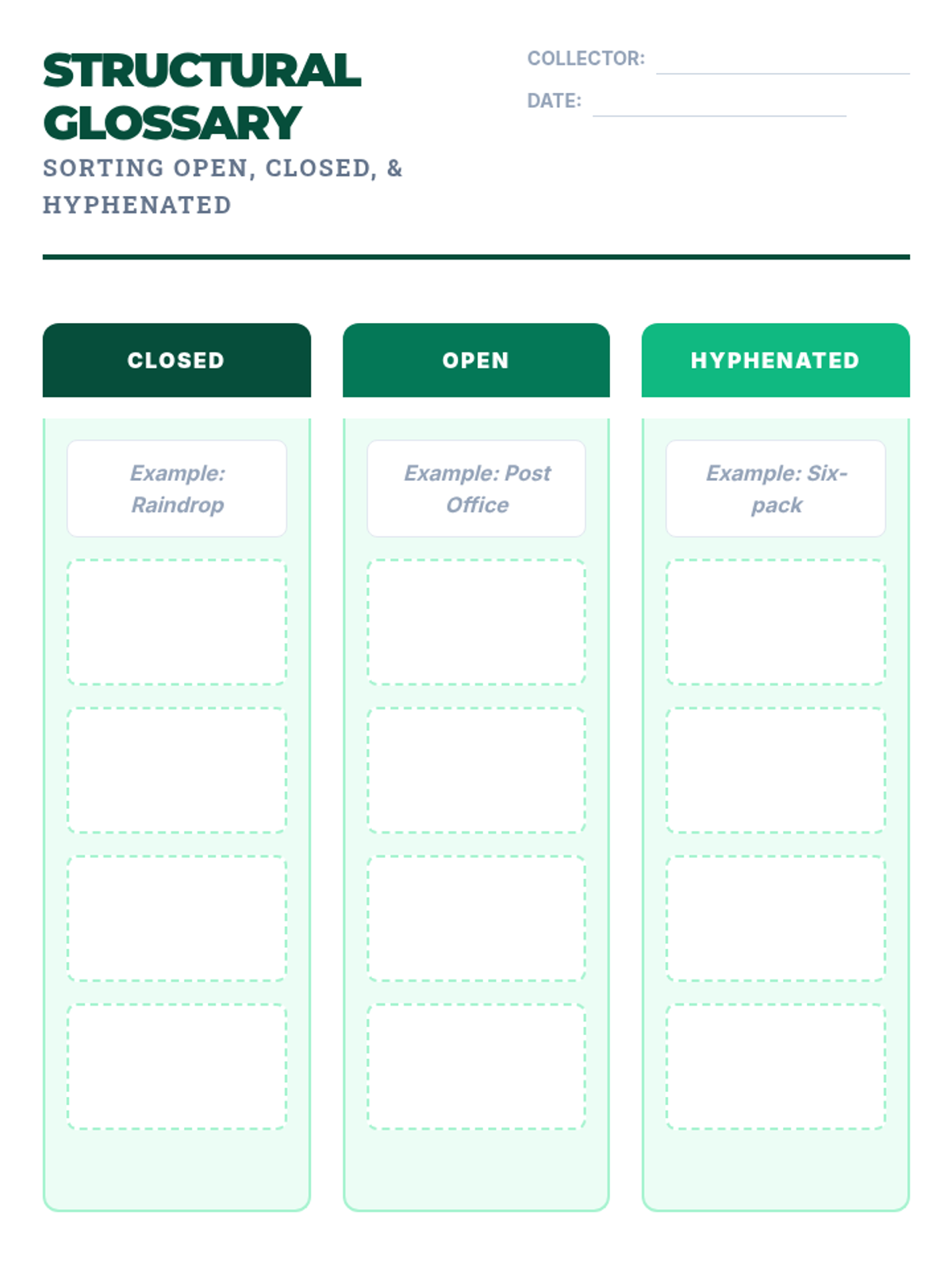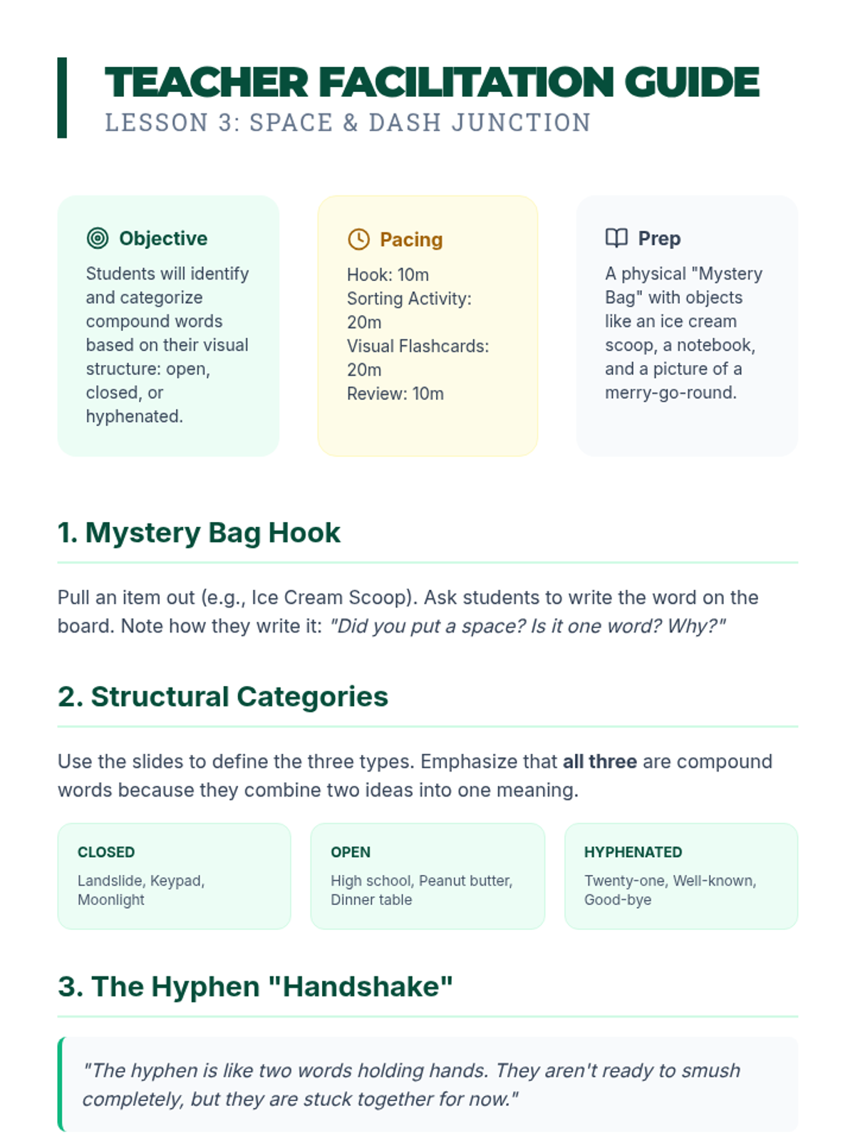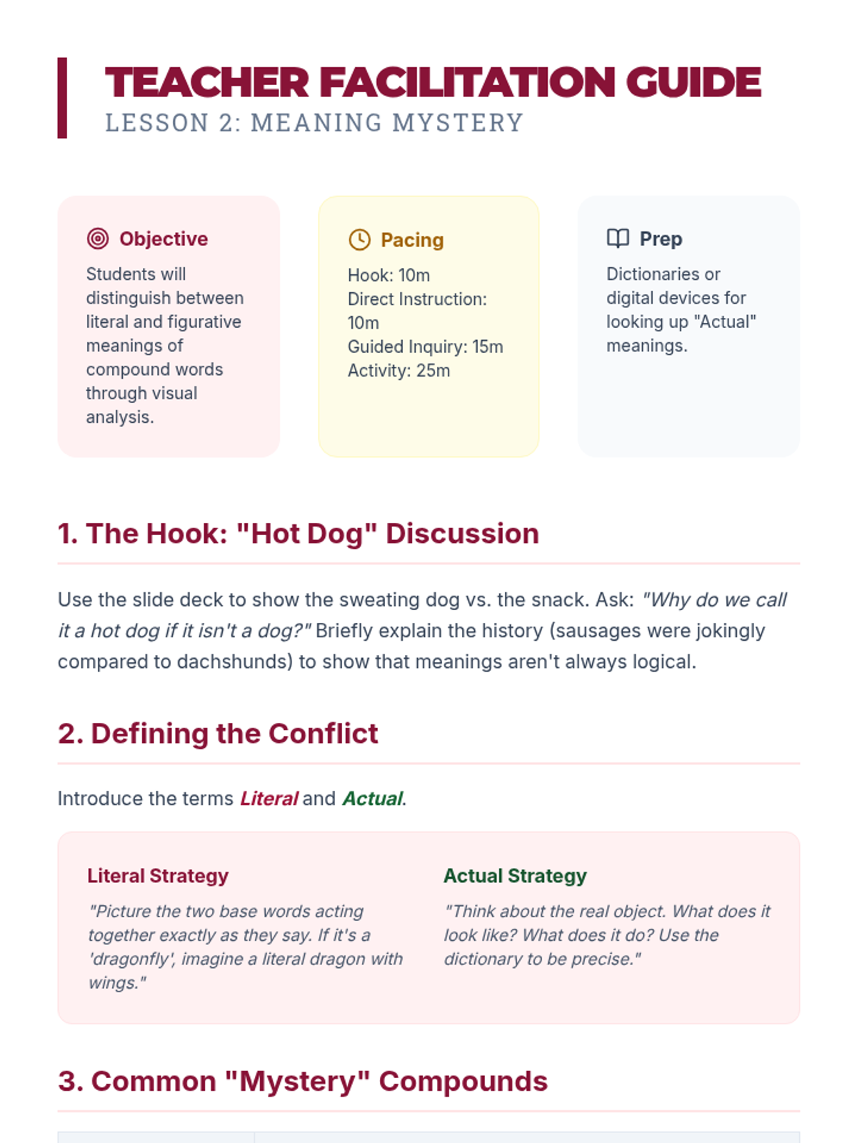 A 4th-grade ELA unit that uses visual arts and morphology to help students deconstruct, categorize, and creatively illustrate compound words, moving from simple closed compounds to more complex figurative meanings.