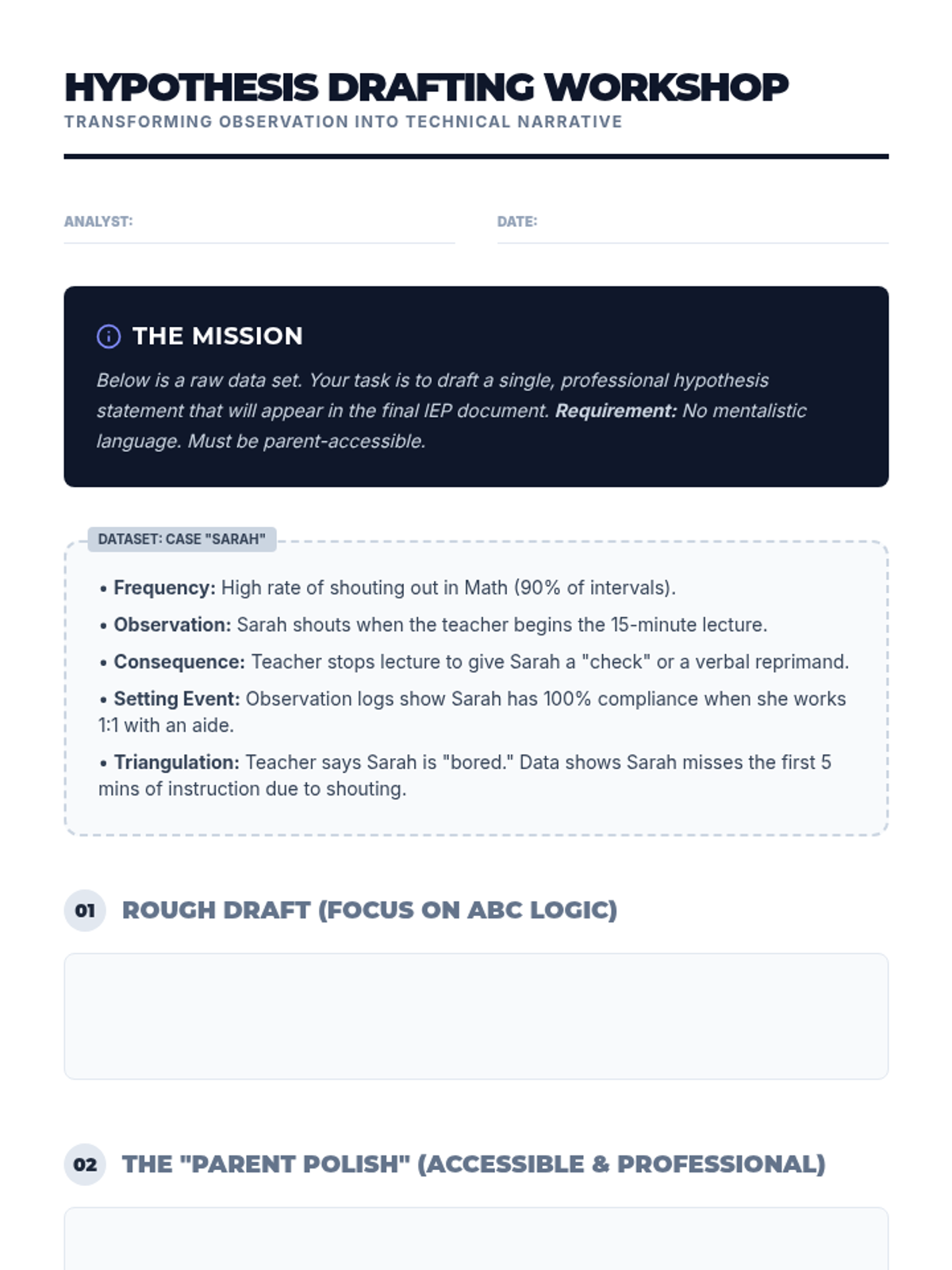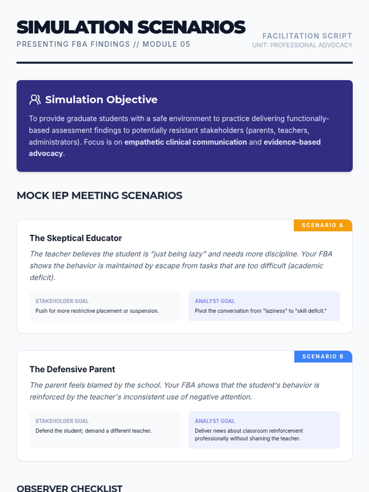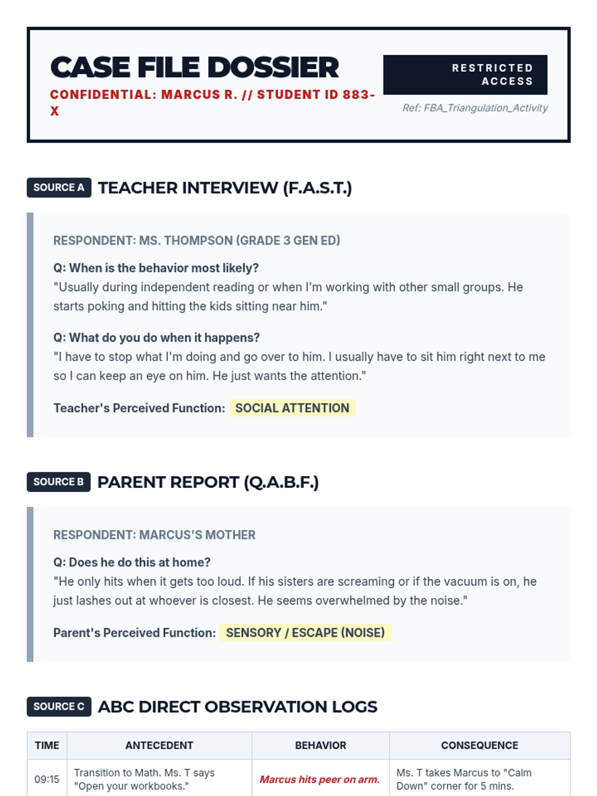 A graduate-level sequence focused on the synthesis of behavioral data into a comprehensive and legally defensible Functional Behavior Assessment (FBA) report. Students progress from record review to formal presentation of findings.