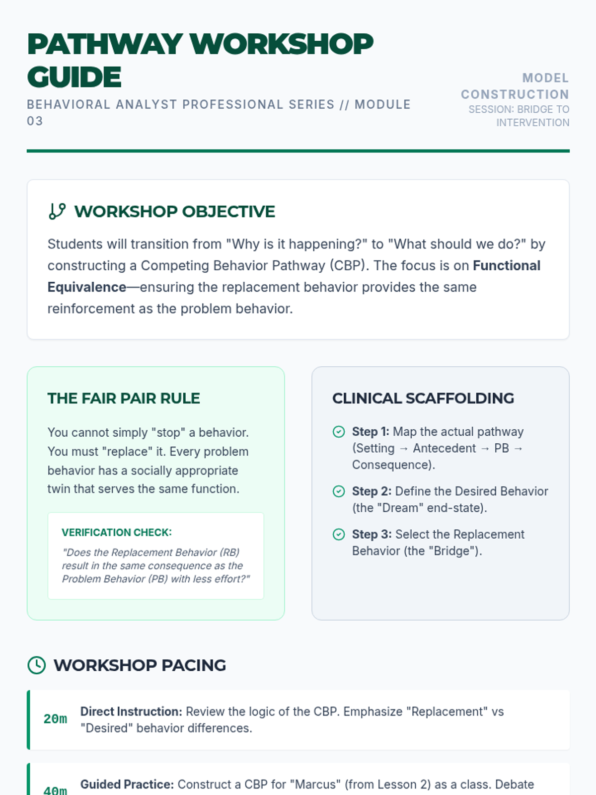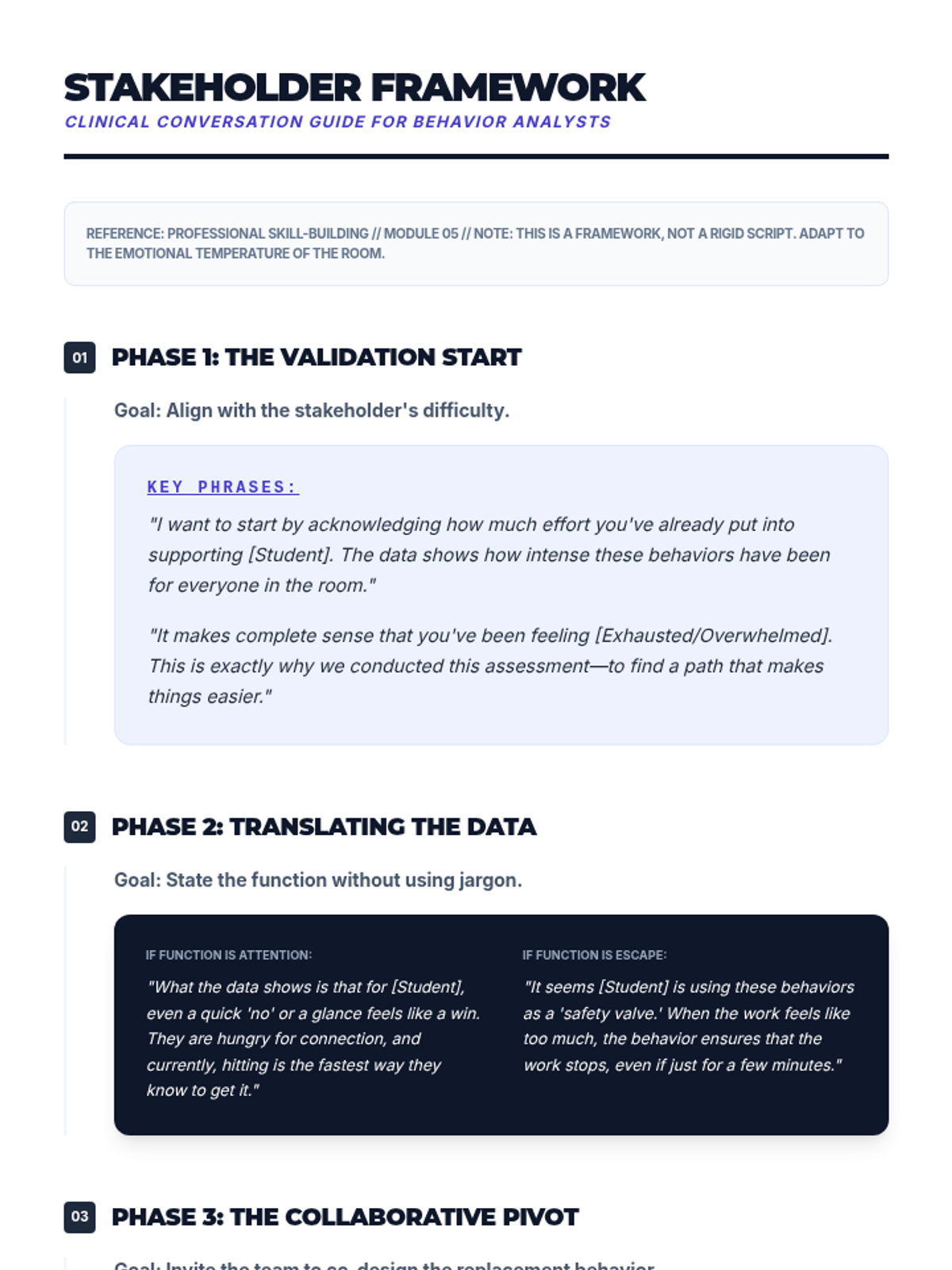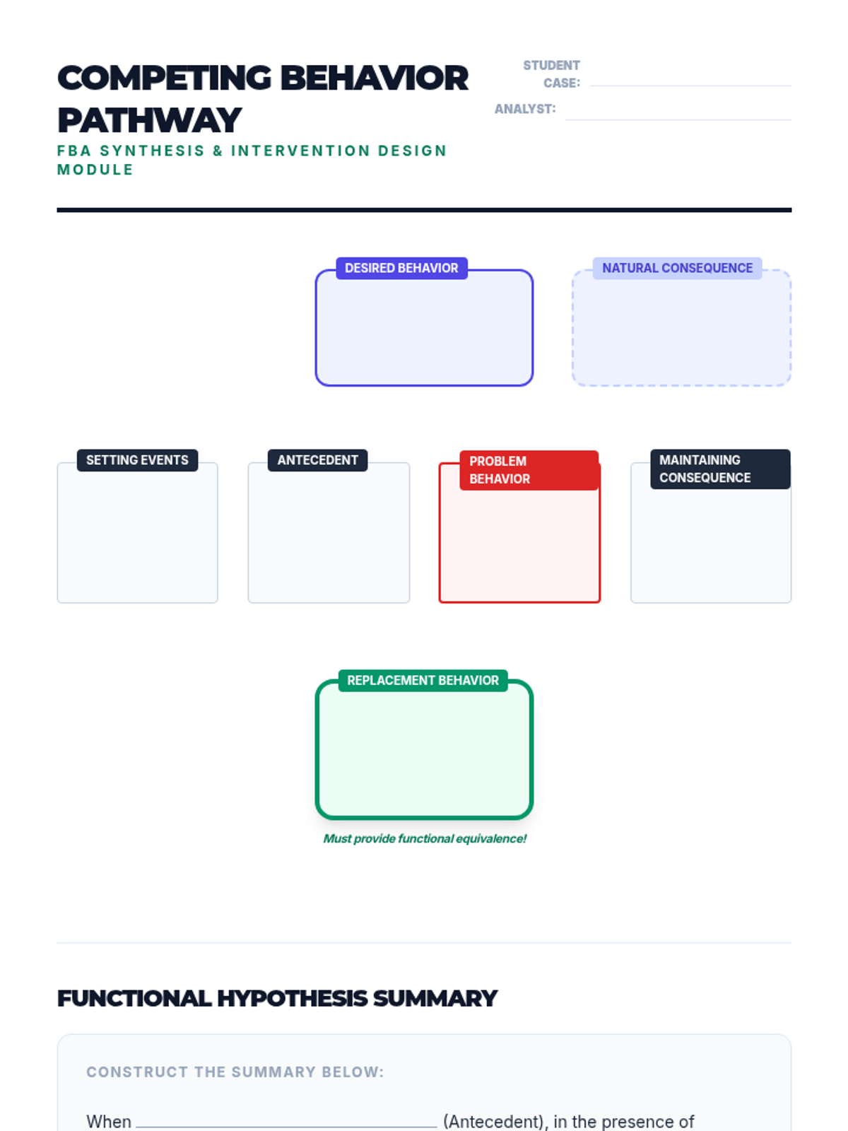 A graduate-level sequence focused on the synthesis of behavioral data into a comprehensive and legally defensible Functional Behavior Assessment (FBA) report. Students progress from record review to formal presentation of findings.