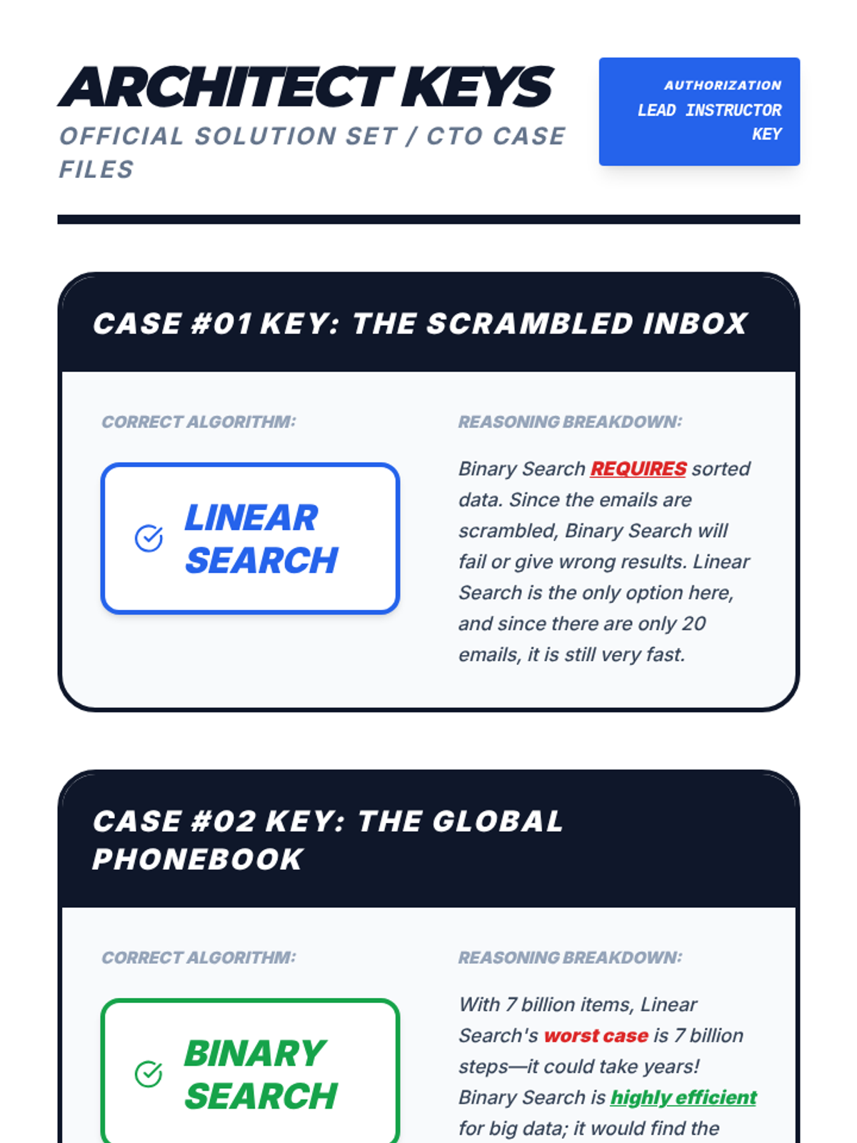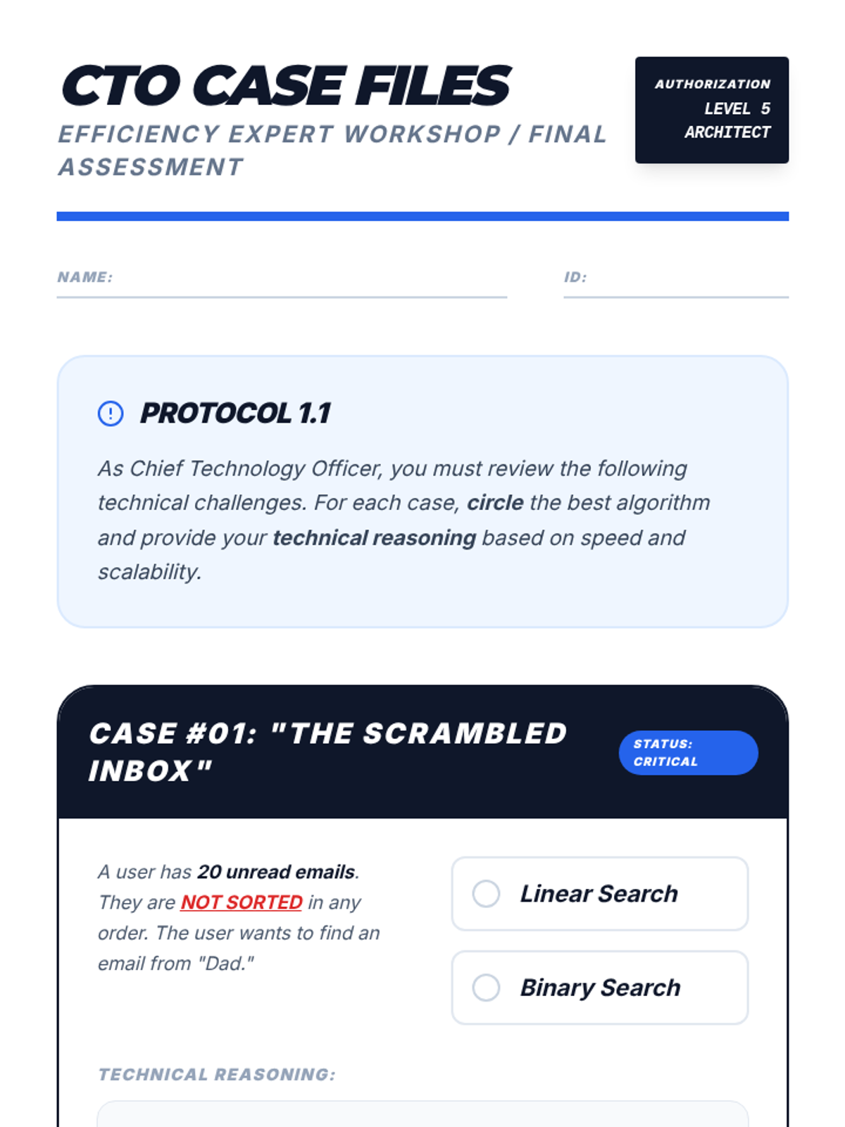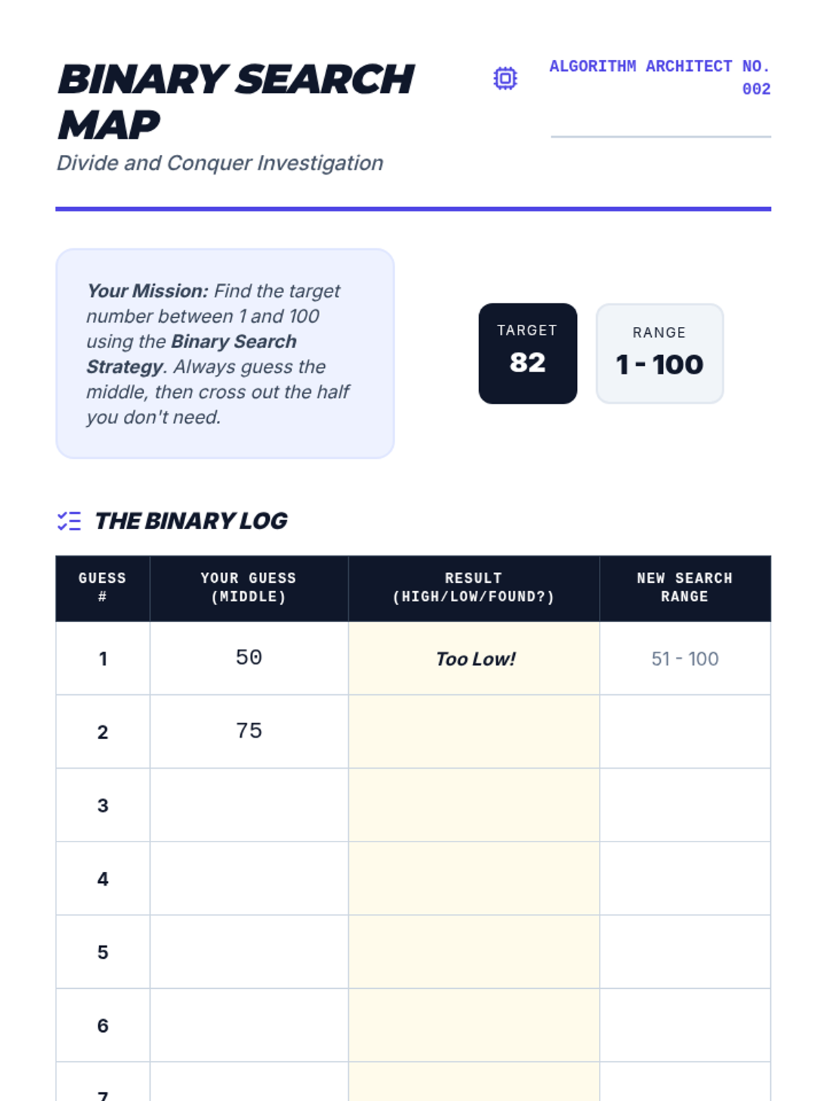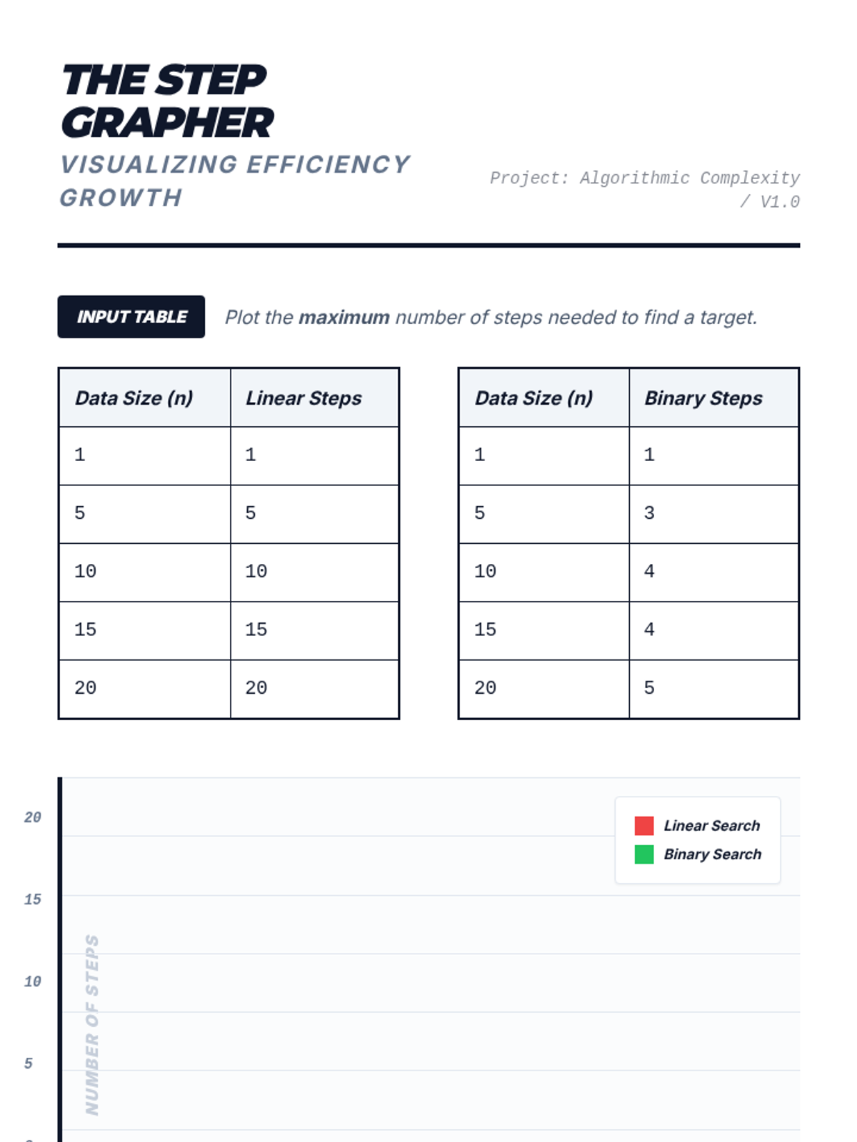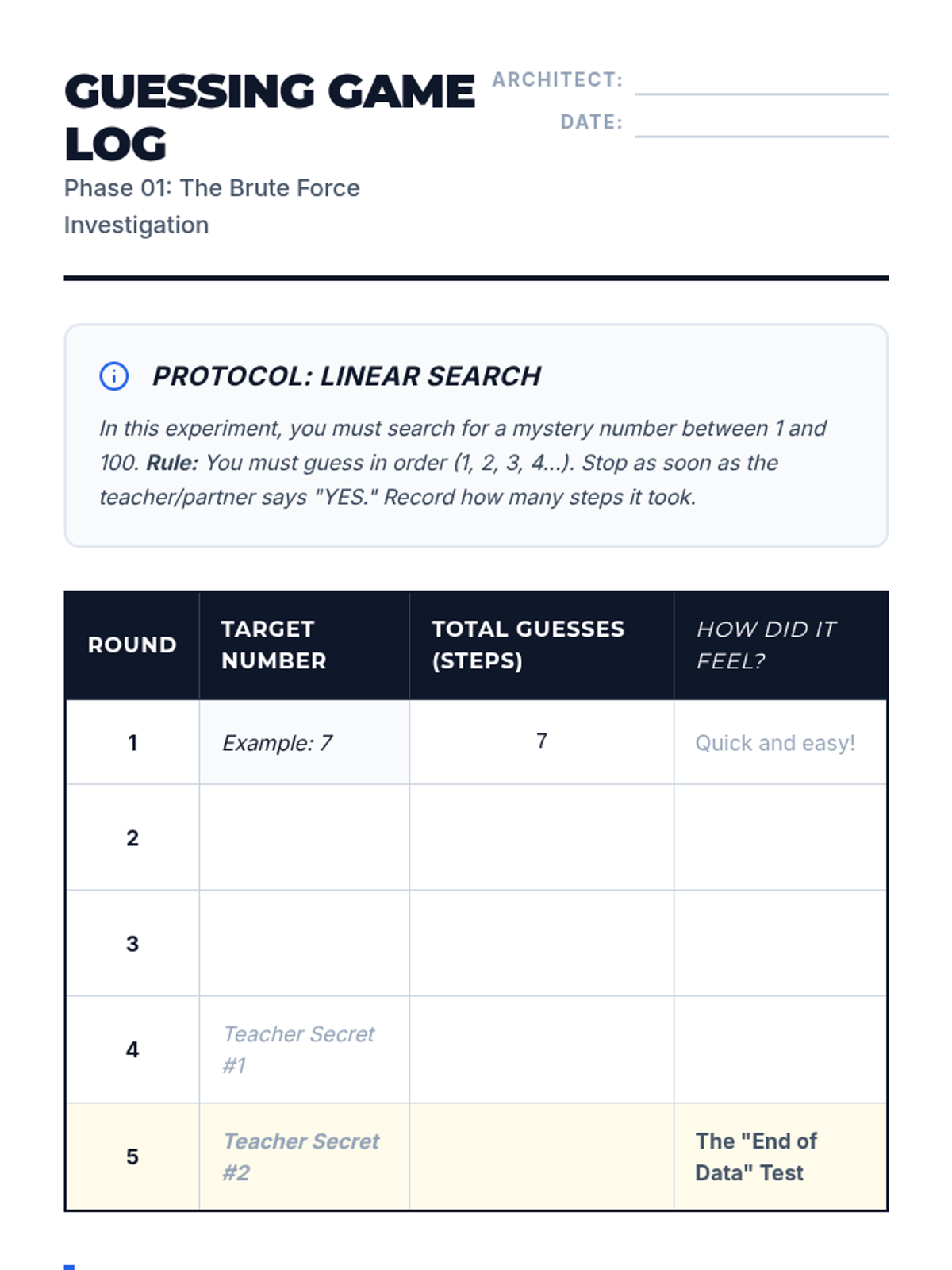 A 5th-grade sequence exploring computational efficiency through search strategies and algorithmic complexity. Students transition from linear to binary search, analyze performance growth, and evaluate algorithms based on best- and worst-case scenarios.