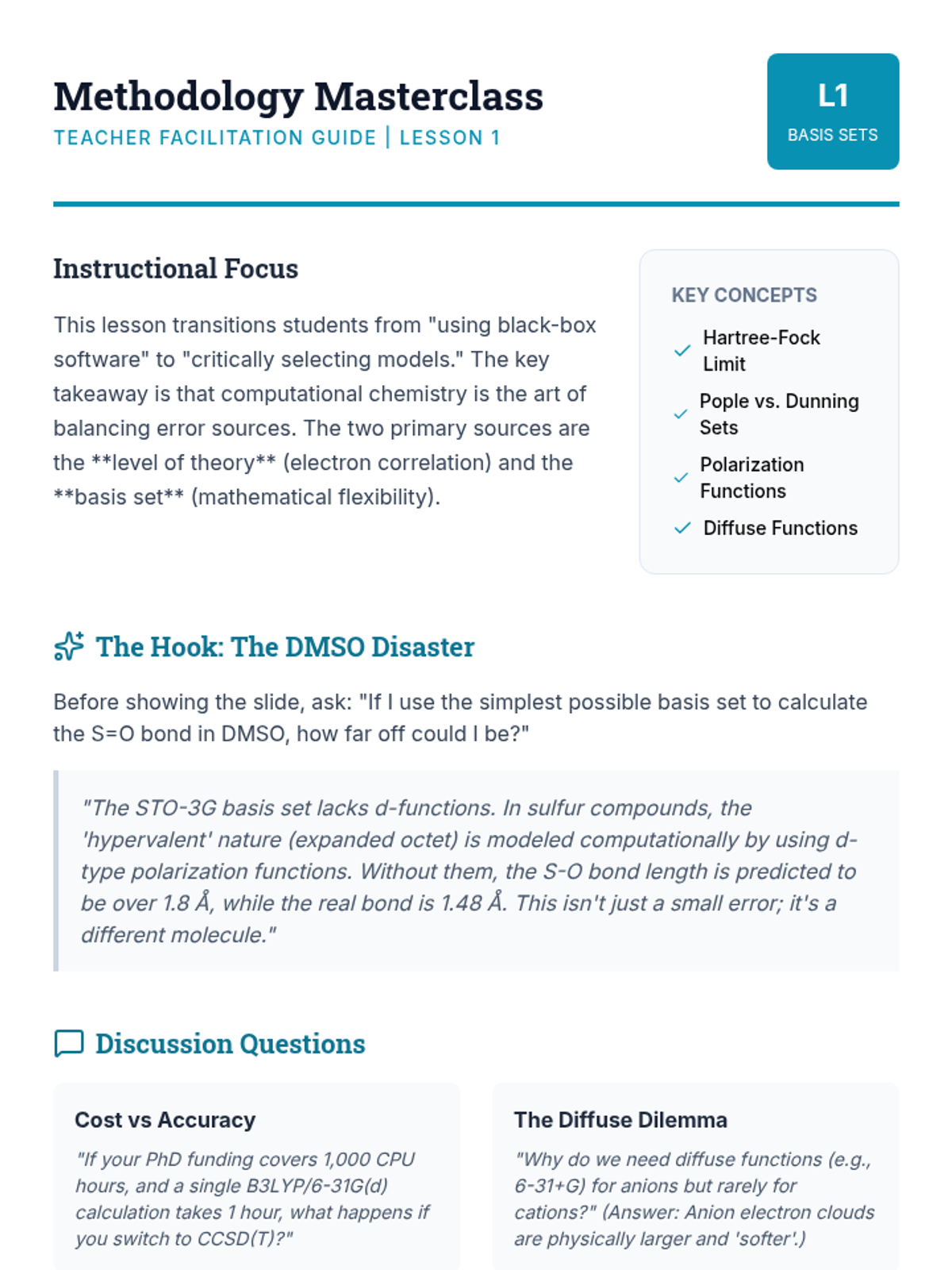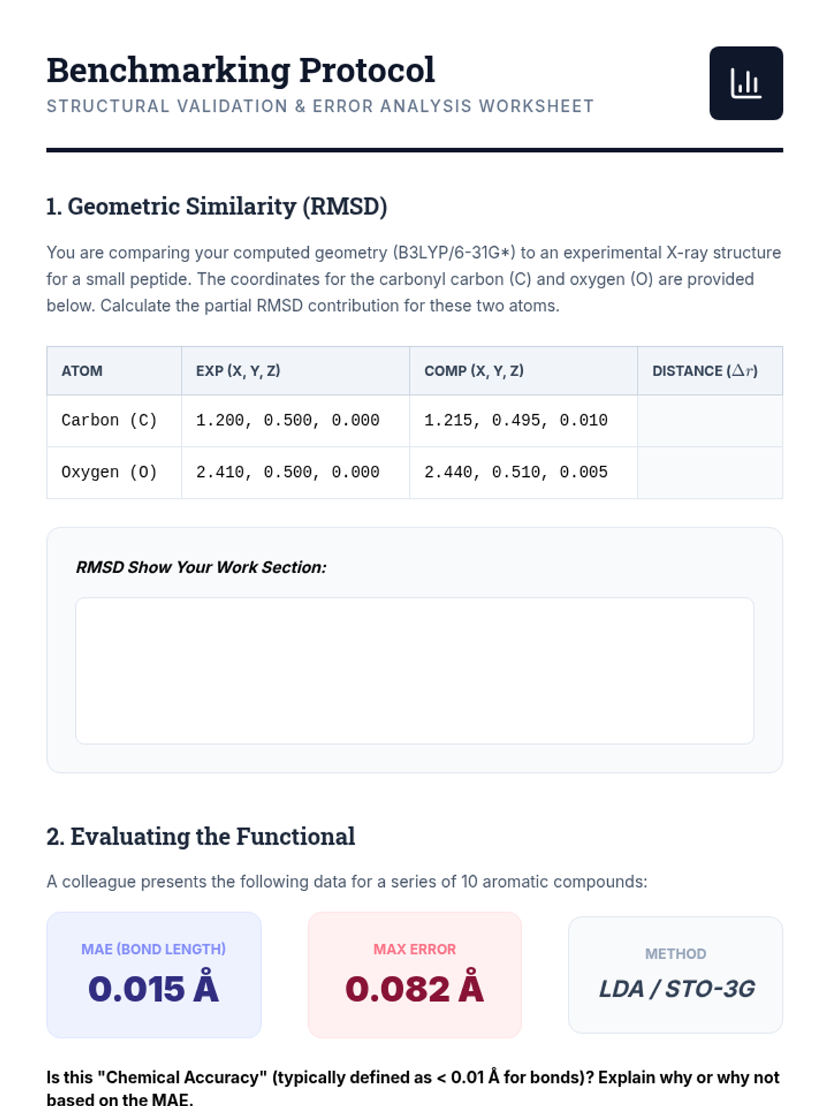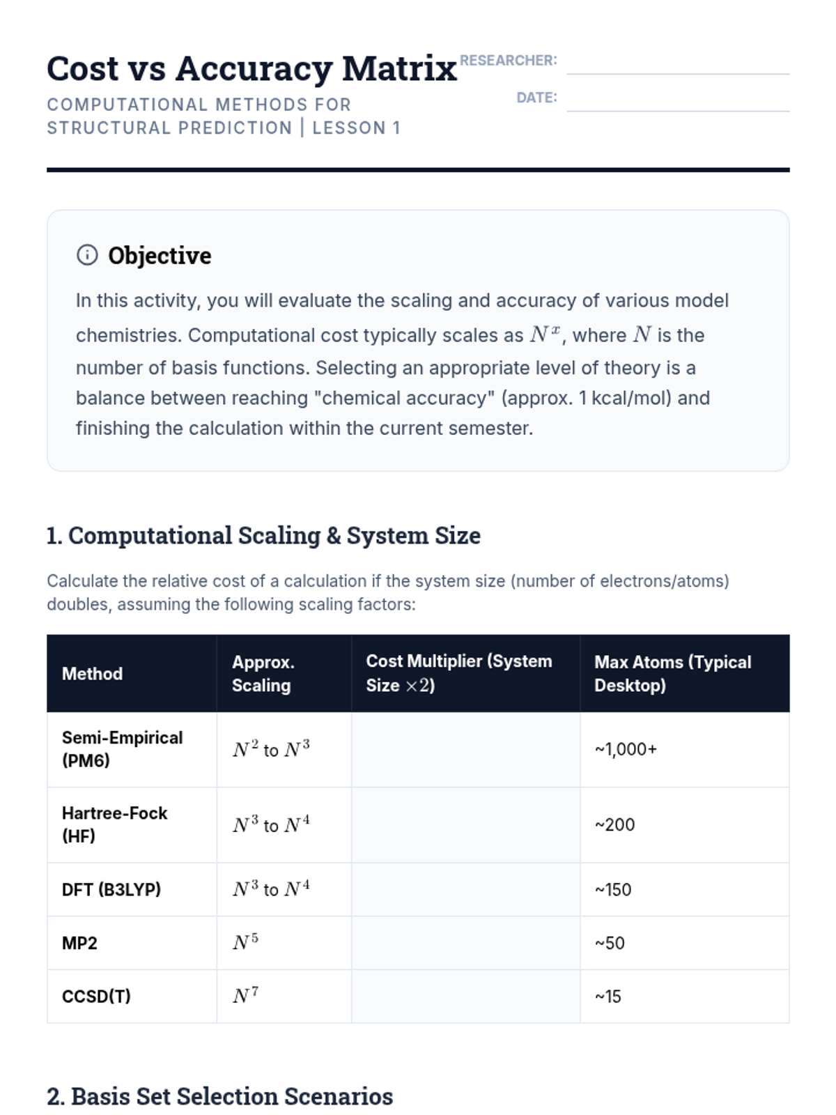 A graduate-level sequence focused on the practical application of quantum mechanical methods to predict molecular geometry and properties, from basis set selection to benchmarking against experimental data.
