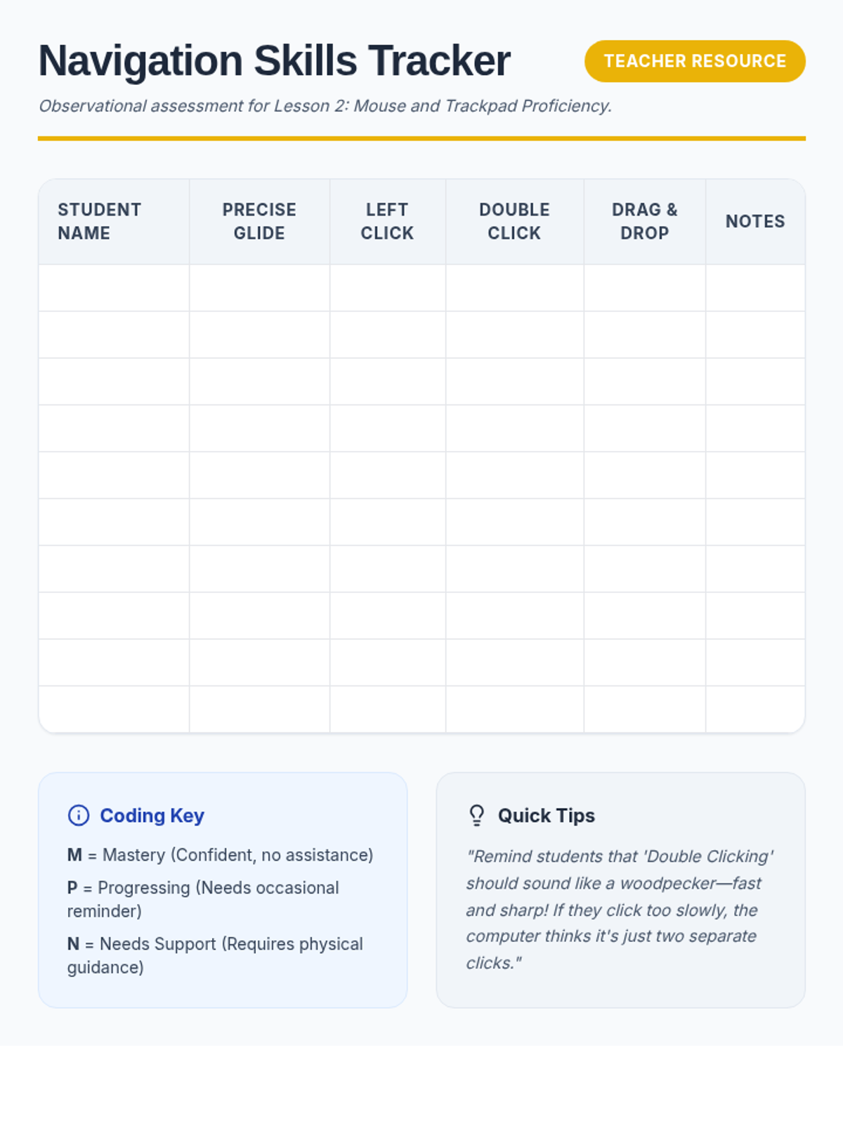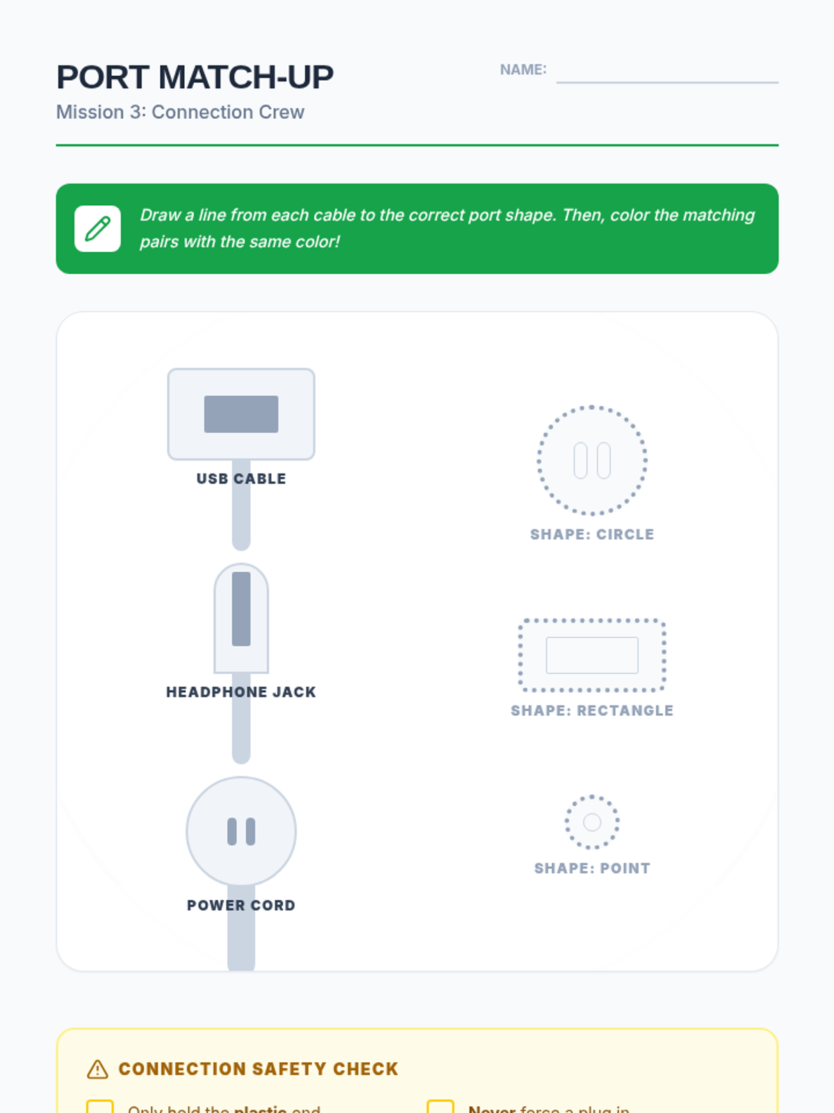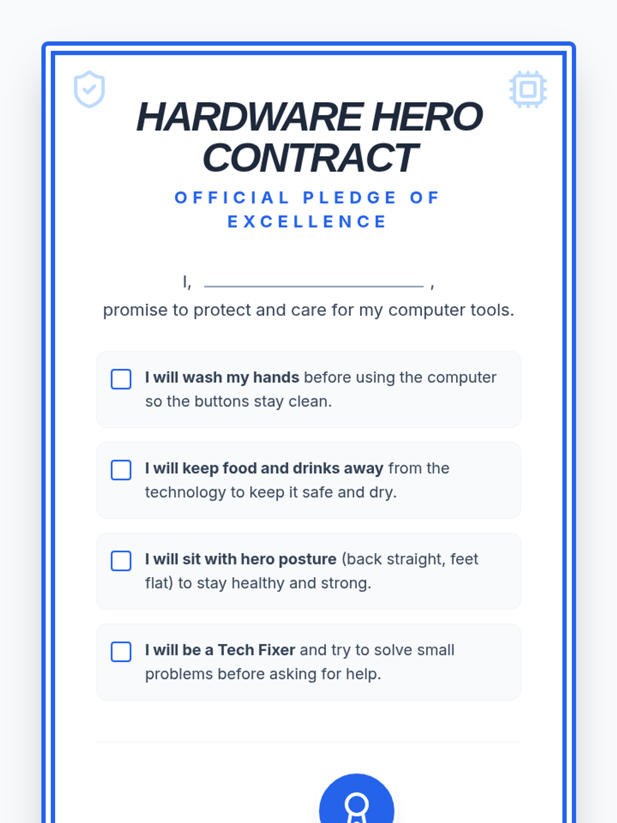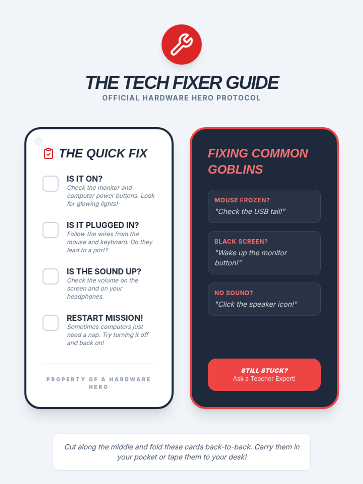 A 5-lesson sequence for 2nd-grade students to master computer hardware components, basic navigation, physical connections, and essential troubleshooting skills. Students transition from being passive users to empowered 'Hardware Heroes' who can maintain and fix their own workstations.