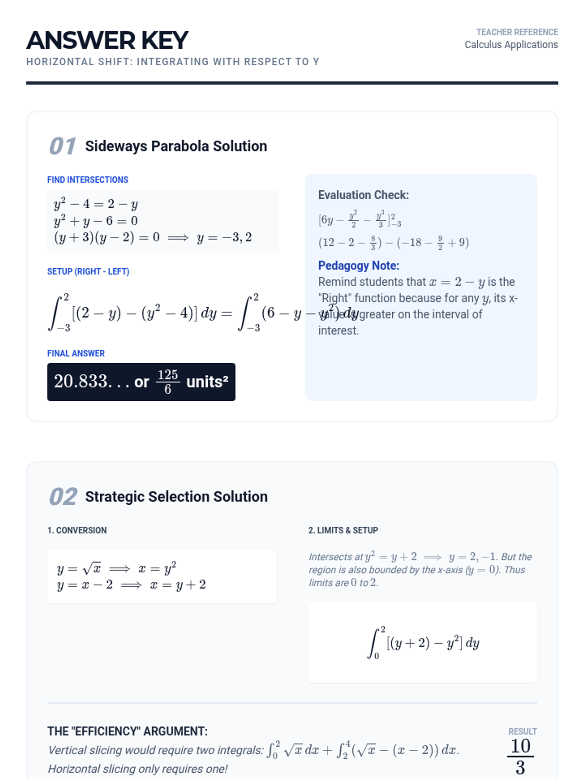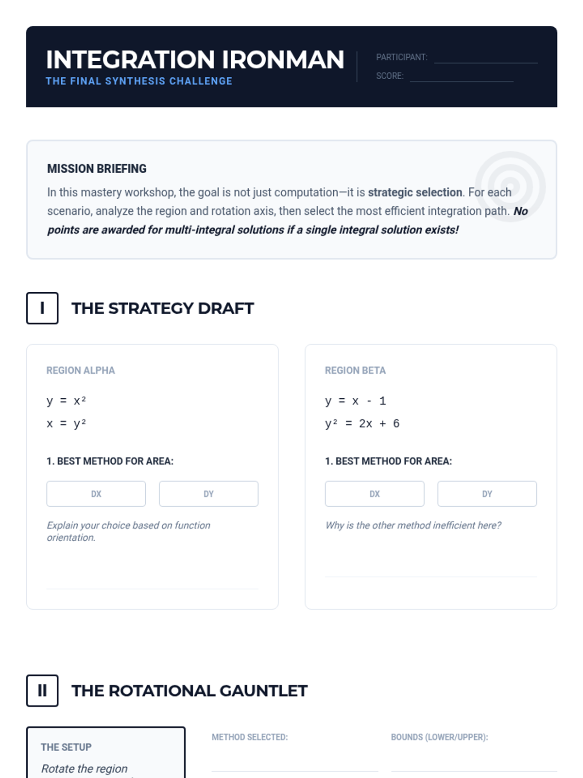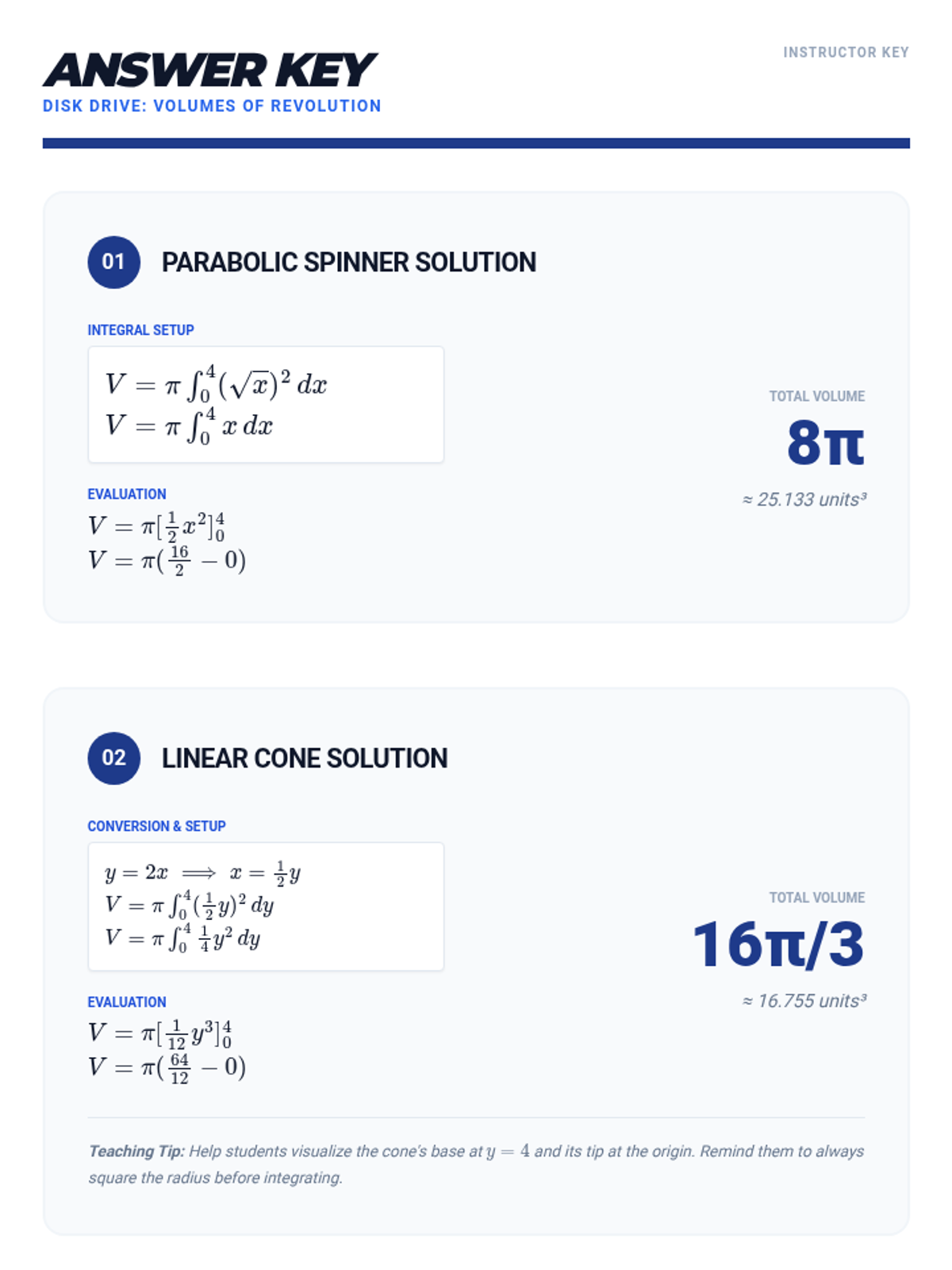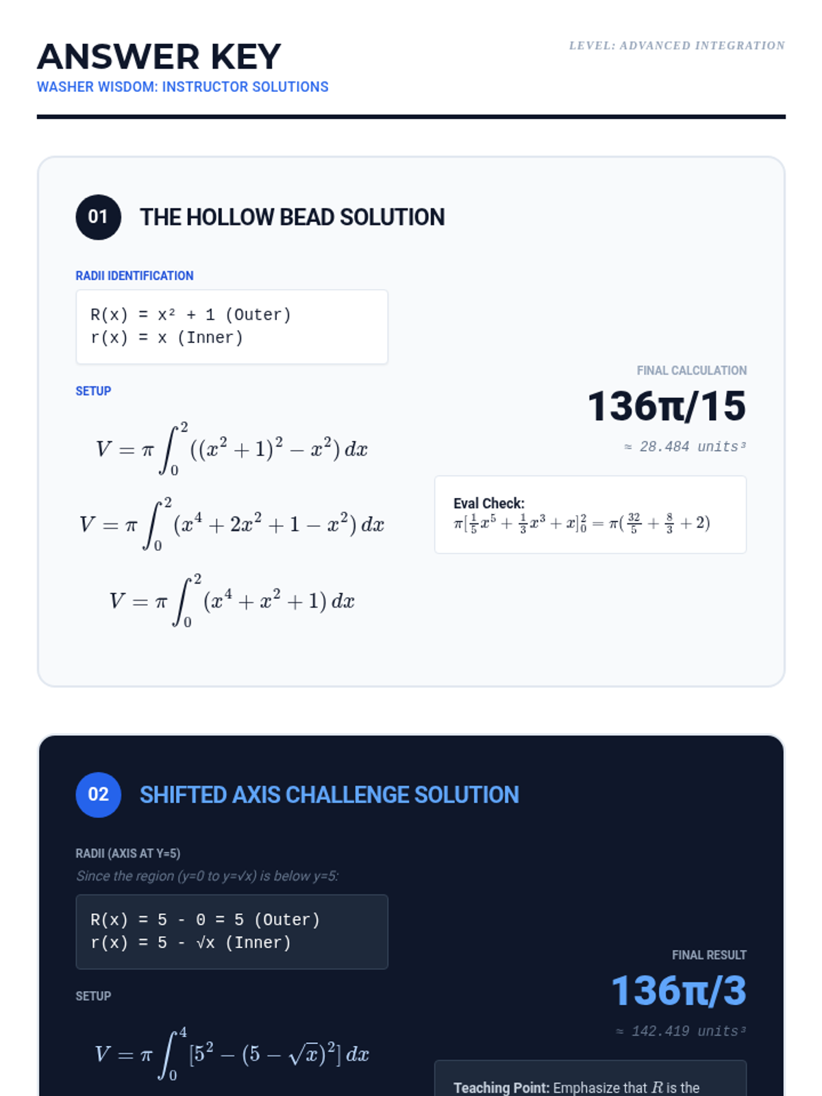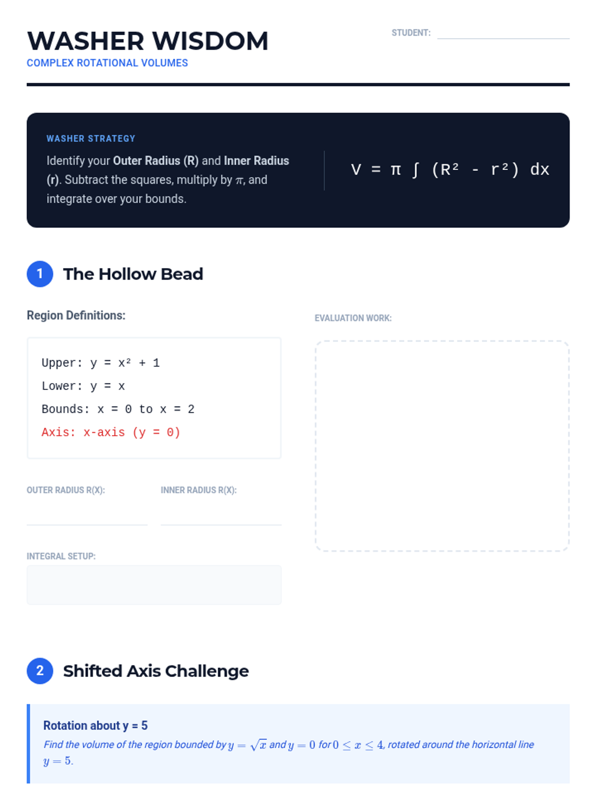 This sequence guides 11th-grade students through the transition from 2D area calculations to 3D volume determinations using integral calculus. Students will master vertical and horizontal slicing techniques for area, and progress to the Disk and Washer methods for rotational volumes.