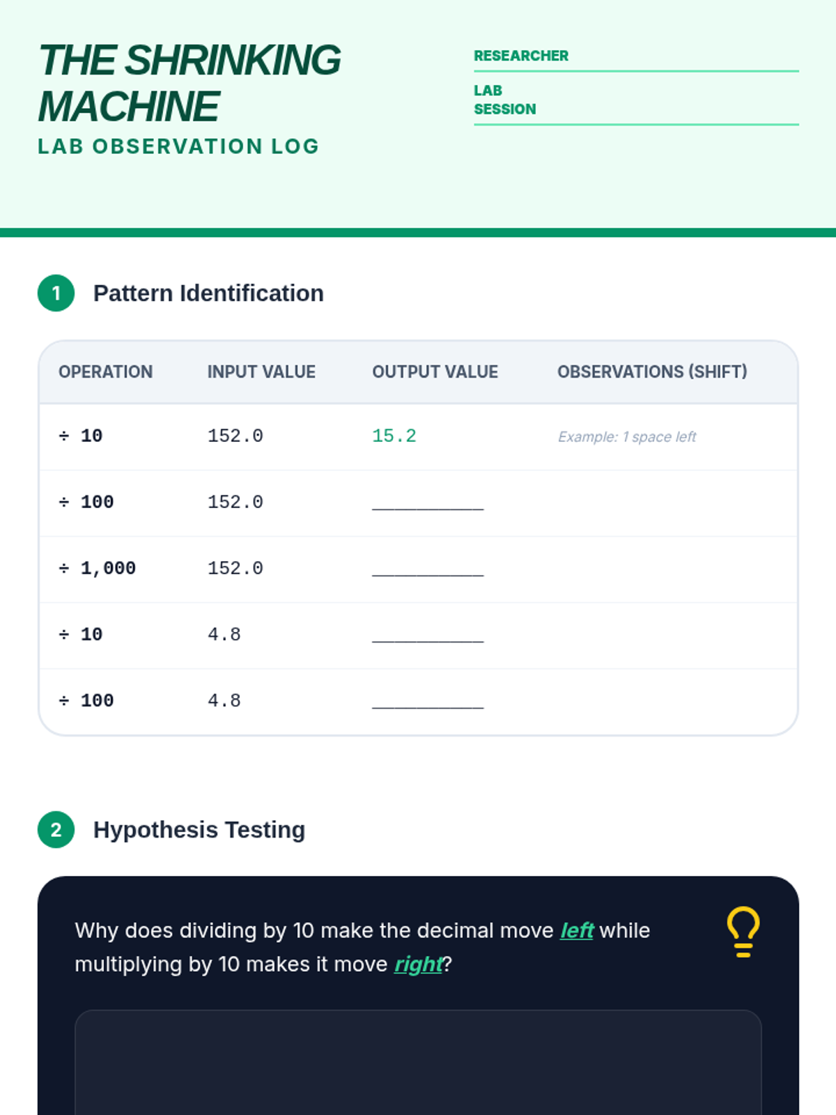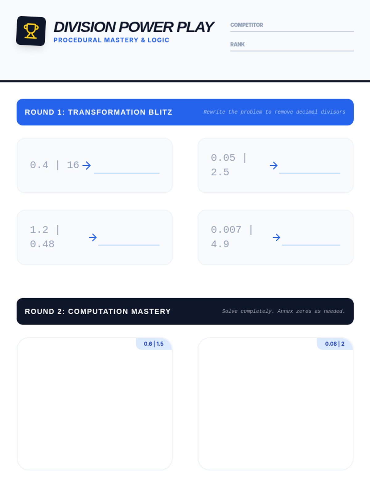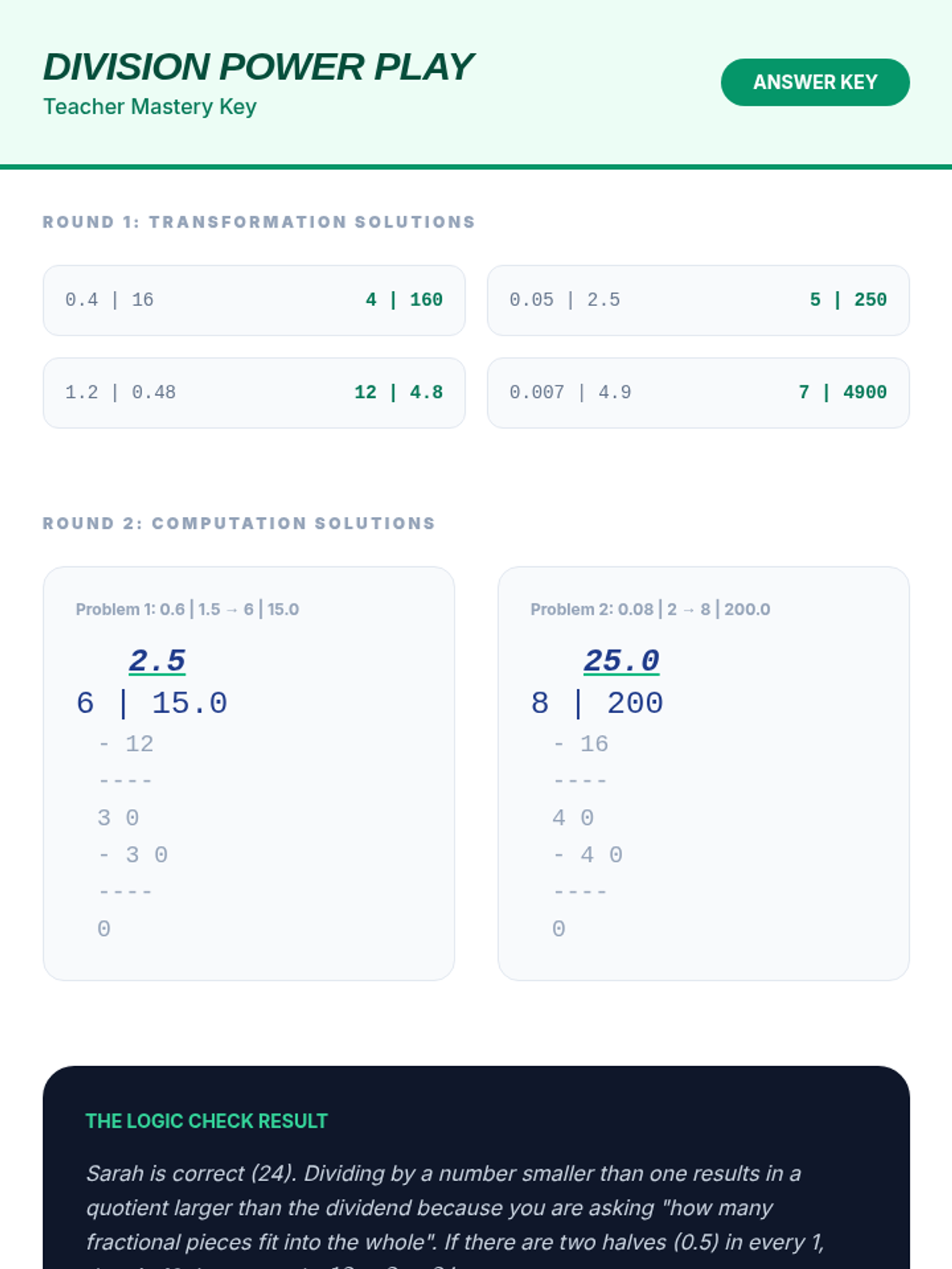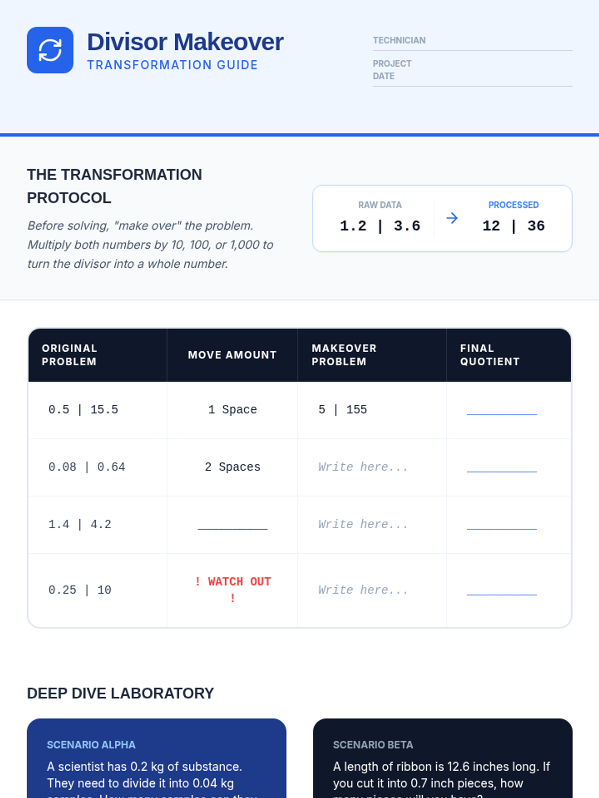A comprehensive 5th-grade unit on dividing decimals, moving from whole number divisors to decimal divisors using powers of ten and equivalent ratios. Students apply these skills to financial situations, metric patterns, and scientific data analysis.