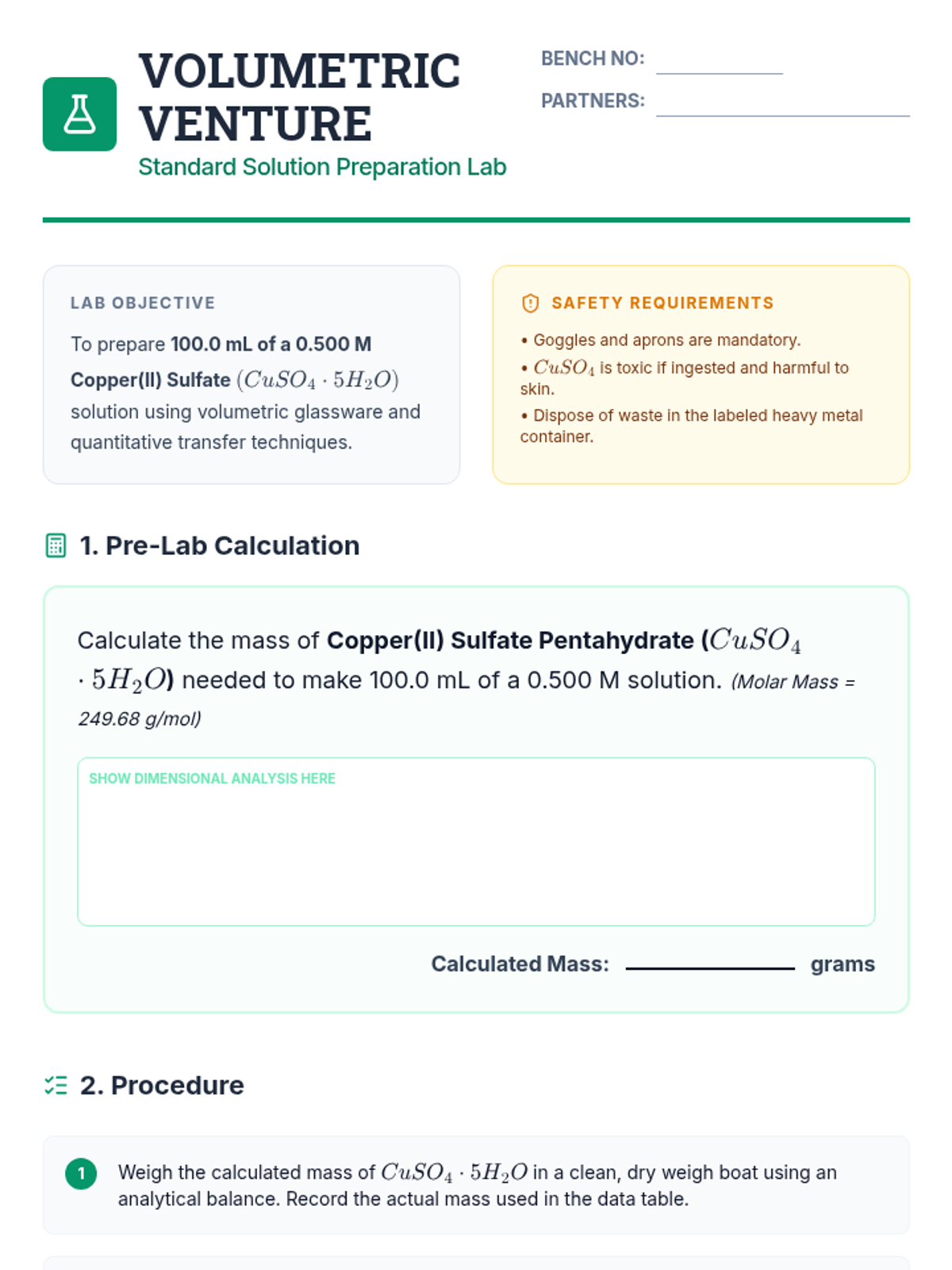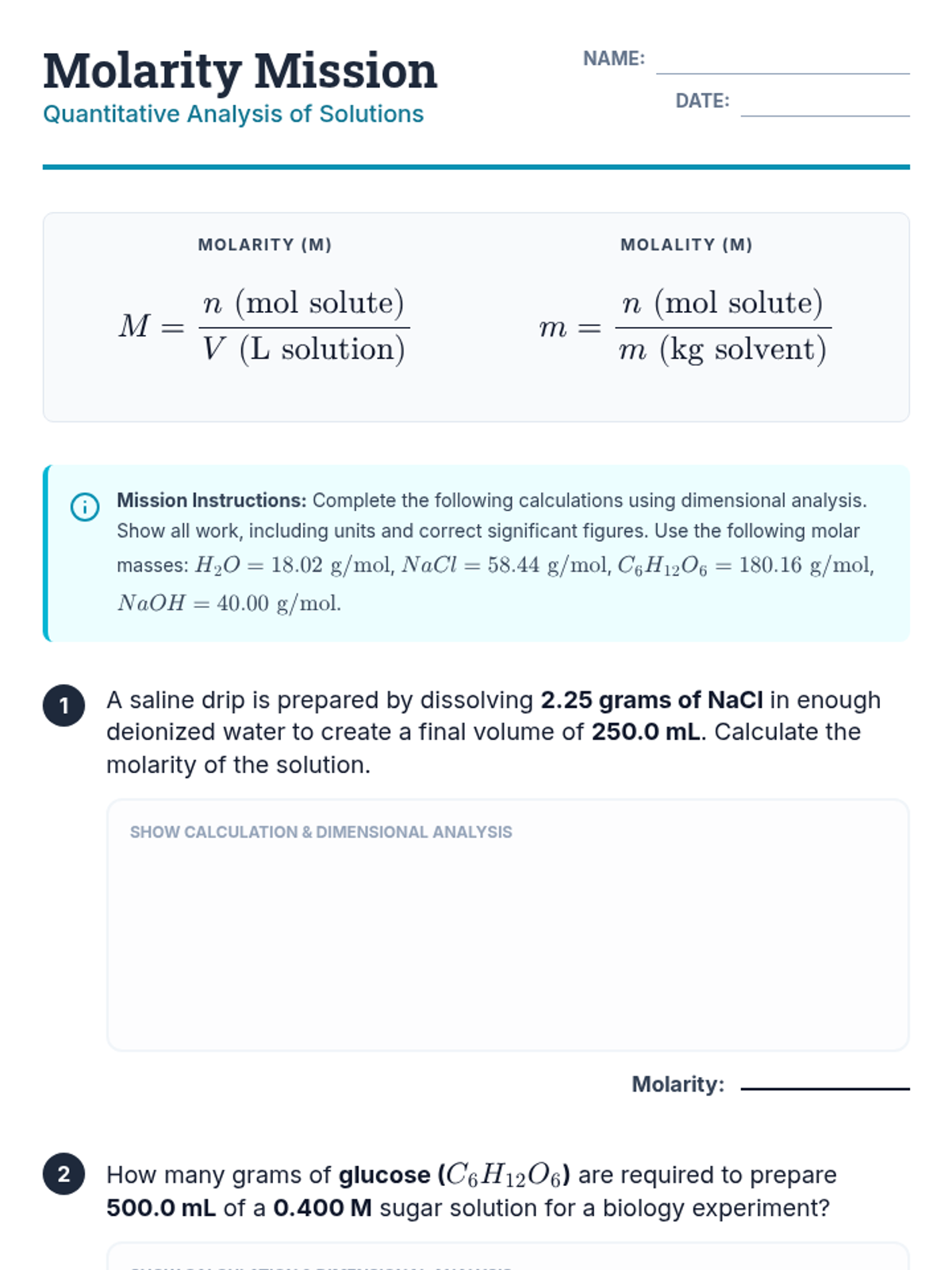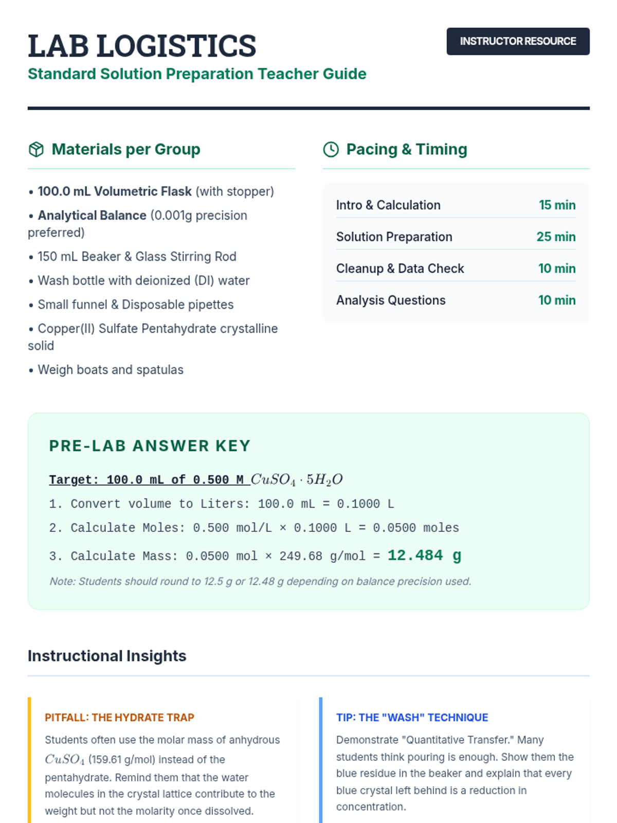 This sequence guides students through the quantitative analysis of solutions, from basic molarity calculations to advanced spectrophotometry using Beer's Law. It balances theoretical mastery with hands-on laboratory precision.