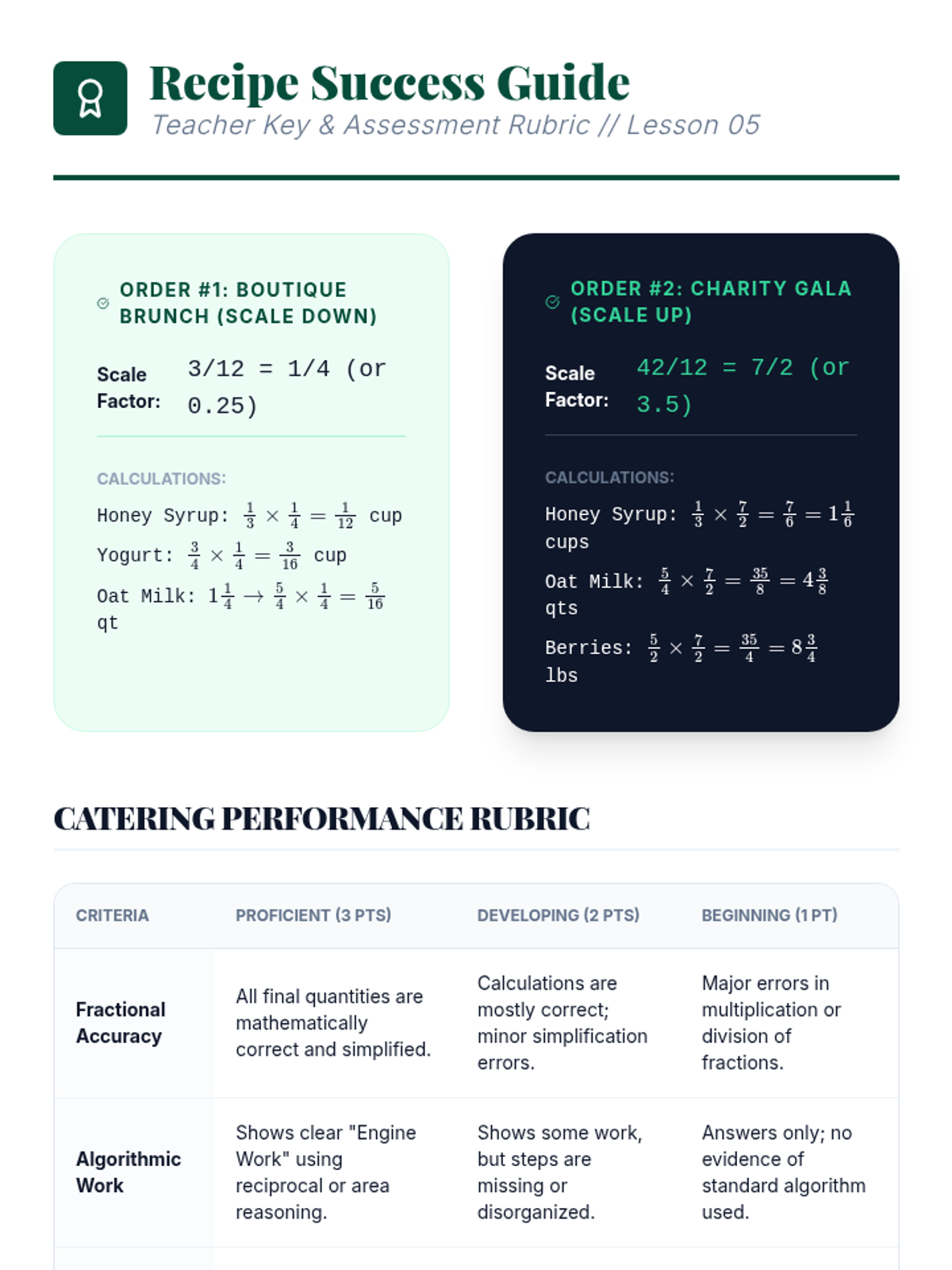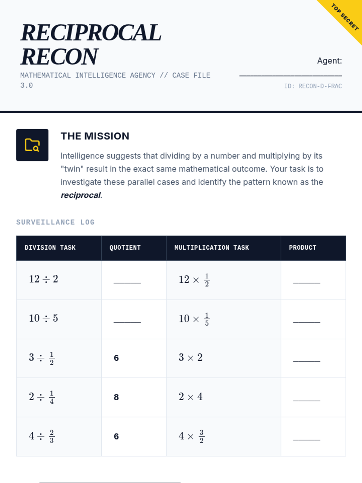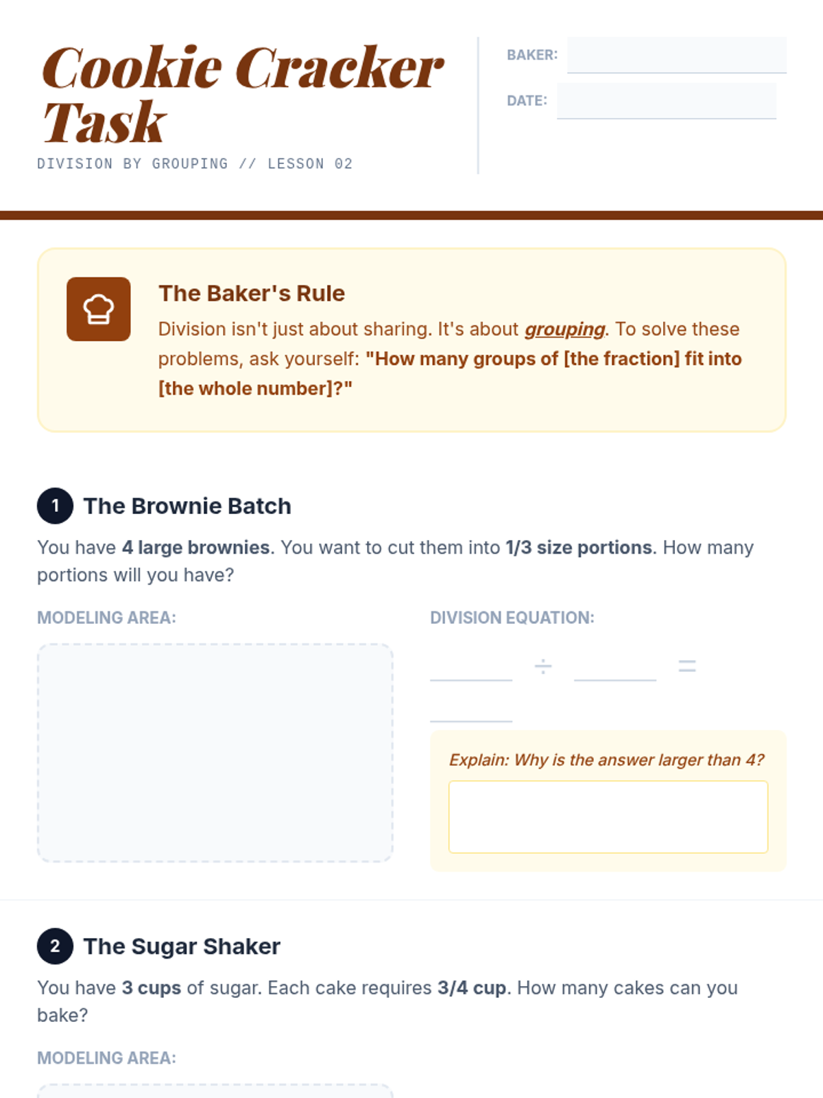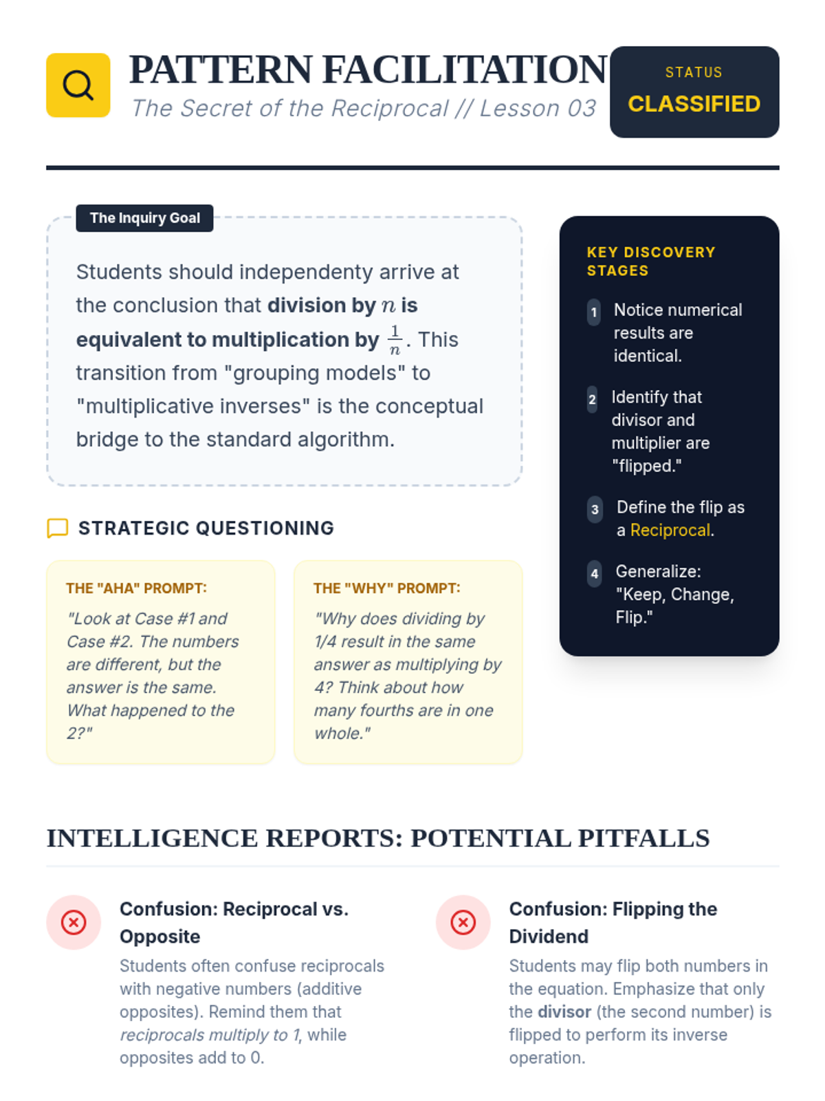 This inquiry-based sequence focuses on the conceptual foundations of dividing fractions. Students move from visual area models to the discovery of the reciprocal algorithm, ensuring they understand 'why' before they focus on 'how'.