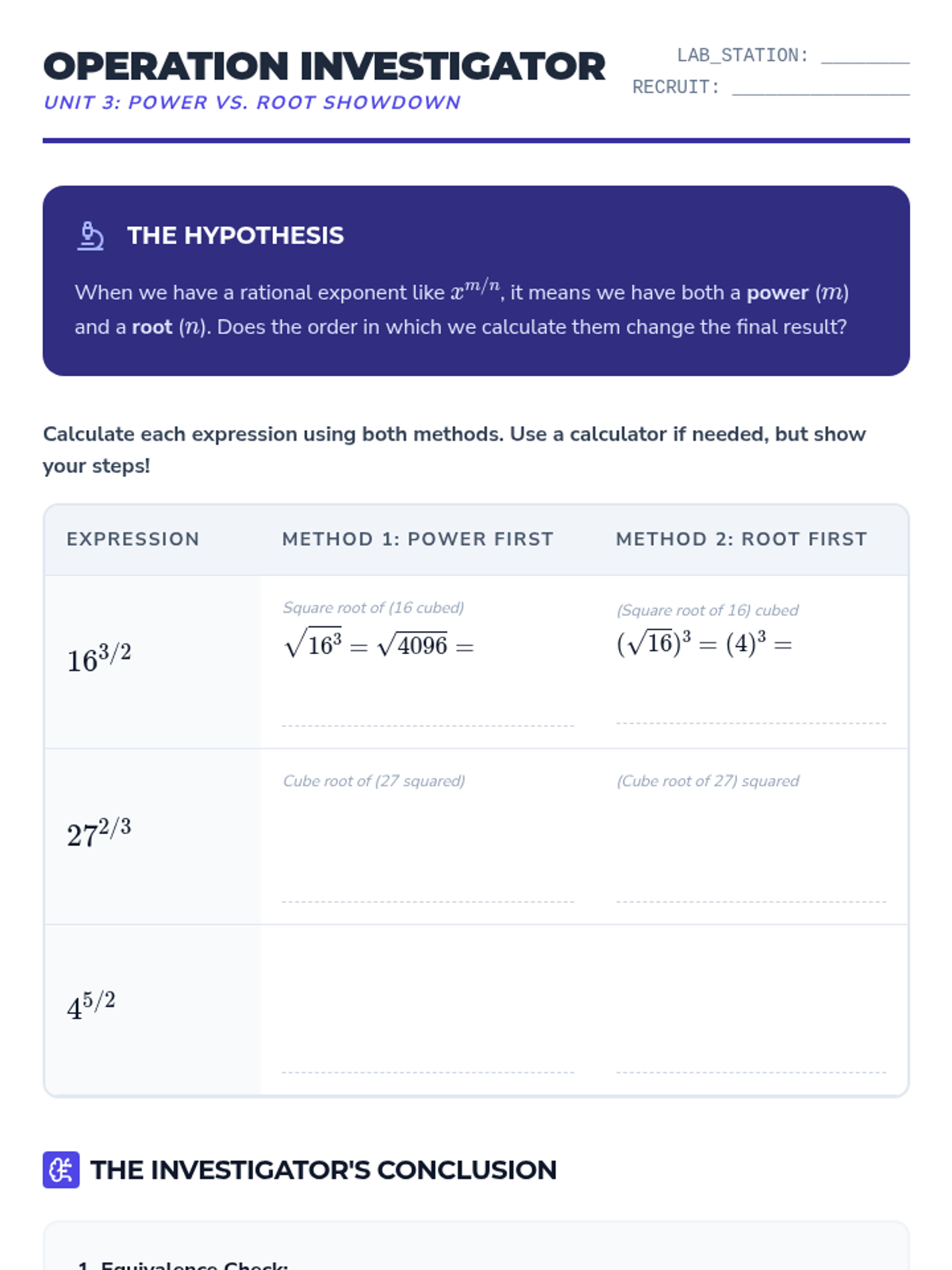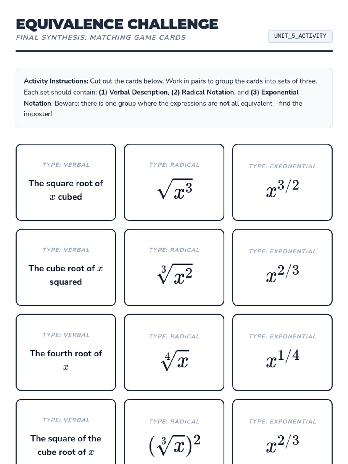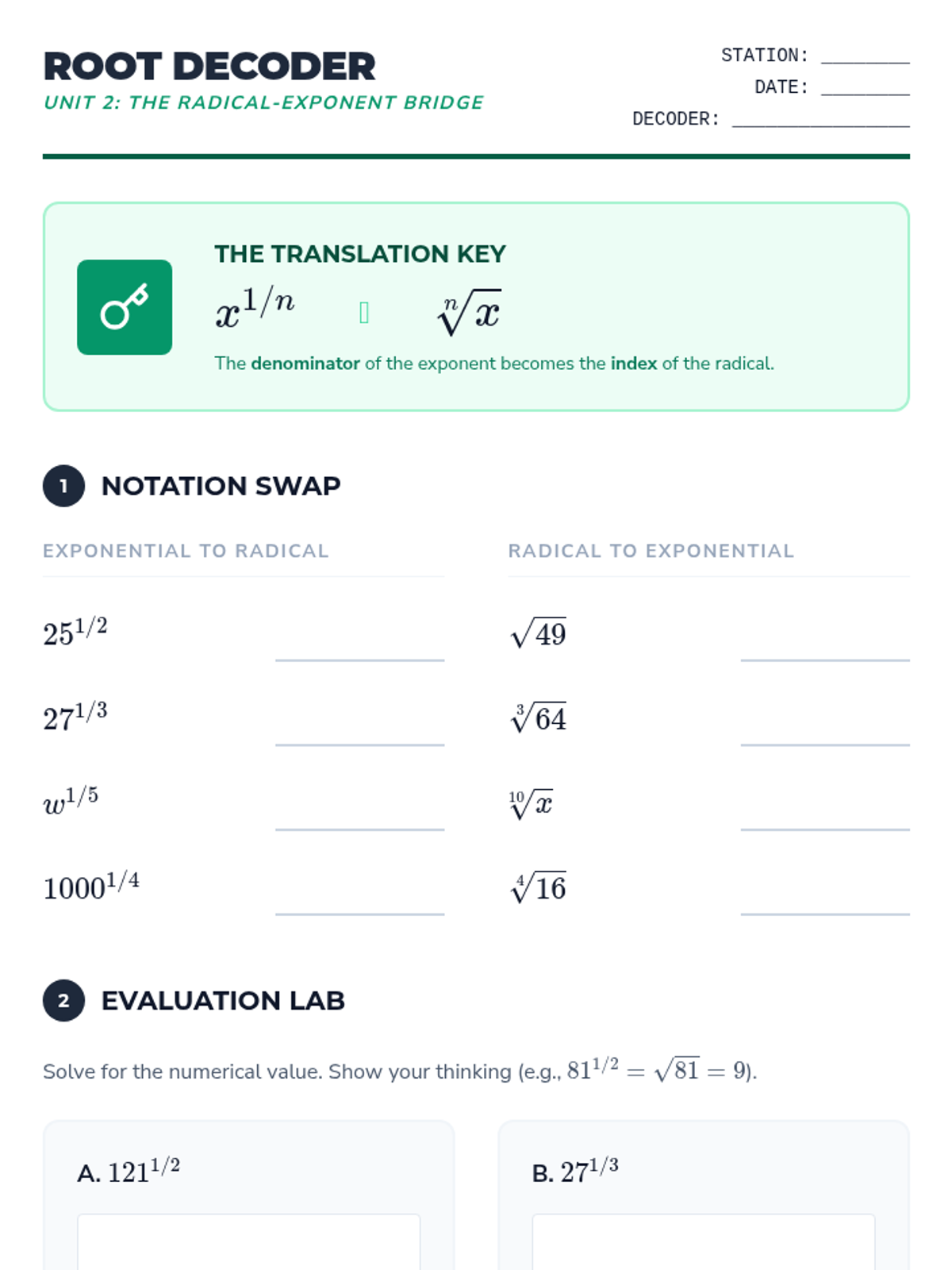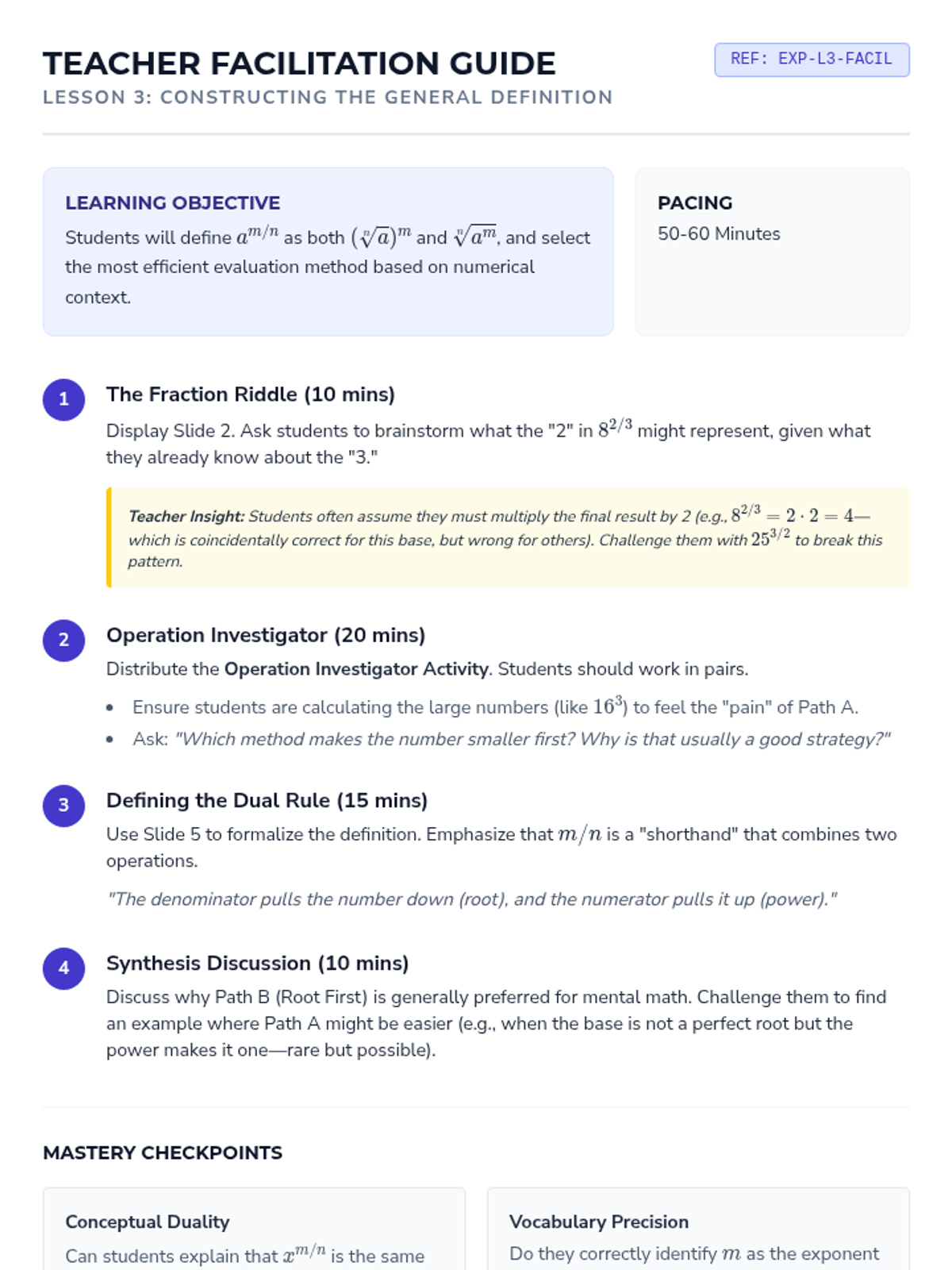 A 5-lesson inquiry-based unit that guides 9th-grade algebra students from recognizing integer exponent patterns to fluently translating between radical and rational exponent notation. students will discover the conceptual meaning of fractional exponents through investigative tasks and symbolic manipulation.